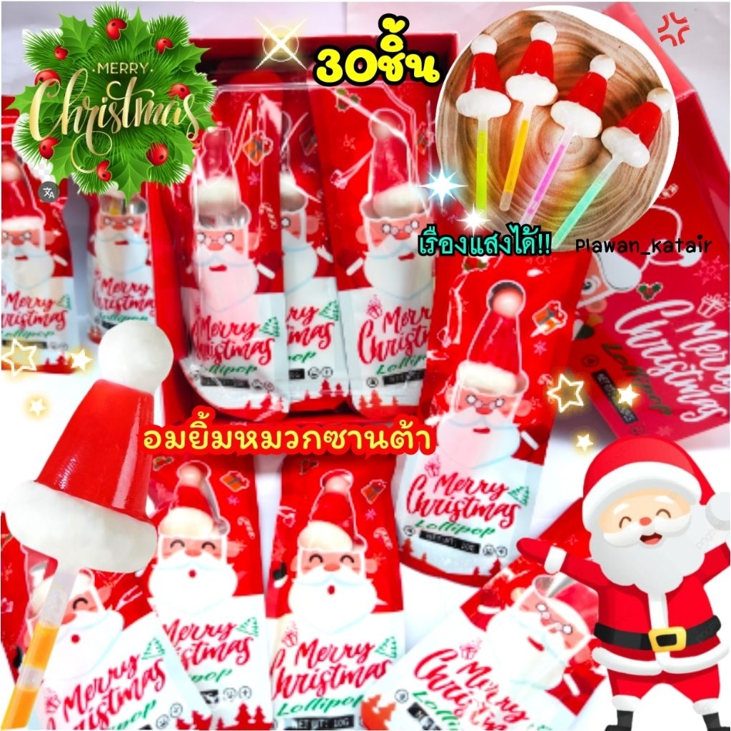 ?30ชิ้น?ลูกอม อมยิ้มรูป ???หมวกซานต้า??? ก้านเรืองแสง ในเวลากลางคืน สนุก อร่อย