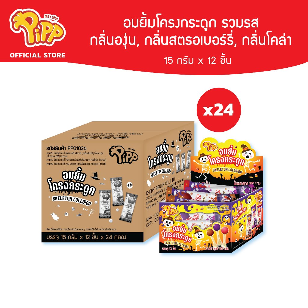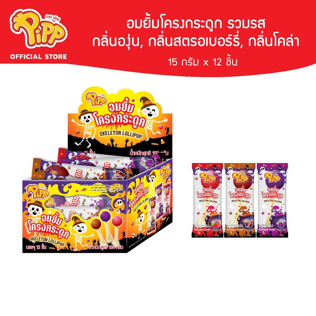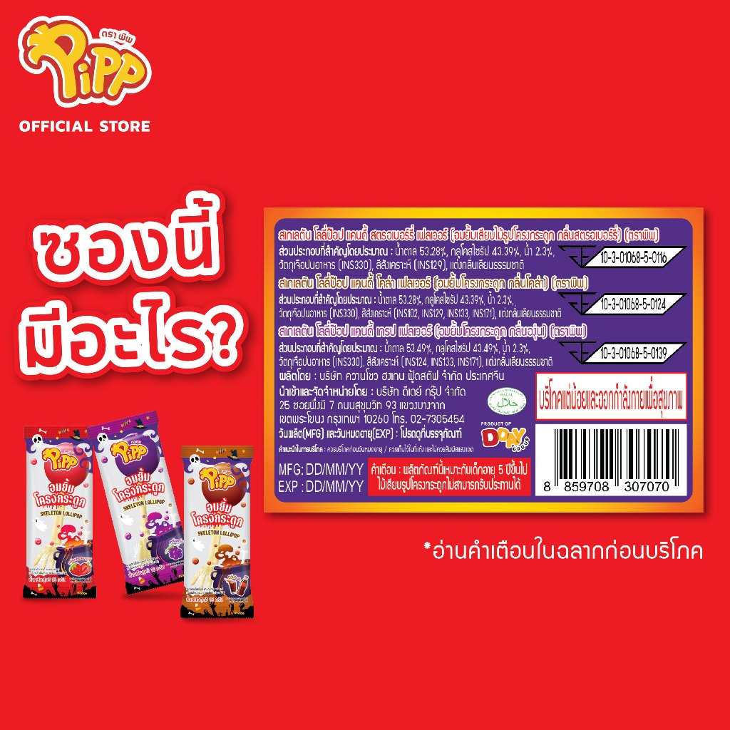 [ยกลัง][PP01026] Pipp SKELETON LOLLIPOP CANDY พิพ อมยิ้มโครงกระดูก กลิ่นองุ่น สตรอเบอร์รี่ และโคล่า 15ก x 12ชิ้น