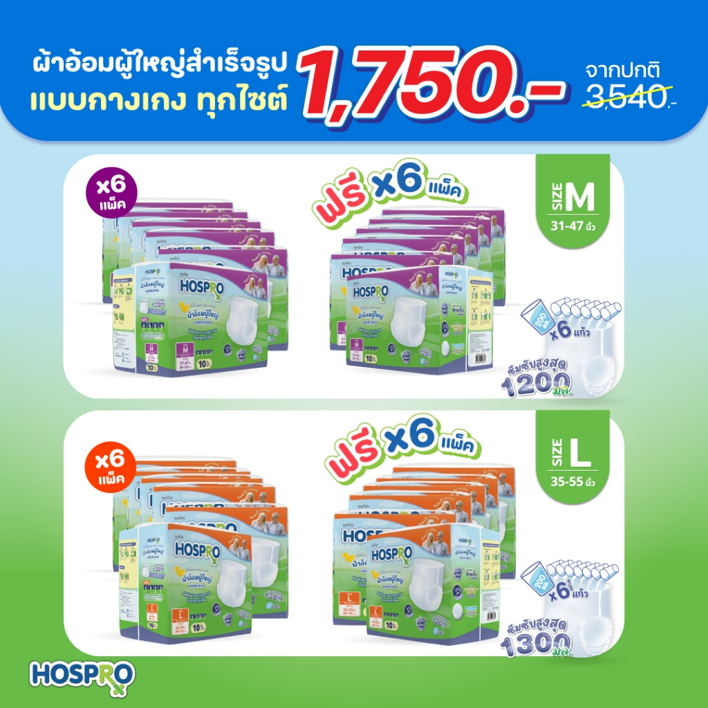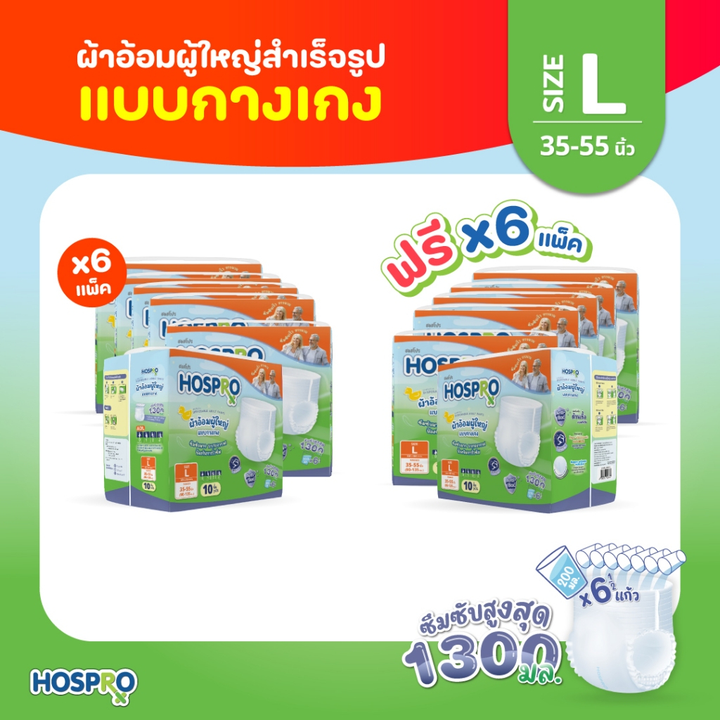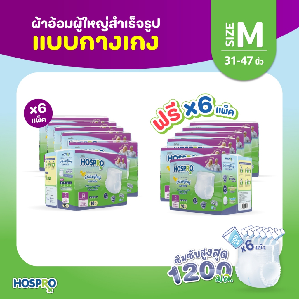 (ซื้อ 6 แถม 6) HOSPRO ผ้าอ้อมผู้ใหญ่ แบบกางเกง ซึมซับสบาย นุ่มสบาย ต้านเชื้อแบคทีเรีย ได้ 120 ชิ้น