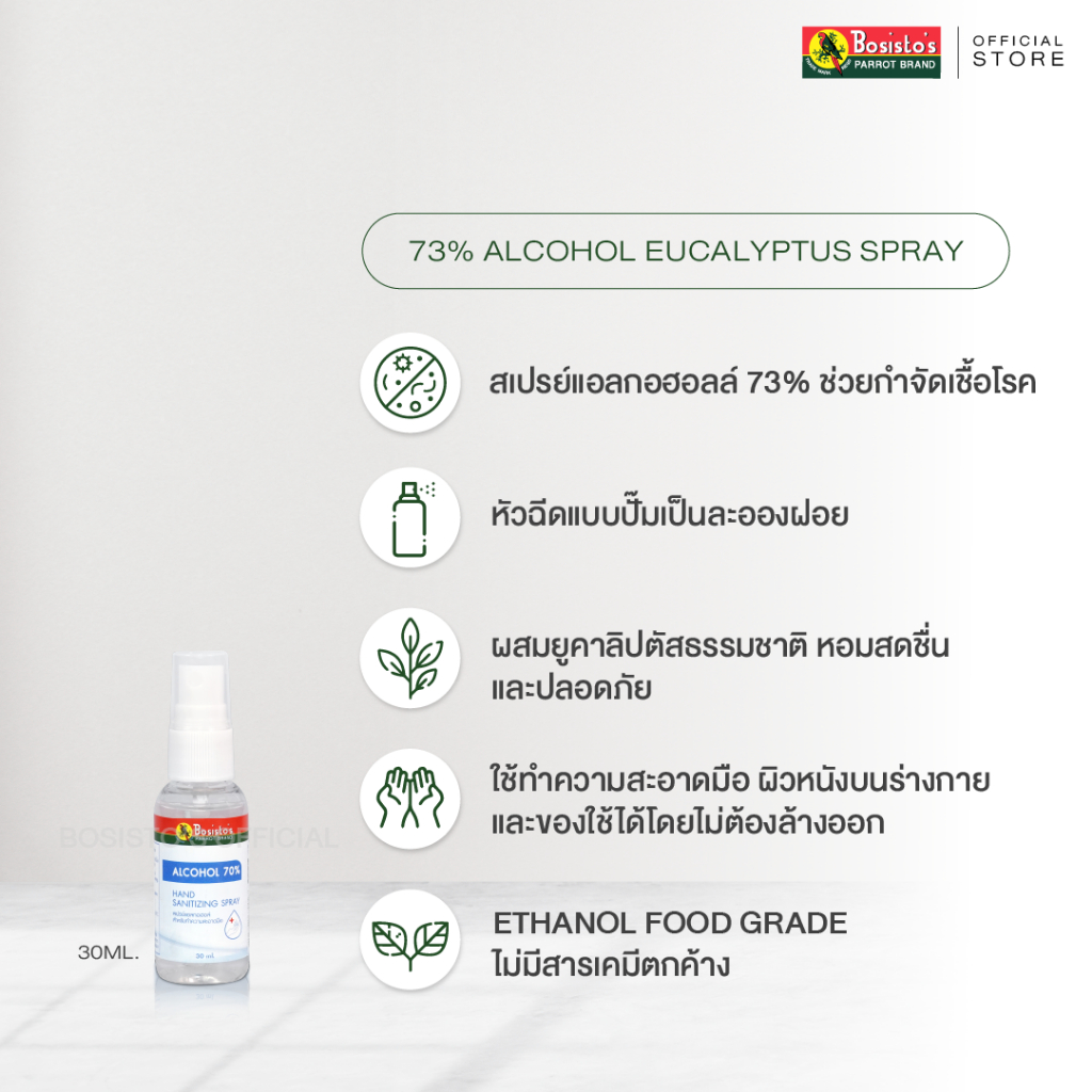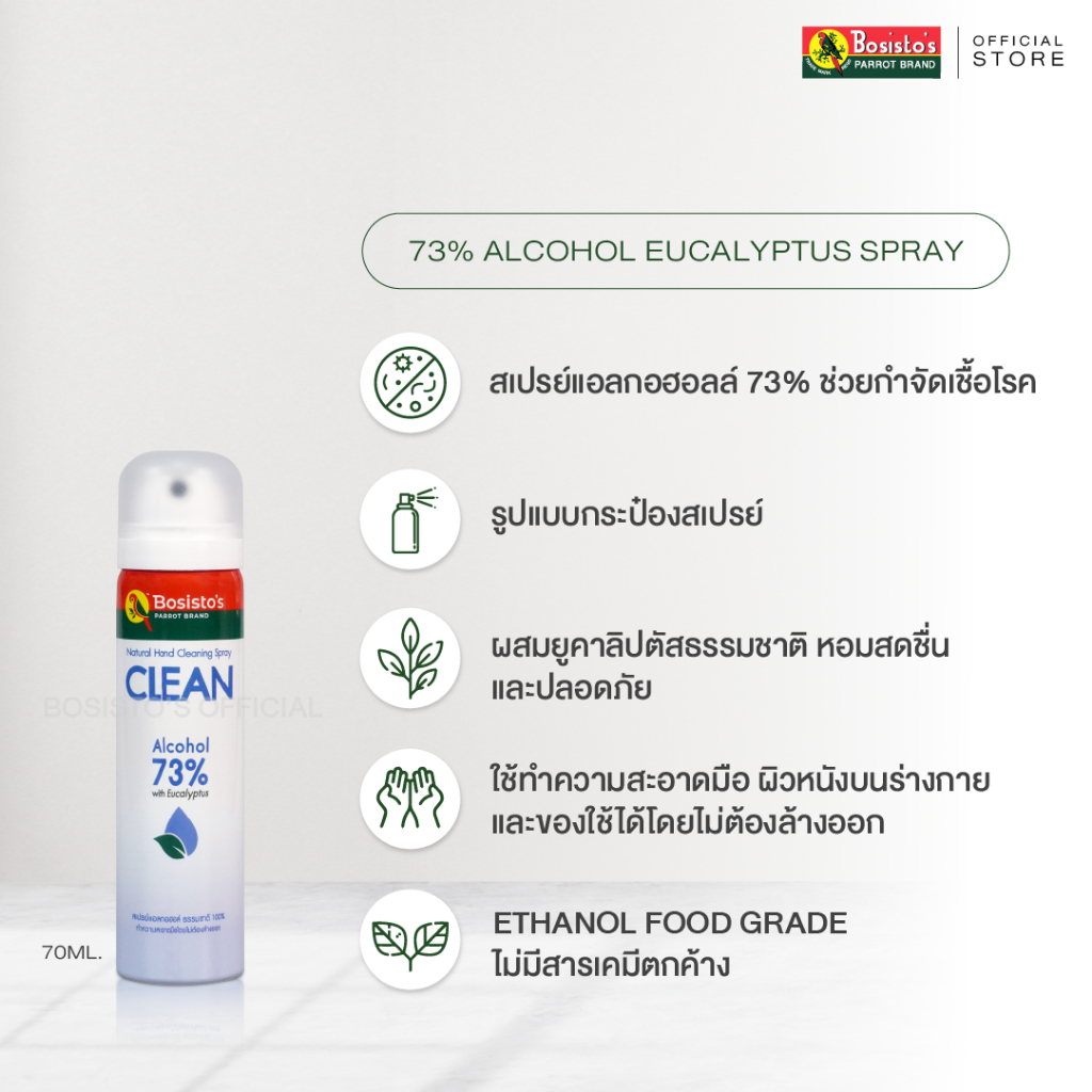 Bosisto ตรานกแก้ว สเปรย์แอลกอฮอล์ ผสมยูคาลิปตัส DUO ความสะอาด ยกกำลังสอง