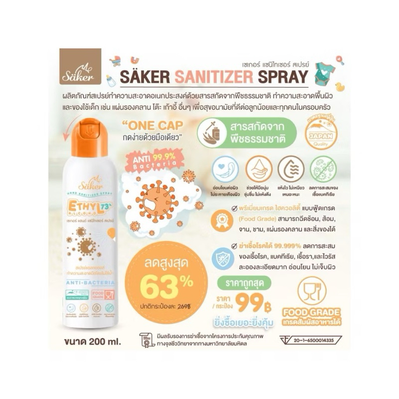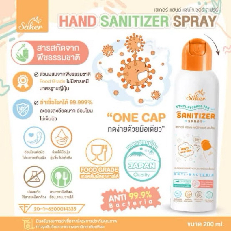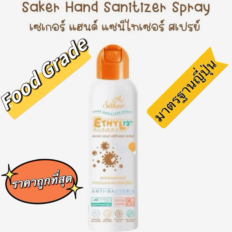 ?Saker สเปรย์แอลกอฮอล์จากพืชธรรมชาติ ฟู้ดเกรดทำความสะอาดมือ,ผิวหนัง,สิ่งของเกรดสัมผัสอาหารได้(มาตรฐานส่งออกญี่ปุ่น)?