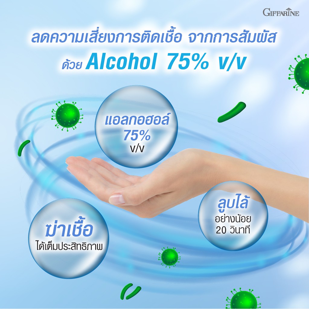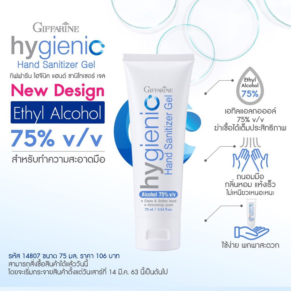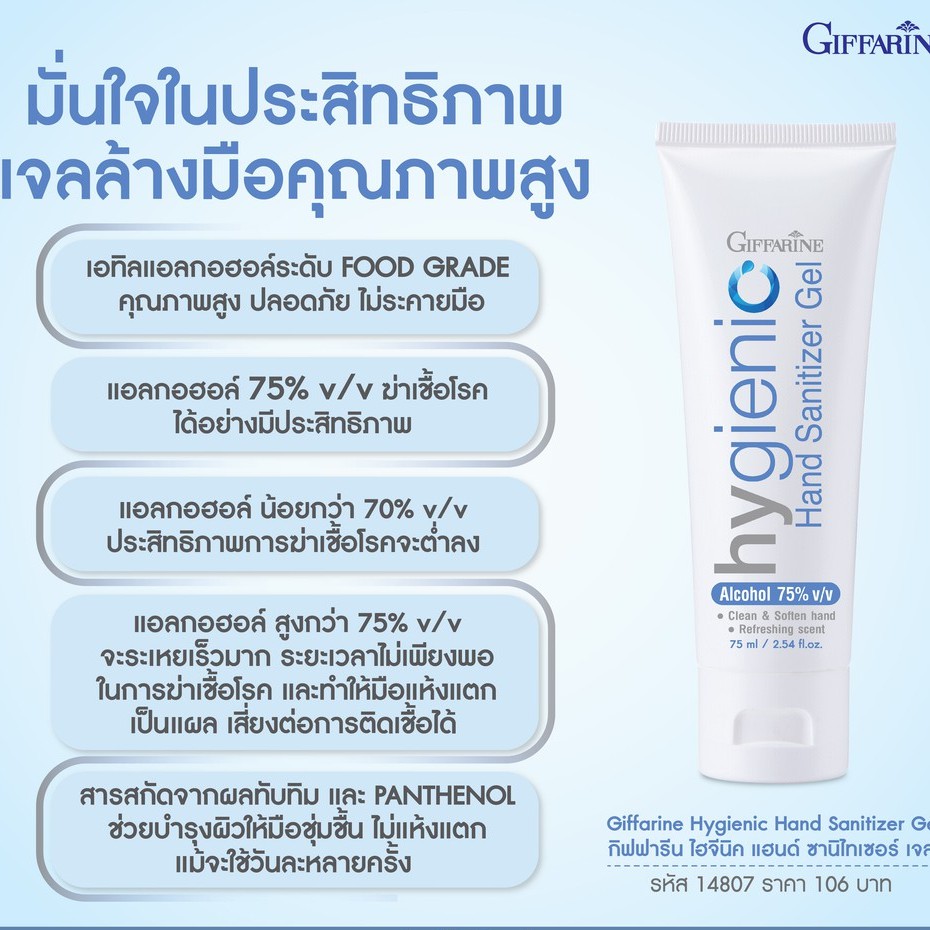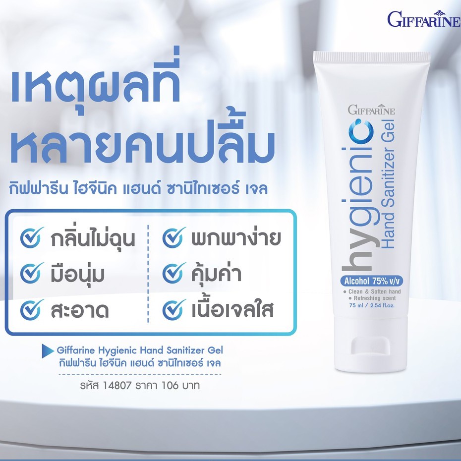 Giffarine Hygienic Hand Gel เจลแอลกอฮอลล์ล้างมือสูตรพิเศษจากกิฟฟารีน แอลกอฮอล์ 75% Food Grade