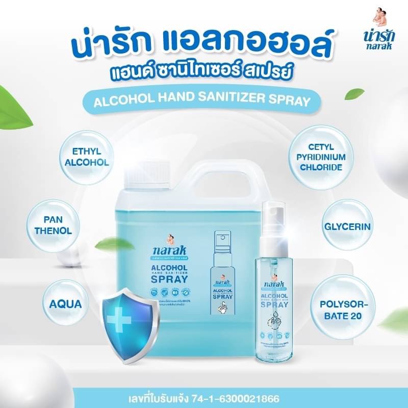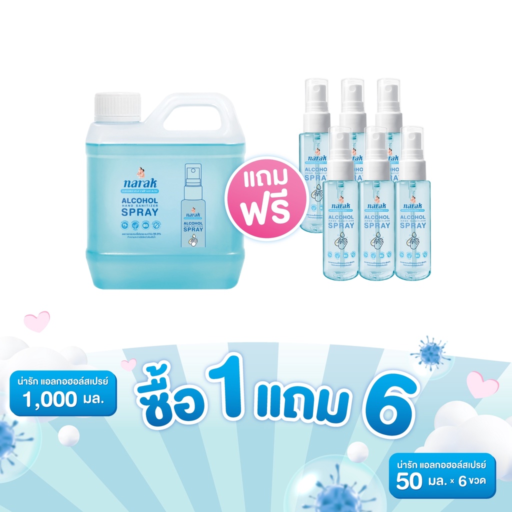 Narak น่ารักแอลกอฮอล์สเปรย์กลิ่น Floral (สีฟ้าใส) ชนิดน้ำ 1000 มล. 1 ชิ้น แถมขนาด 50 มล. 6 ชิ้น