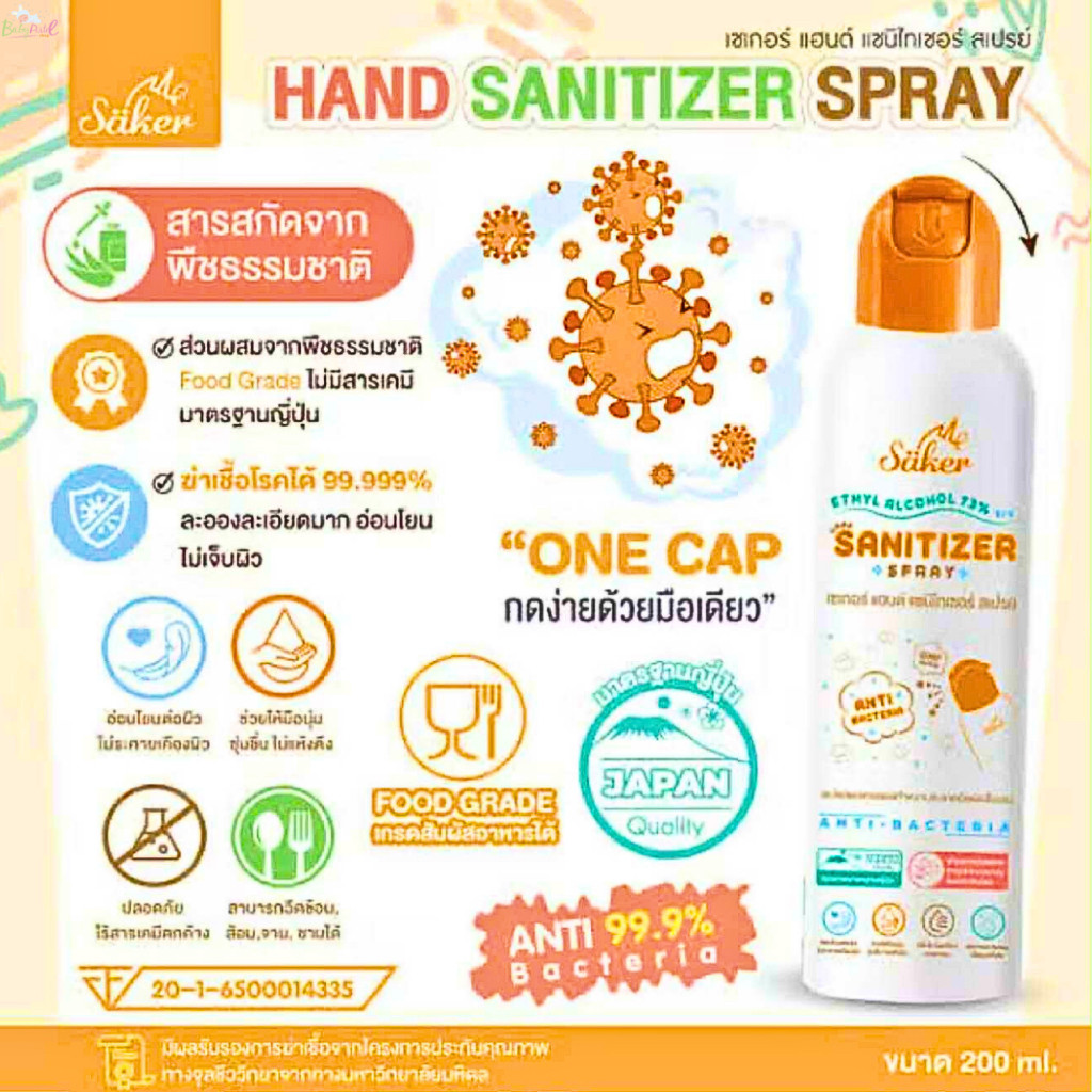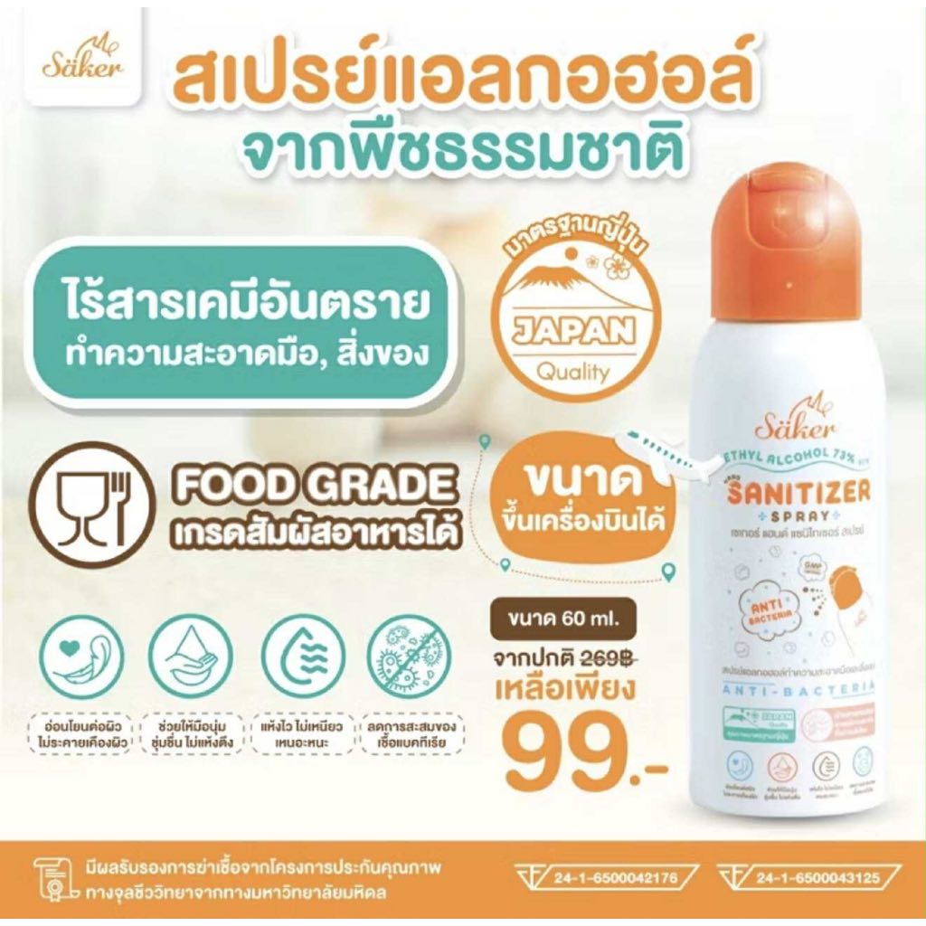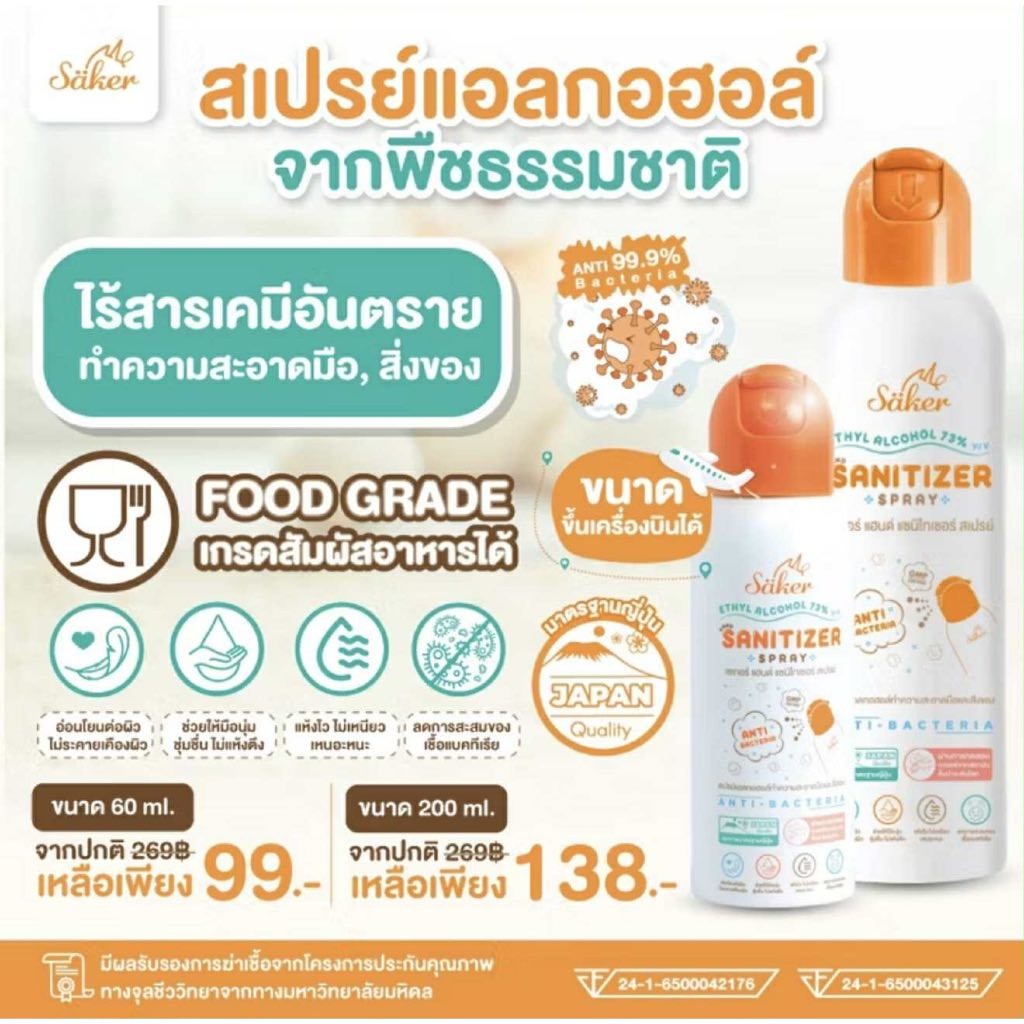 Saker สเปรย์แอลกอฮอล์จากพืชธรรมชาติ(ซื้อเยอะถูกลง) ฟู้ดเกรด เกรดสัมผัสอาหารได้ มาตรฐานญี่ปุ่นอันดับ1