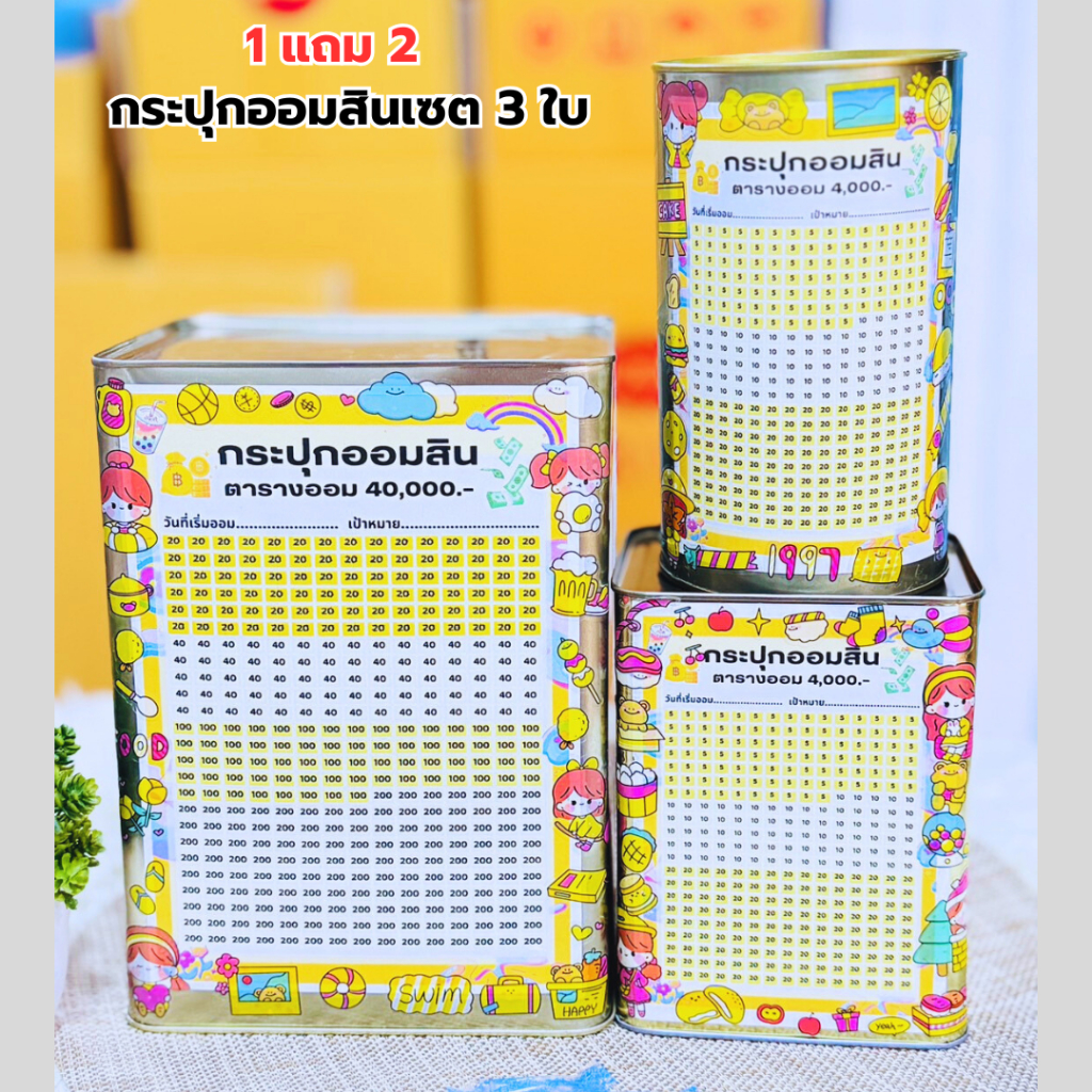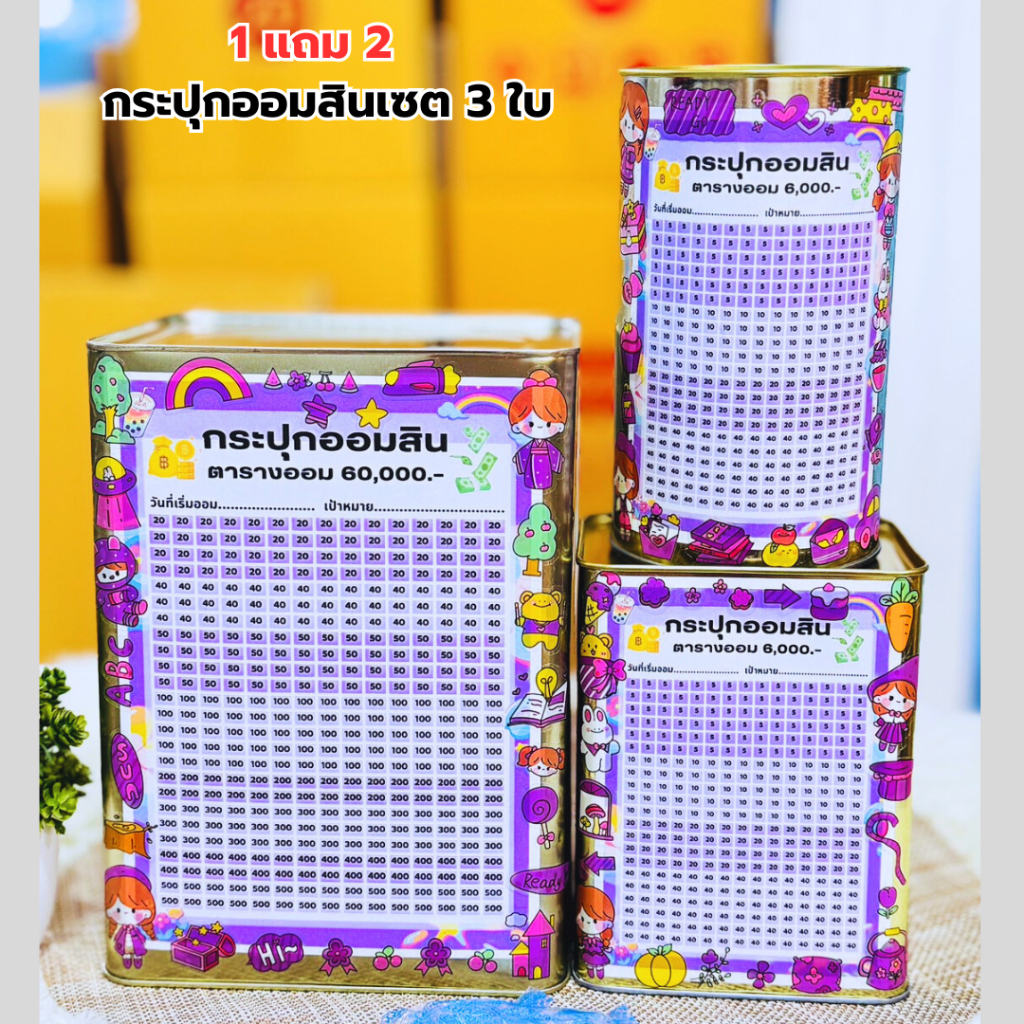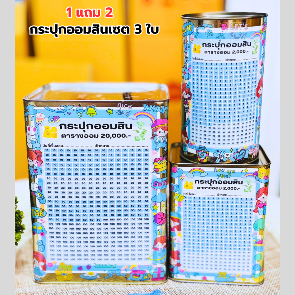 1แถม2 [เซต3ใบ] กระปุกออมสินรุ่นทึบสูง 23cm+ไมโครทึบสูง15cm+กลมสูง17cm พร้อมตารางออมและสติ๊กเกอร์น่ารัก