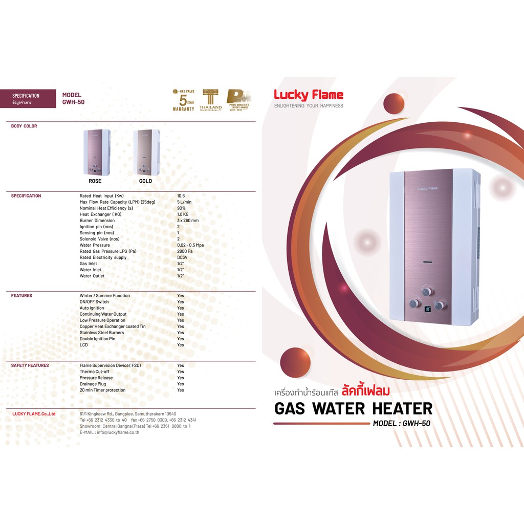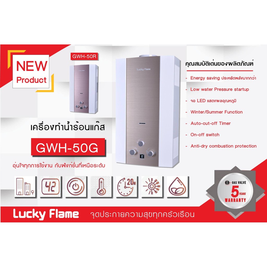 (แถมหัวปรับ+สายแก๊ส) ปริญญาพานิช x ลัคกี้เฟลม เครื่องทำน้ำร้อน ระบบแก๊ส 5 ลิตร /นาที gwh50 GWH-50 ประกันระบบจุด 5 ปี