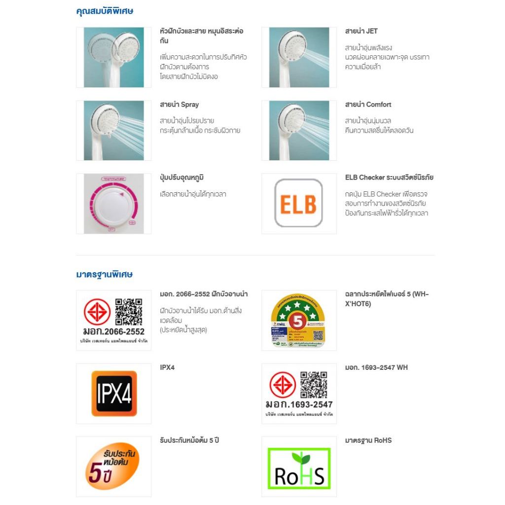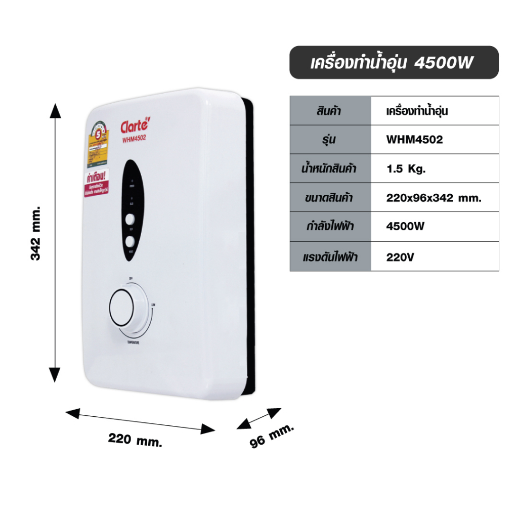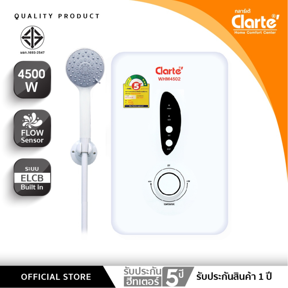 [WHM4501เหมือนกันกับWHM4502]Clarte’ เครื่องทำน้ำอุ่น 4,500 วัตต์ พร้อมชุดฝักบัวใหญ่มี2รุ่นให้เลือกรุ่นWHM4502และWHM4501