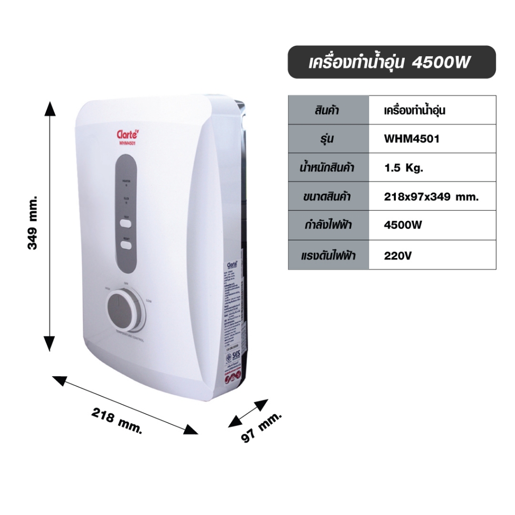 [สินค้าใหม่2024]Clarte’ เครื่องทำน้ำอุ่น 4,500 วัตต์ พร้อมชุดฝักบัวใหญ่รุ่น WHM4503มีมอก.สินค้าพร้อมส่ง