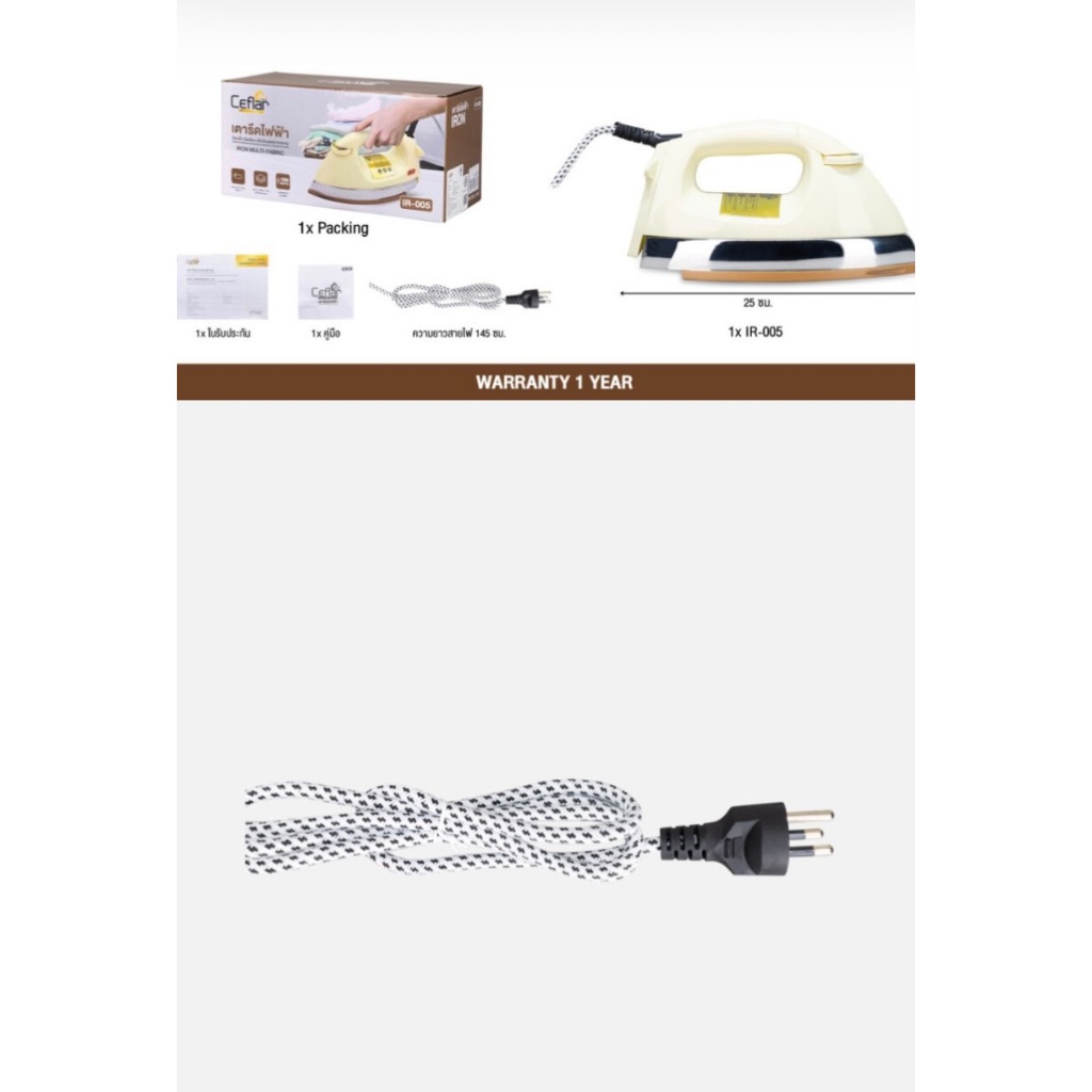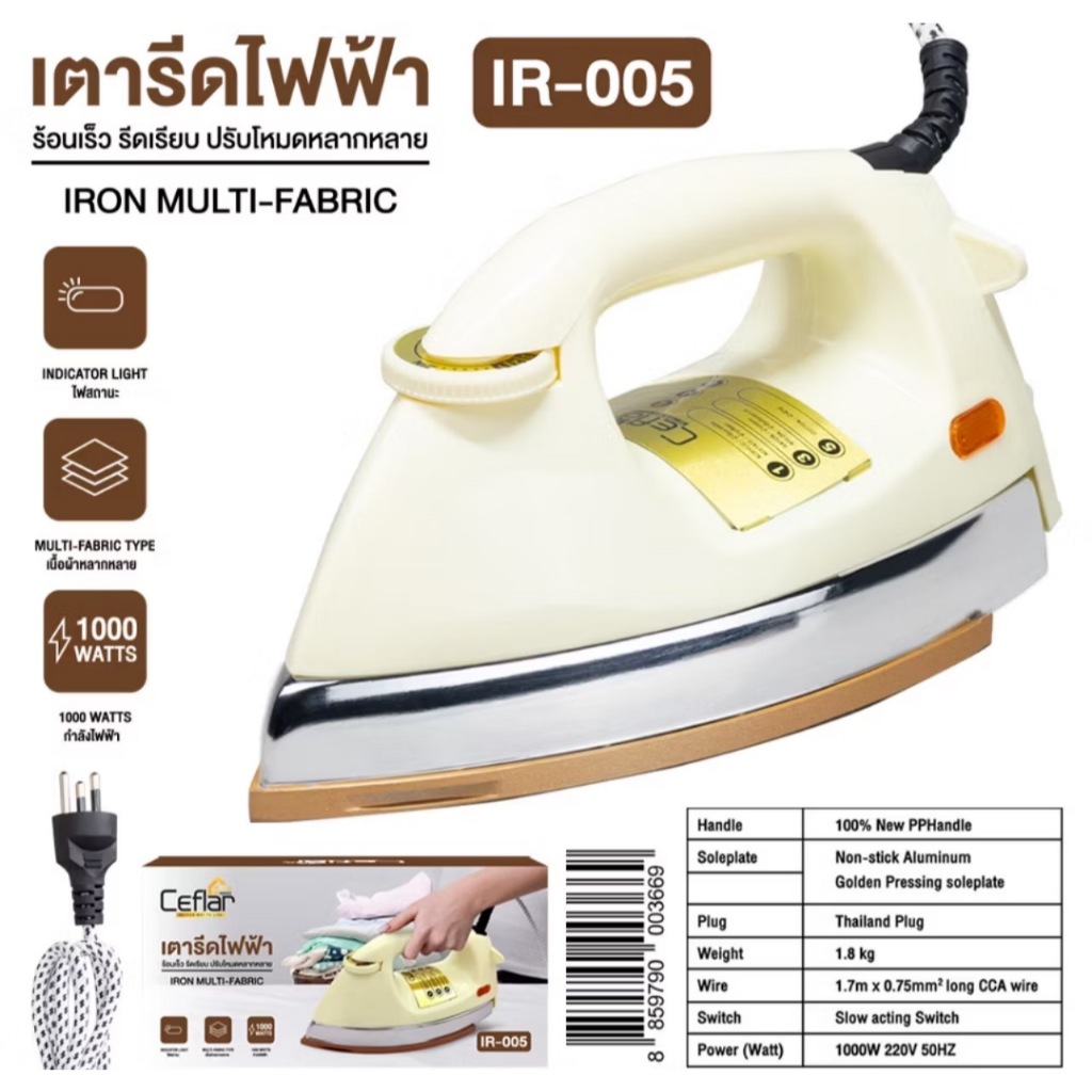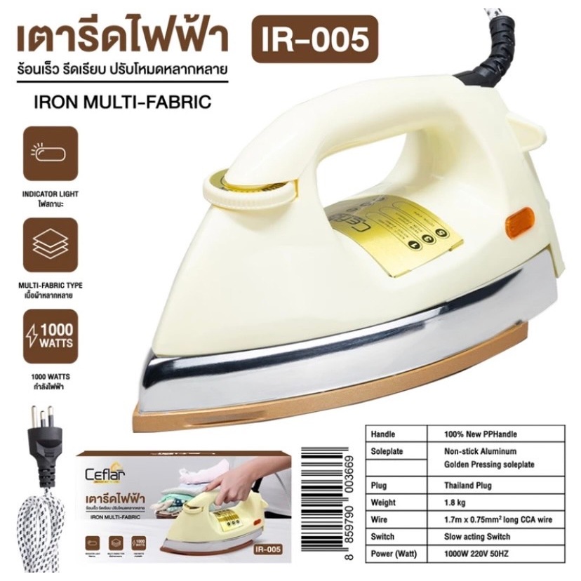 Ceflarเตารีดไฟฟ้าแบบแห้ง มีเทอร์โมสแตตรุ่นIR-005รุ่นคลาสสิค เตารีดแห้ง เตารีดหนัก รับประกัน 1 ปี มีมอก.กำลังไฟ1000วัตต์