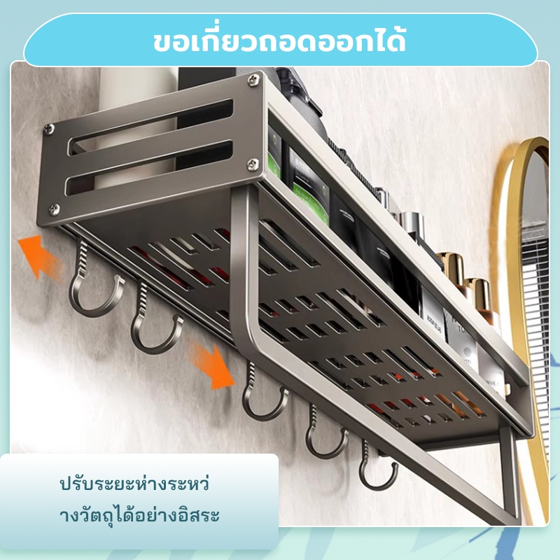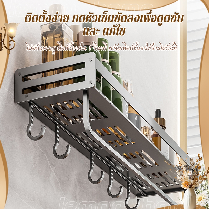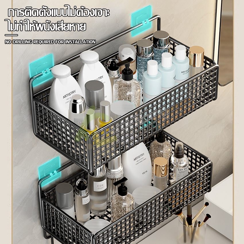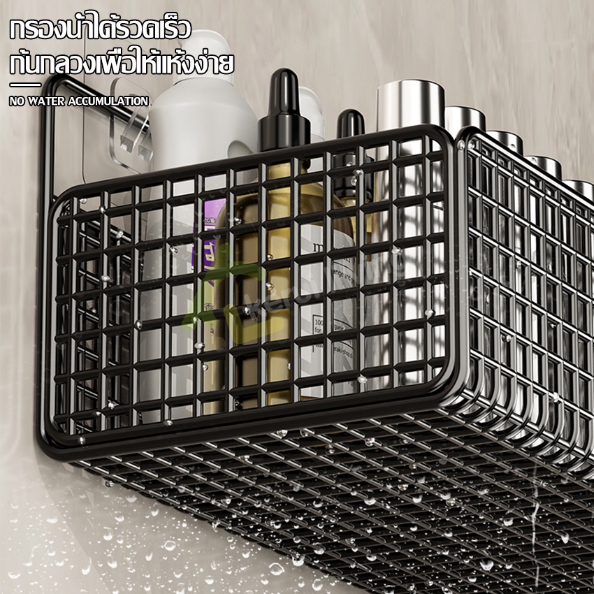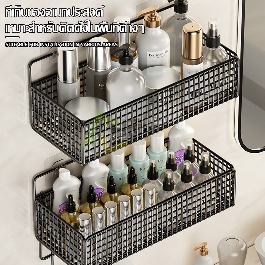 ชั้นวางของในห้องน้ำ ชั้นวางของติดผนัง สีดำ+ตะขอ ที่วางของติดผนัง ตะแกรงวาง ไม่ต้องเจาะผนัง