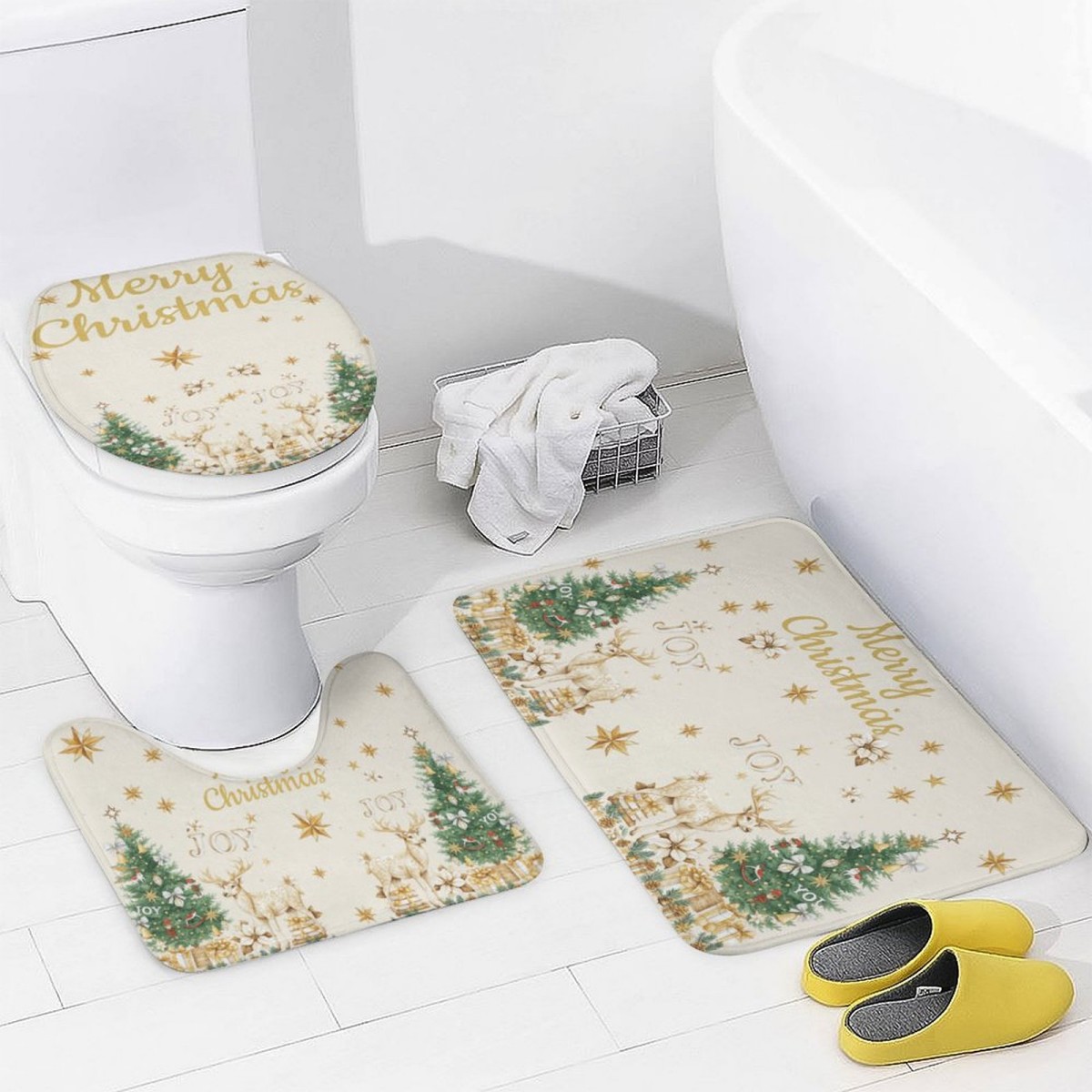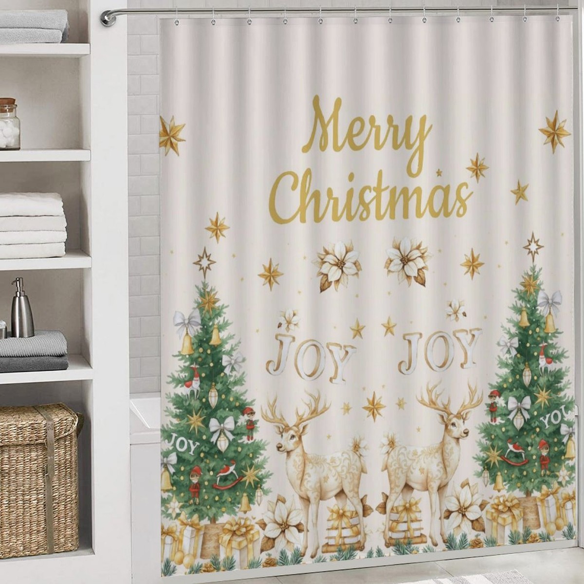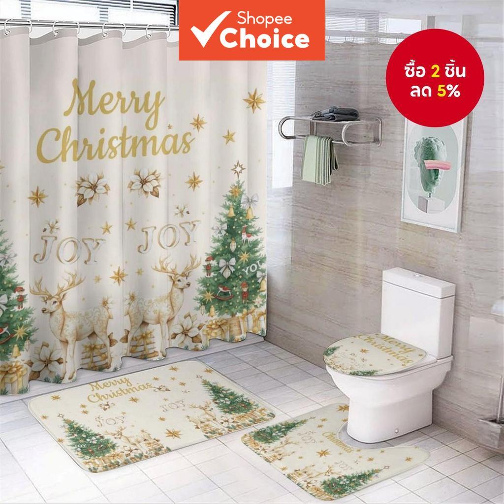 ชุดห้องน้ํากวางคริสต์มาสสีทองหรูหราเบา ชุดม่านอาบน้ํา + พรมเช็ดเท้า + แผ่นรองนั่งชักโครก เส้นใยโพลีเอสเตอร์กันน้ําซักได้ เหมาะกับบ้านตกแต่งอย่างพิถีพิถัน & ปรับปรุงห้องเช่าฤดูหนาว & สร้างบรรยากาศที่พักพร้อมอาหารเช้า