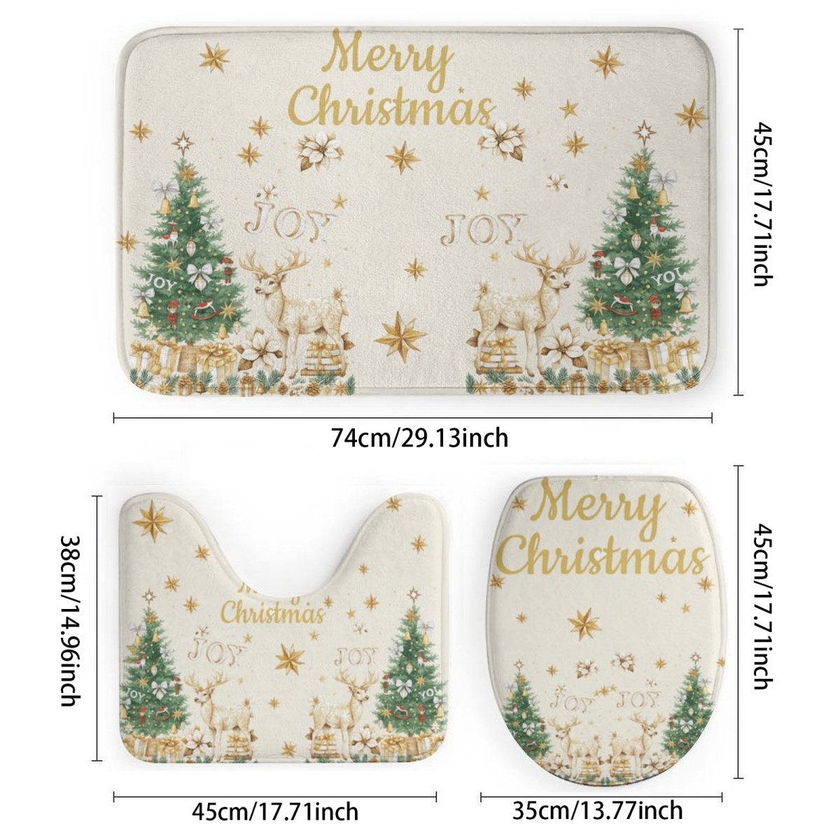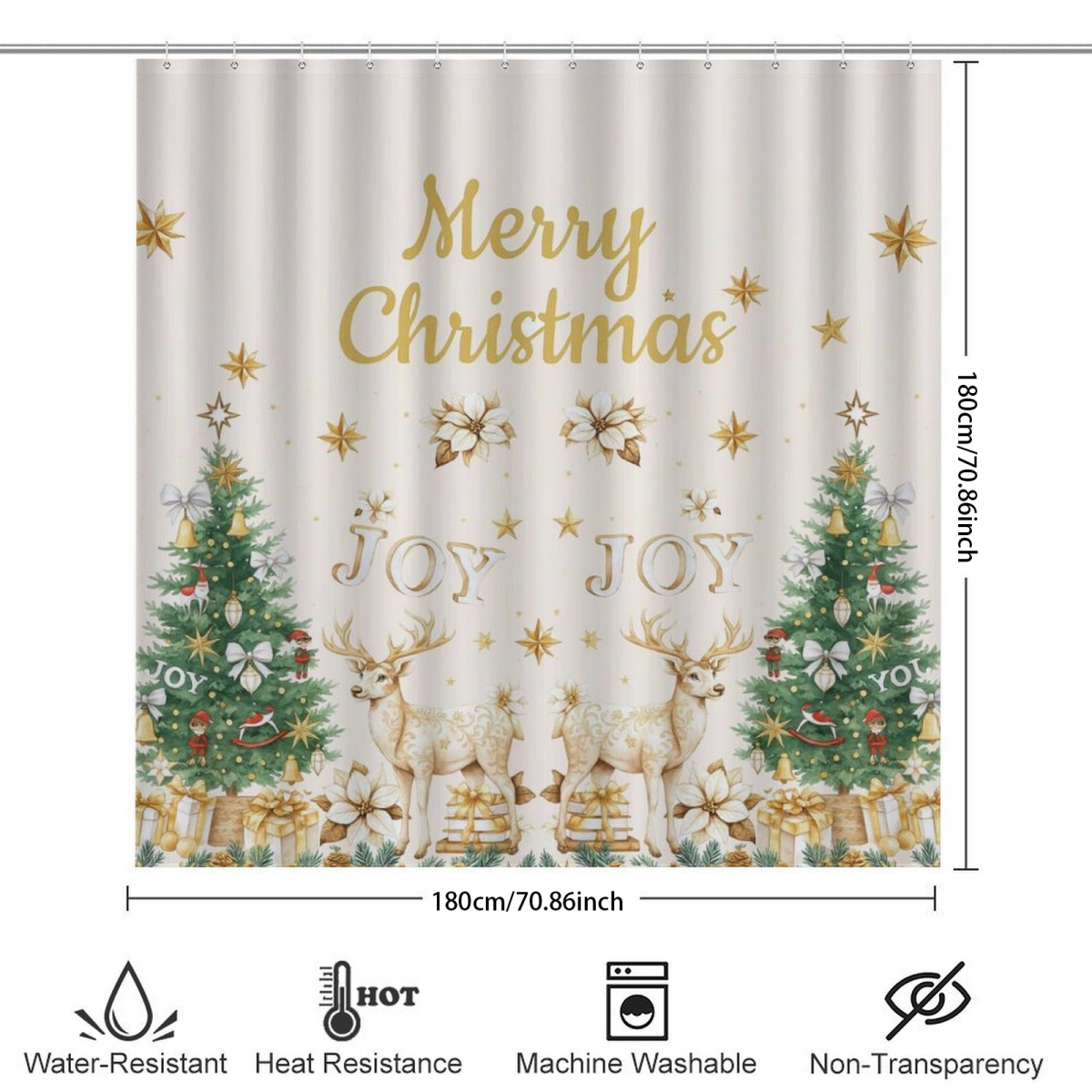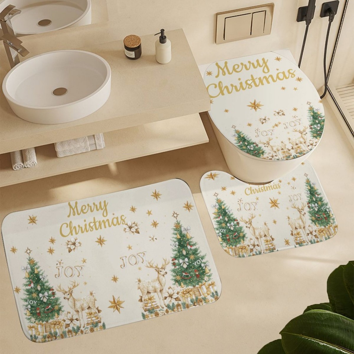 ชุดห้องน้ํากวางคริสต์มาสสีทองหรูหราเบา ชุดม่านอาบน้ํา + พรมเช็ดเท้า + แผ่นรองนั่งชักโครก เส้นใยโพลีเอสเตอร์กันน้ําซักได้ เหมาะกับบ้านตกแต่งอย่างพิถีพิถัน & ปรับปรุงห้องเช่าฤดูหนาว & สร้างบรรยากาศที่พักพร้อมอาหารเช้า