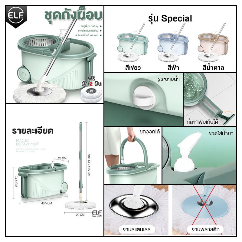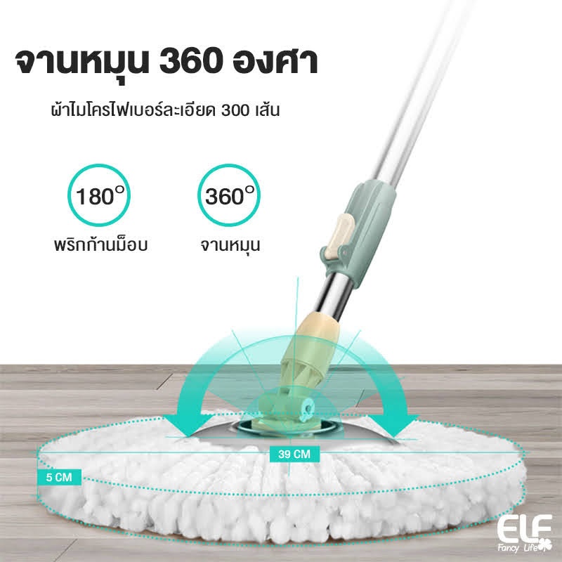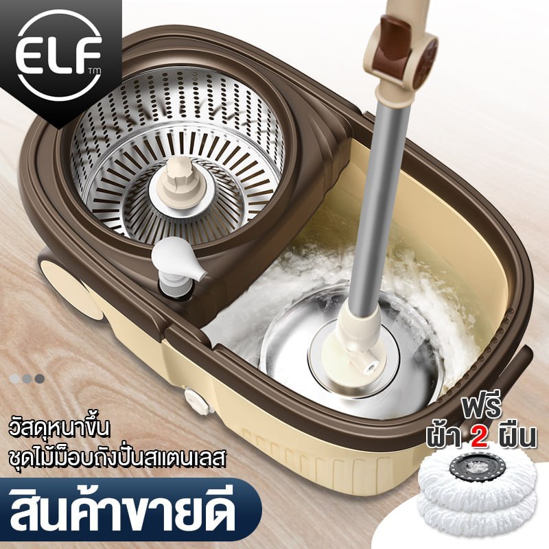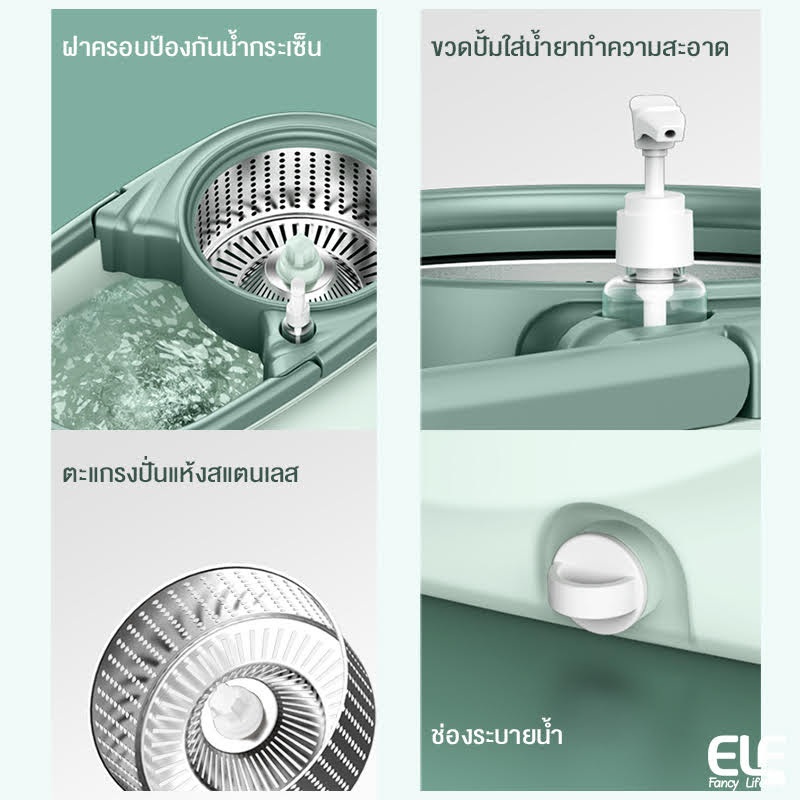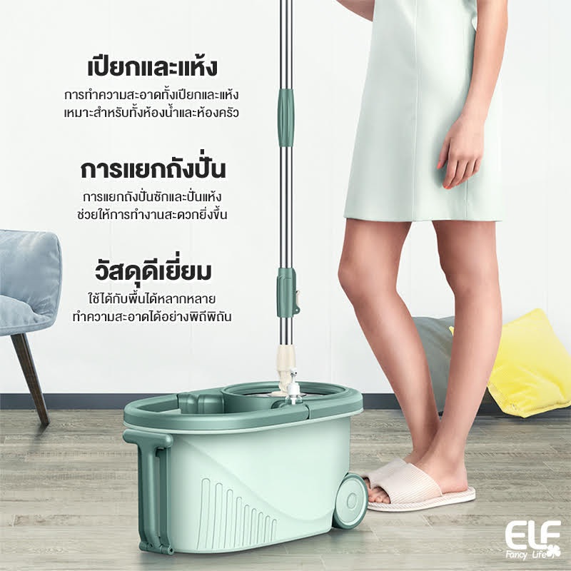 ELF ชุดถังปั่น Spin mop ไม้ถูพื้นพร้อมชุดถังปั่น ไม้ม็อบถูพื้น Mop มีล้อ มีรูระบายน้ำ ไม้ม็อบหมุนได้ 360 องศา 4084