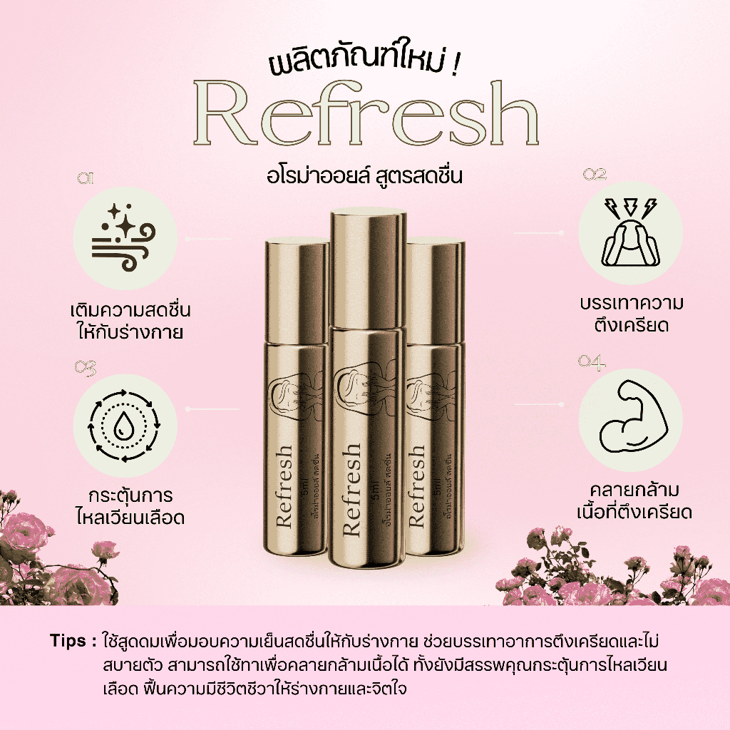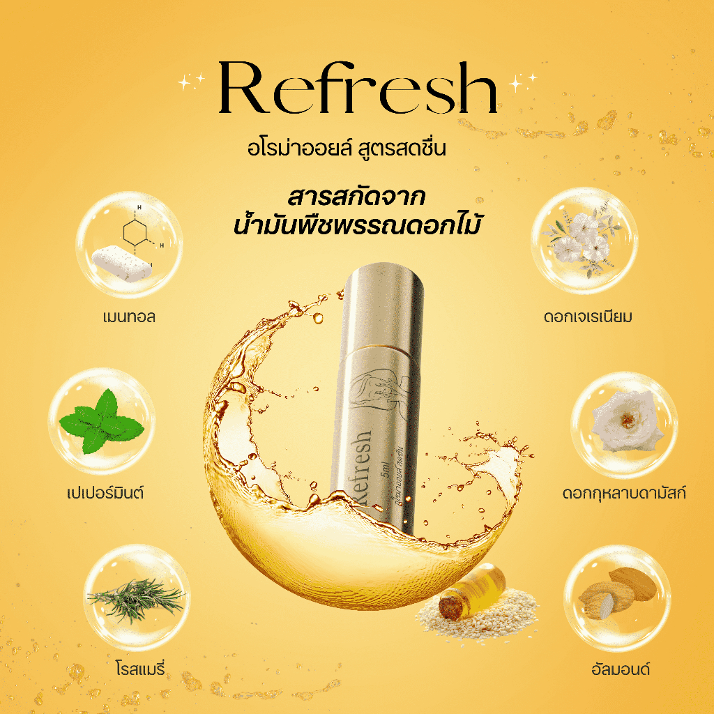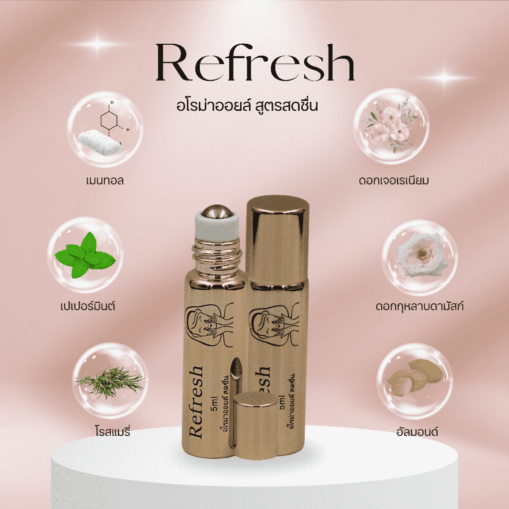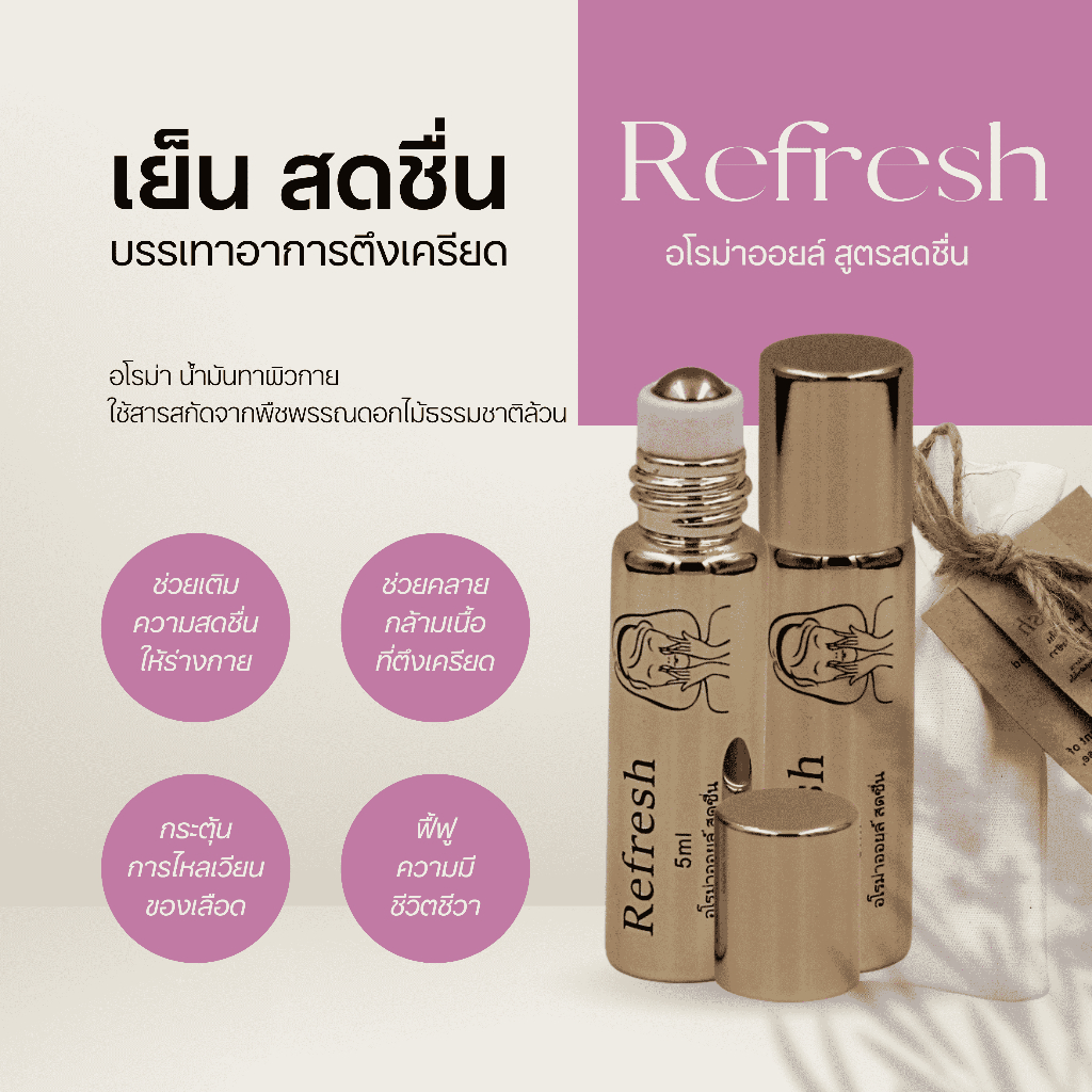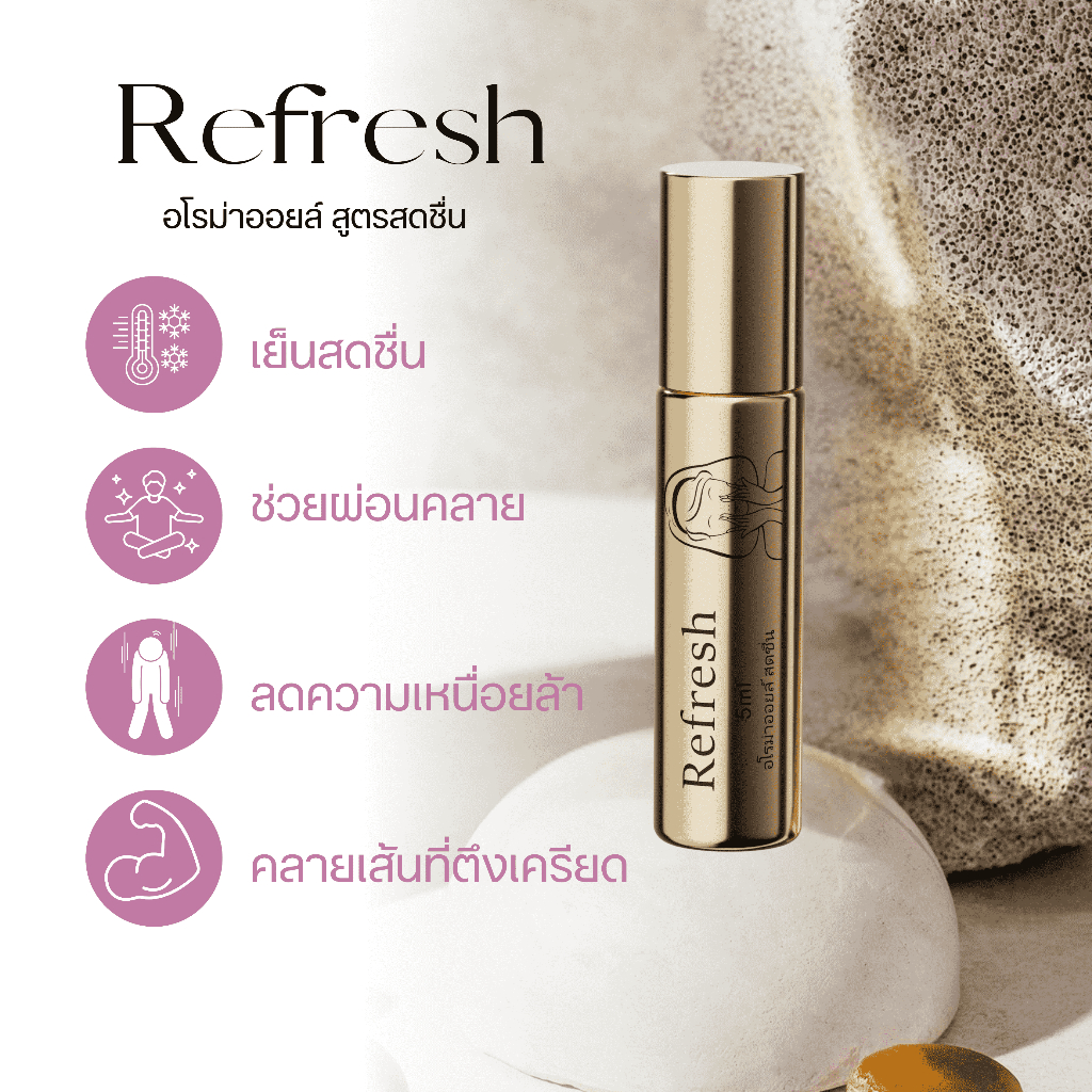 refresh น้ำมันไทยอโรม่า 5ml สกัดจากพืชดอกไม้ ธรรมชาติ เย็นสบาย สดชื่น และ ผ่อนคลายการบำบัดด้วยกลิ่น ต้วช่วยนอนหลับ ลาเวน