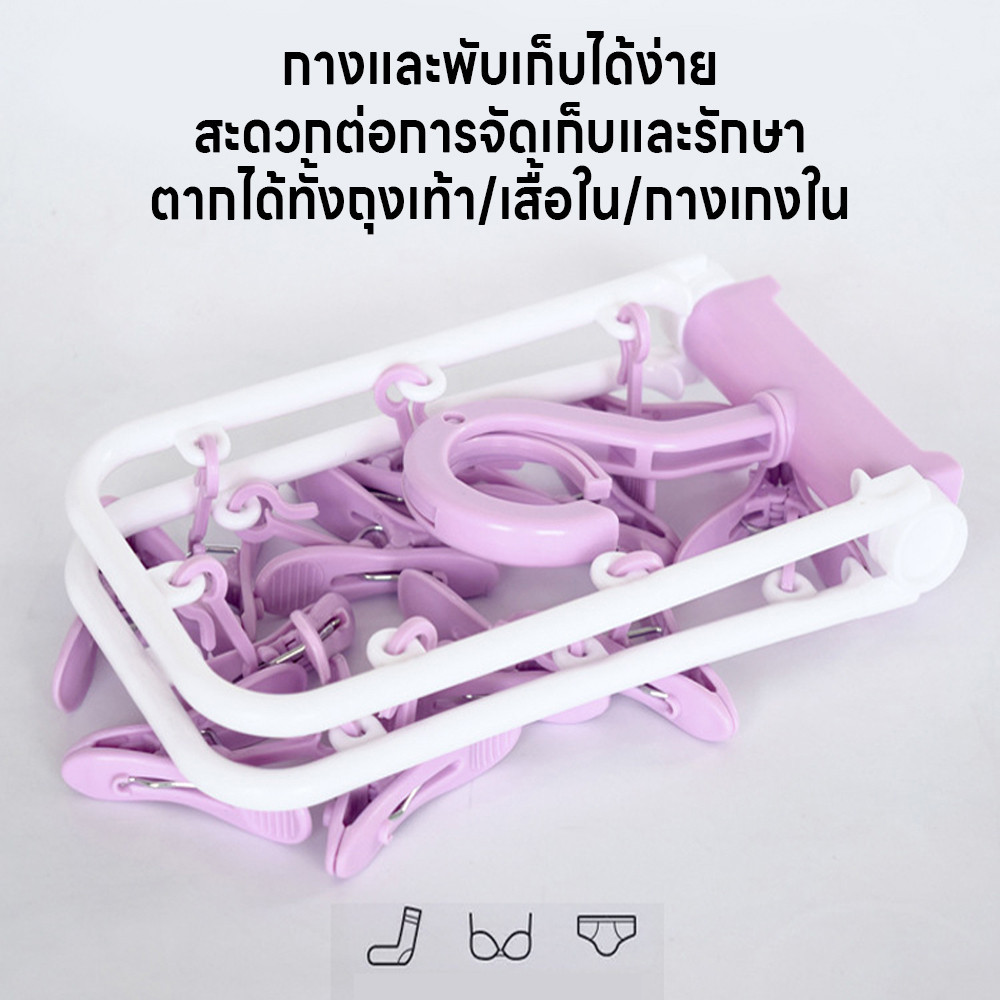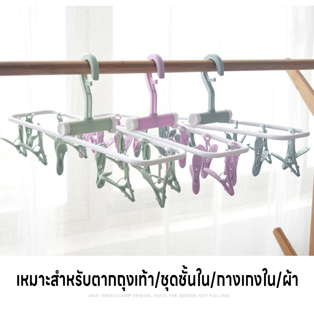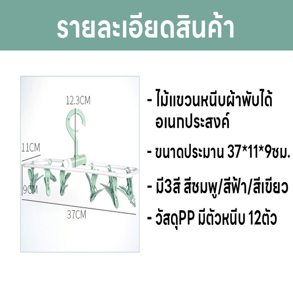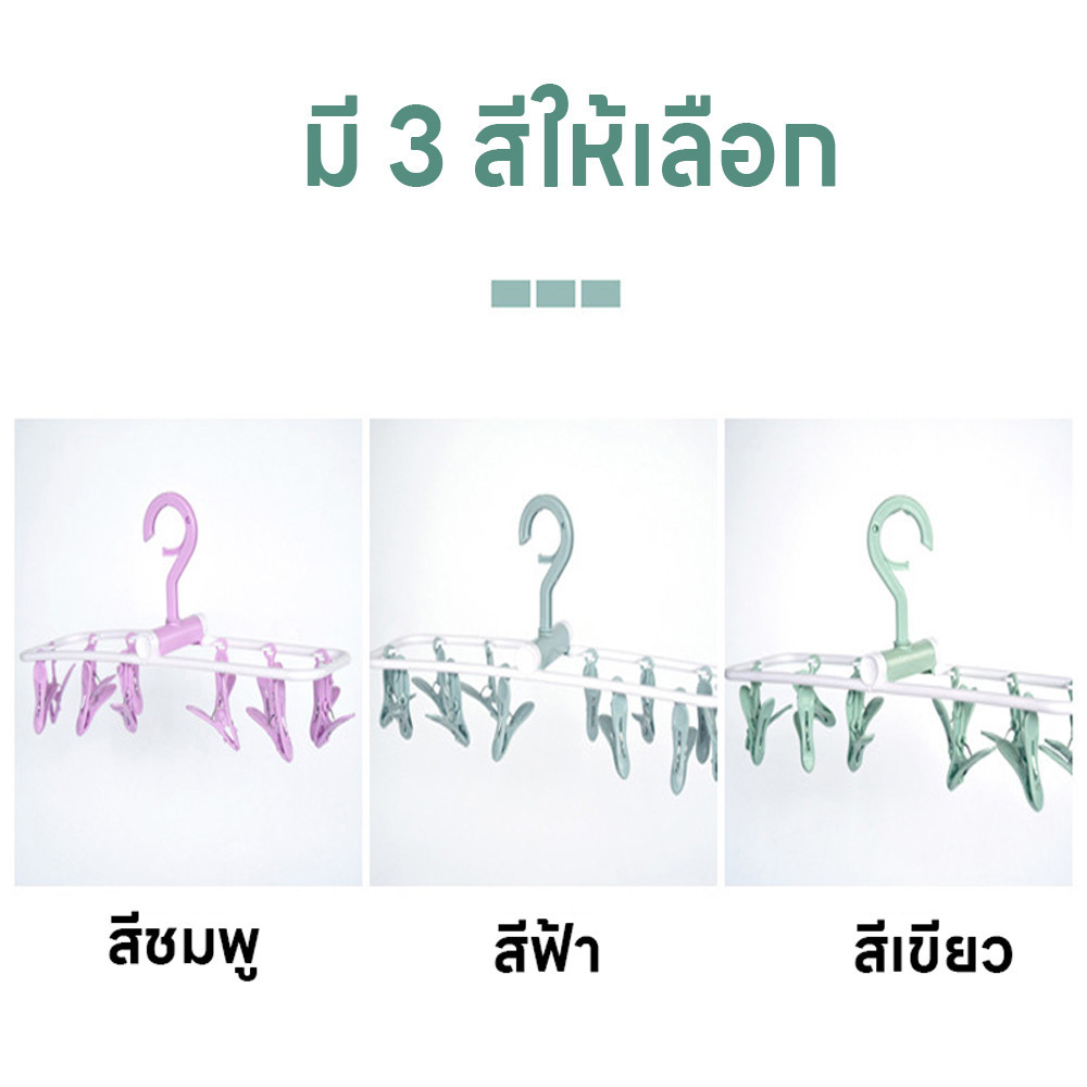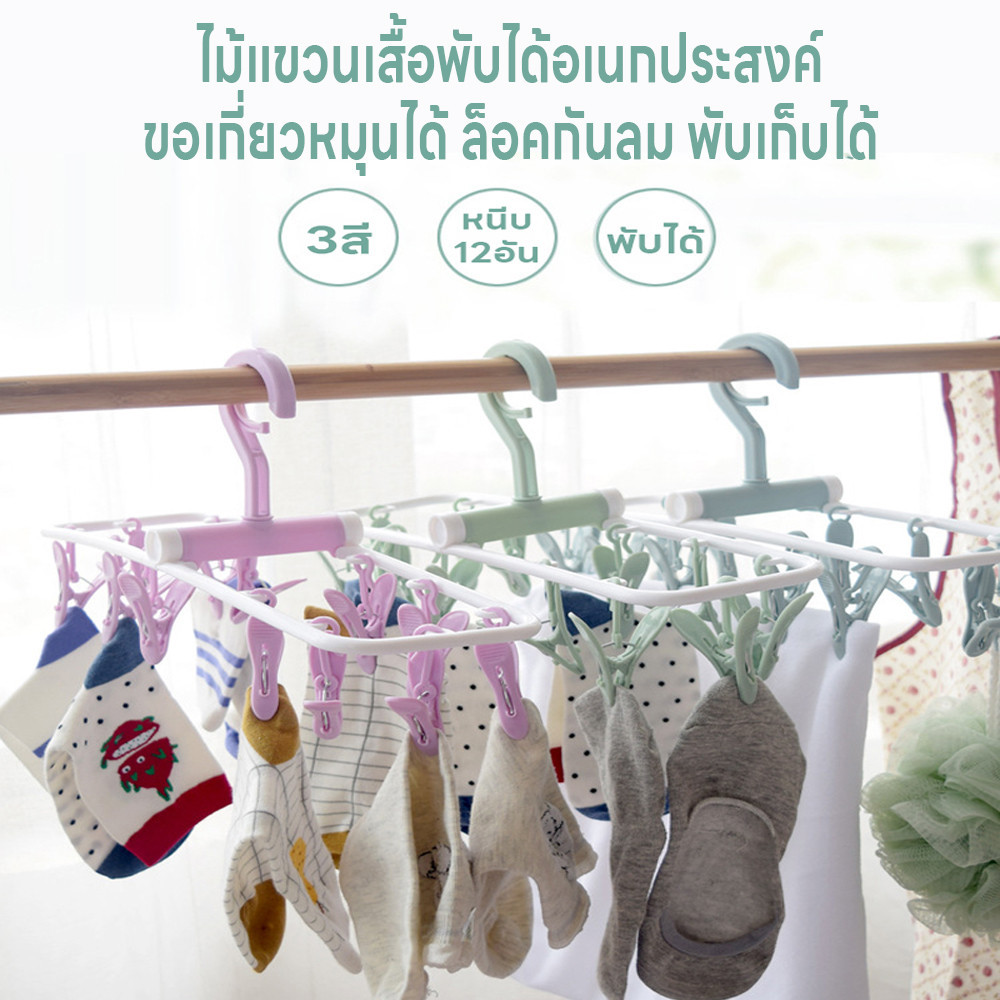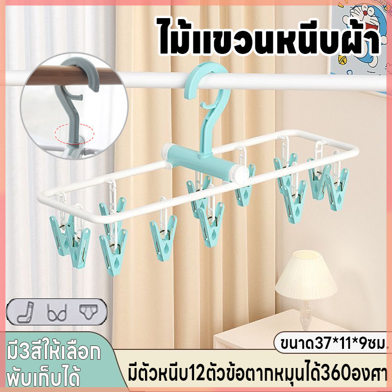 ไม้แขวนหนีบผ้า ไม้หนีบผ้าพับได้ ห่วงไม้หนีบผ้า พวงไม้หนีบผ้า มี12ตัวหนีบ ไม้แขวนเสื้อ ข้อตากไม้แขวนหมุนได้360องศา
