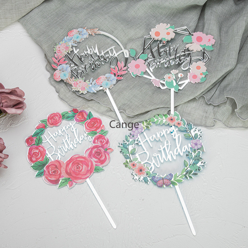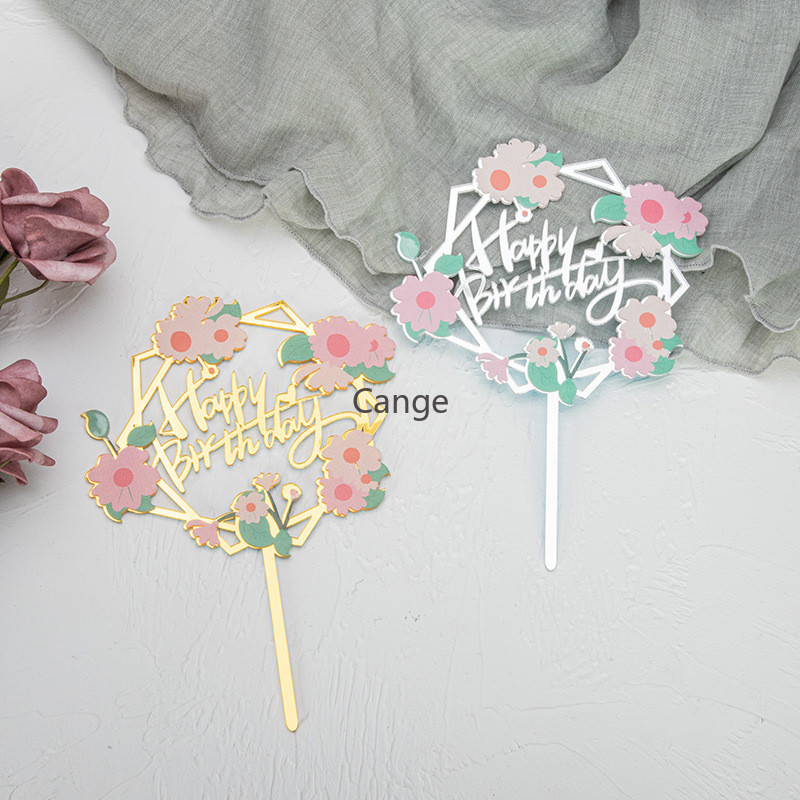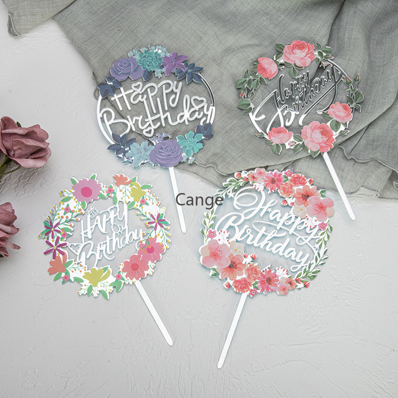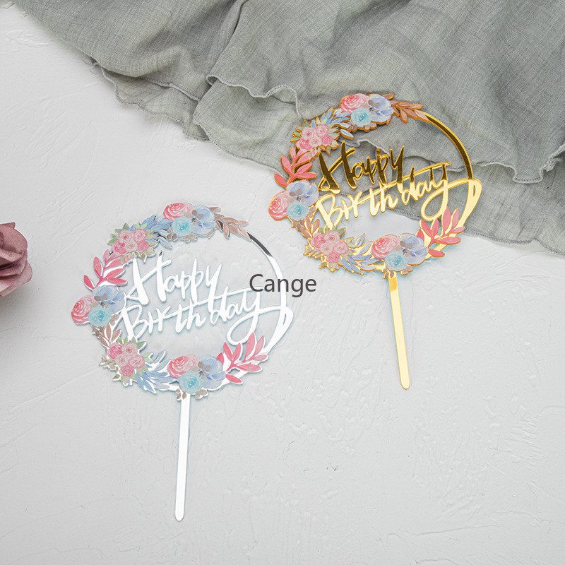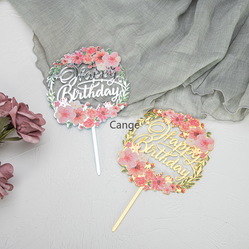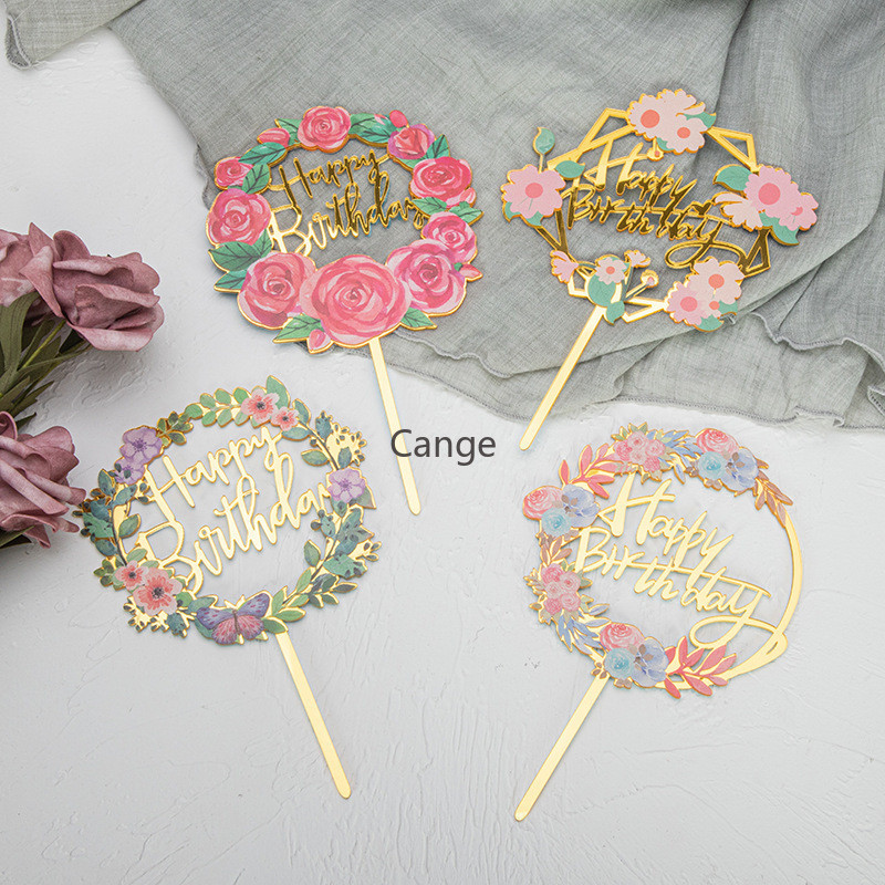 ใหม่สีพิมพ์ดอกไม้สุขสันต์วันเกิดเค้กตกแต่งการ์ดแทรกทองเงินอะคริลิเบเกอรี่ขนมตารางแทรก