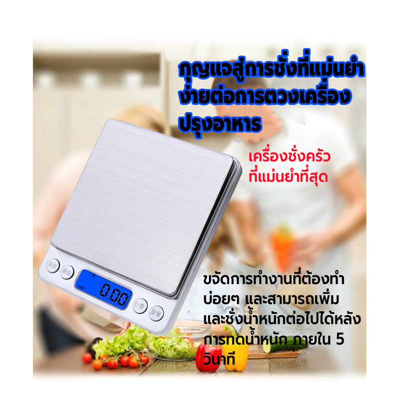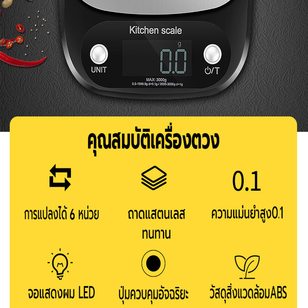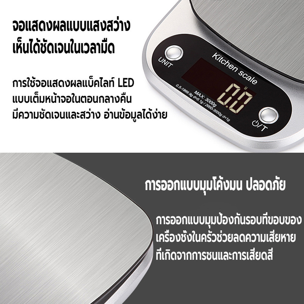 เครื่องชั่งน้ำหนักดิจิตอล ใช้ในห้องครัว ชั่งอาหาร วัตถุดิบ จอLED รับน้ำหนักได้3kg/0.1gแถมถ่าน กันน้ำ