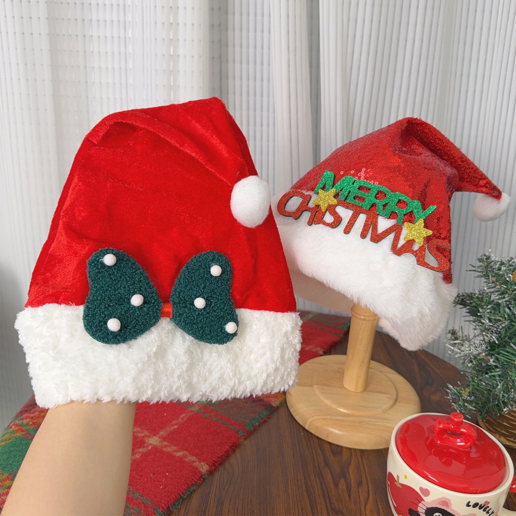 หมวกคริสต์มาสผ้านุ่มพร้อมการออกแบบเลื่อม – หมวกปาร์ตี้สีคริสต์มาสสีเขียวสีแดงคลาสสิก – ตกแต่งโบว์ลายจุดน่ารัก