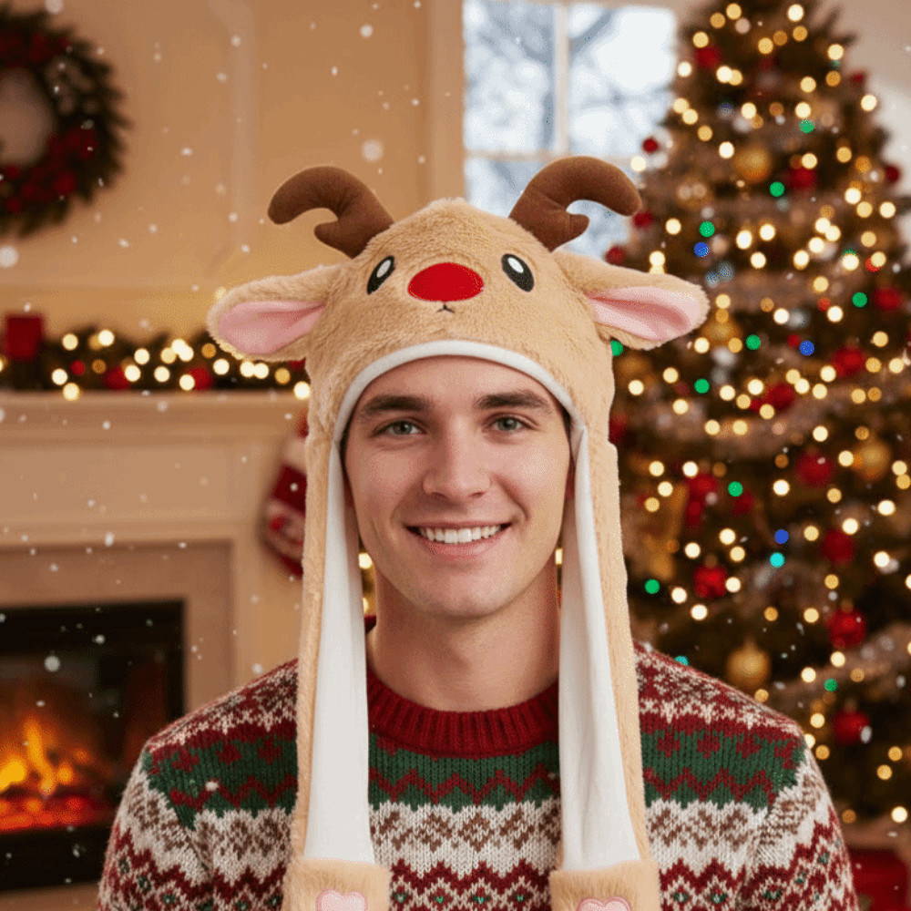 หมวกคริสต์มาสสไตล์ Santa Reindeer หูการ์ตูนเคลื่อนที่ได้ อุ่นและสวมใส่ง่ายสำหรับงานปาร์ตี้คริสต์มาสหรือฮาโลวีน