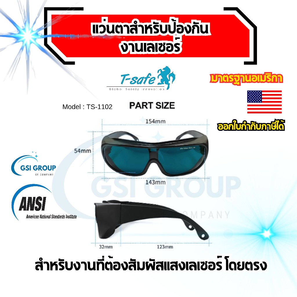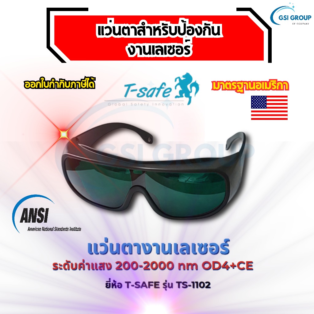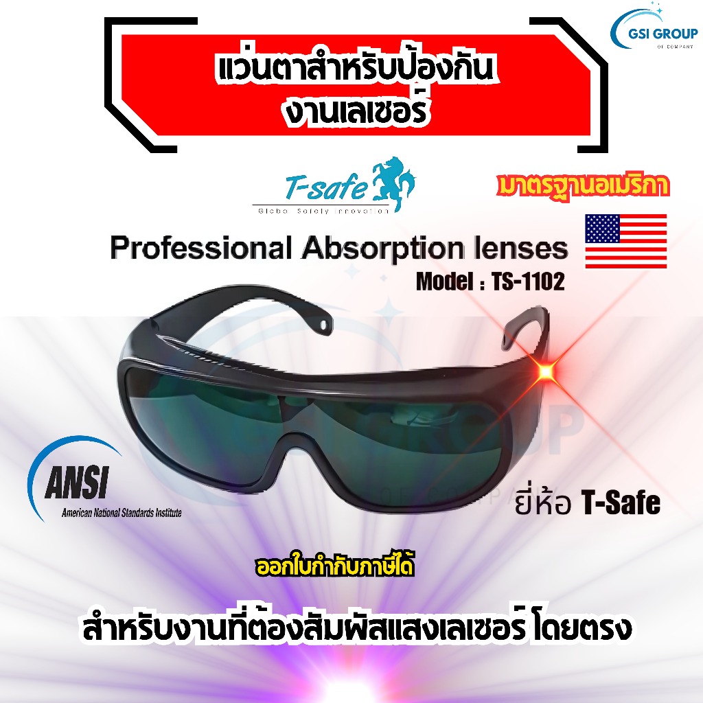 แว่นตางานเลเซอร์ แว่นตางานเชื่อมเลซอร์ แบบไม่นำไฟฟ้า (LASER SAFETY GLASSES ) T-SAFE รุ่น TS-1102