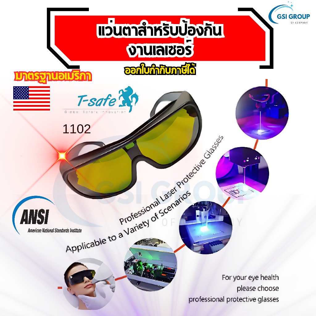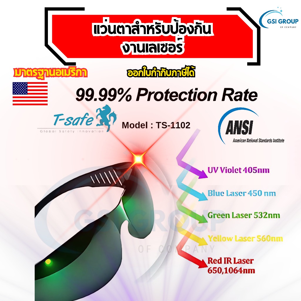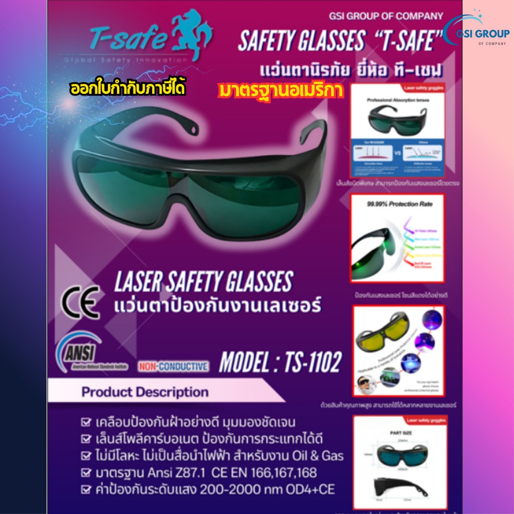 แว่นตางานเลเซอร์ แว่นตางานเชื่อมเลซอร์ แบบไม่นำไฟฟ้า (LASER SAFETY GLASSES ) T-SAFE รุ่น TS-1102