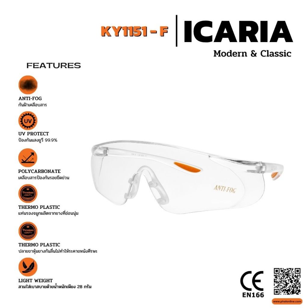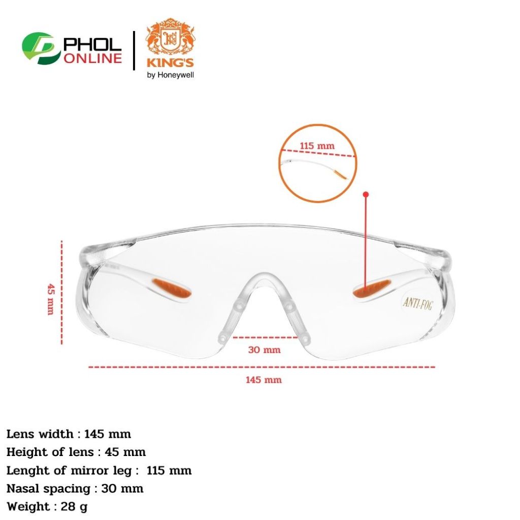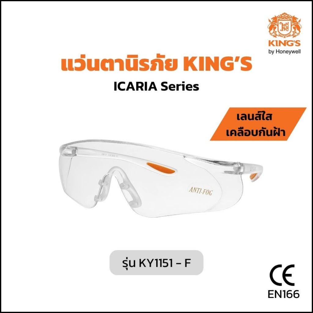แว่นตานิรภัย แว่นตาเซฟตี้ KING’S รุ่น KY1151-F เลนส์ใส เคลือบกันฝ้า กันรอยขีดข่วน