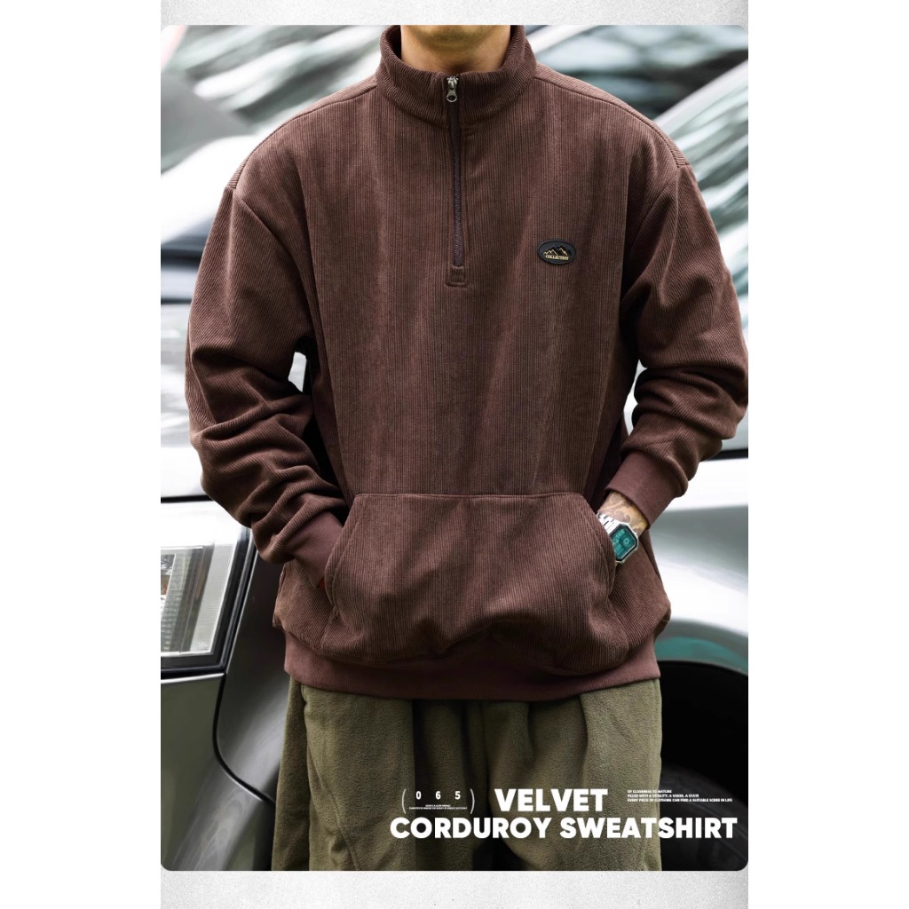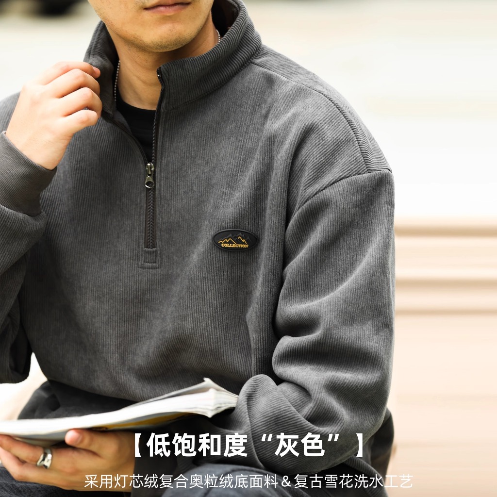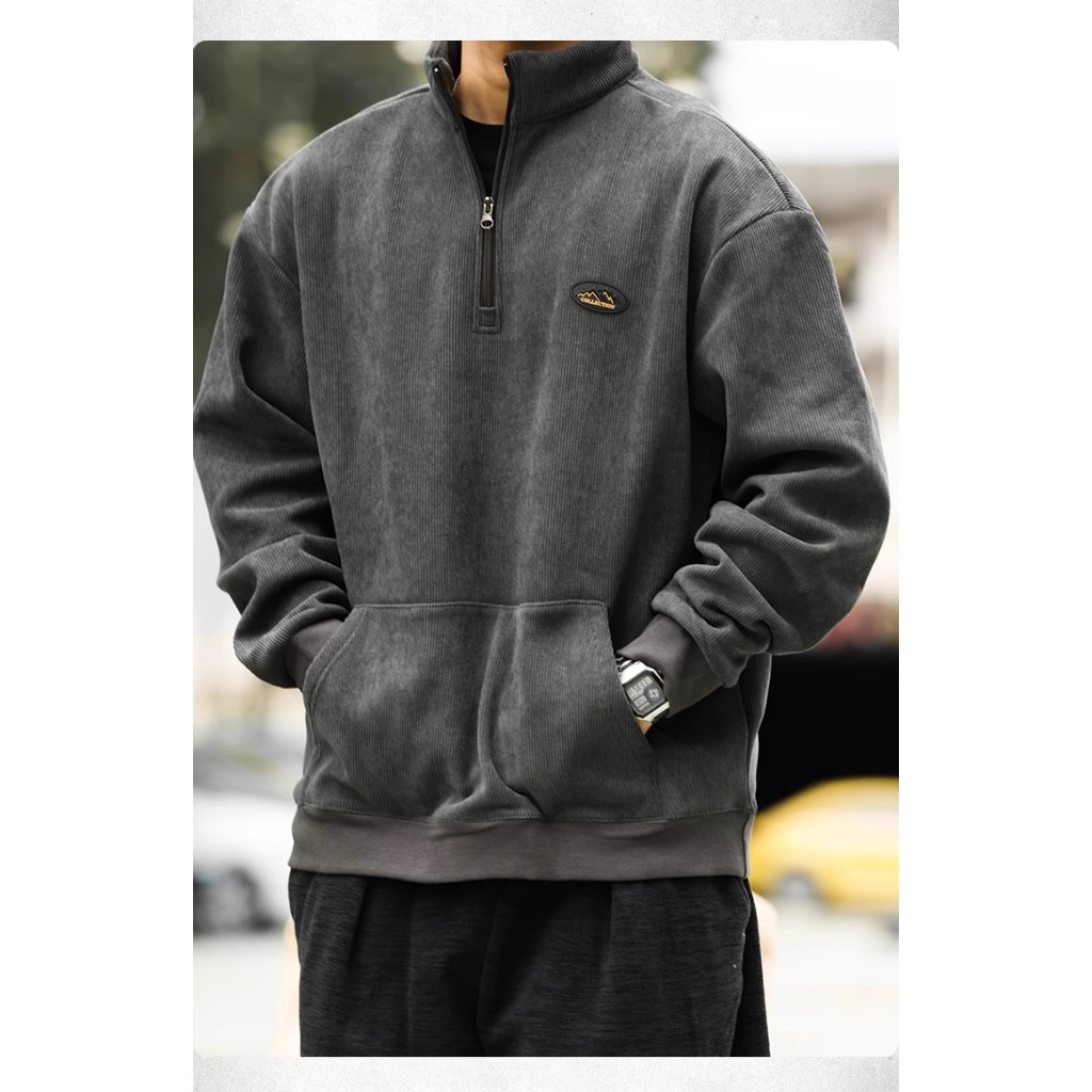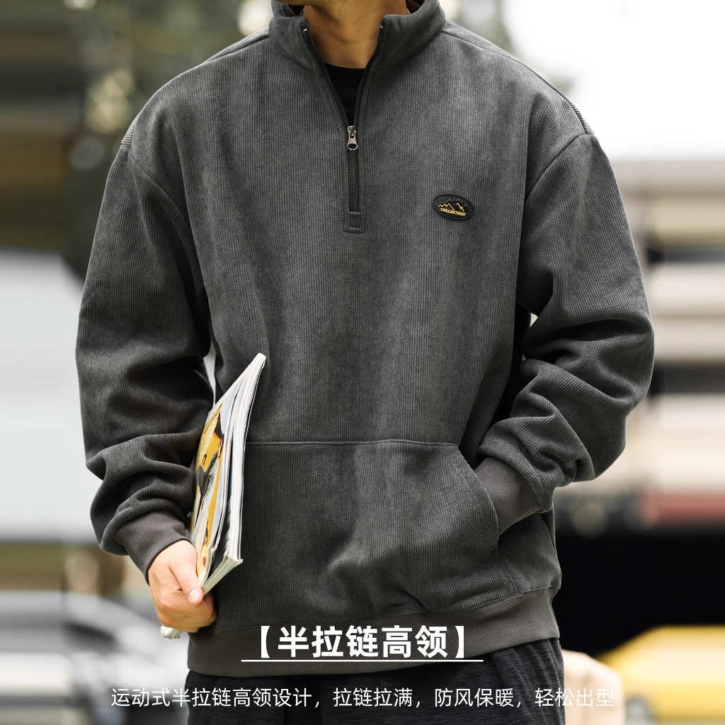 American Retro Half Zipper Stand-Up Collar Corduroy Sweatshirt Mens Fleece Warm cleanfit Top Jacket