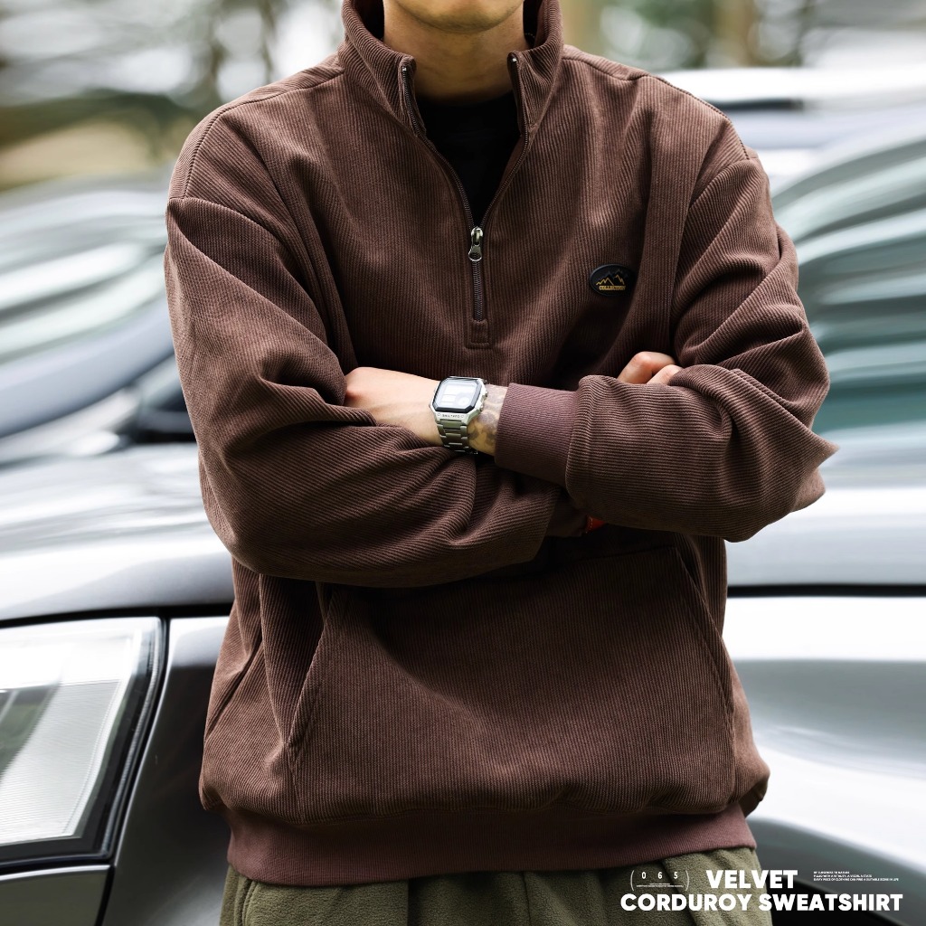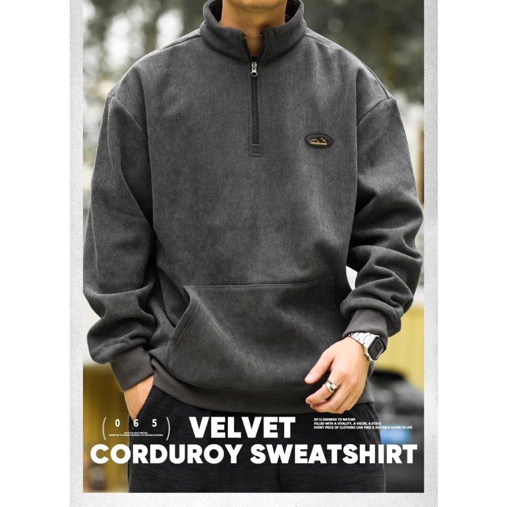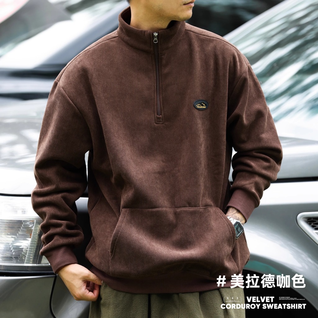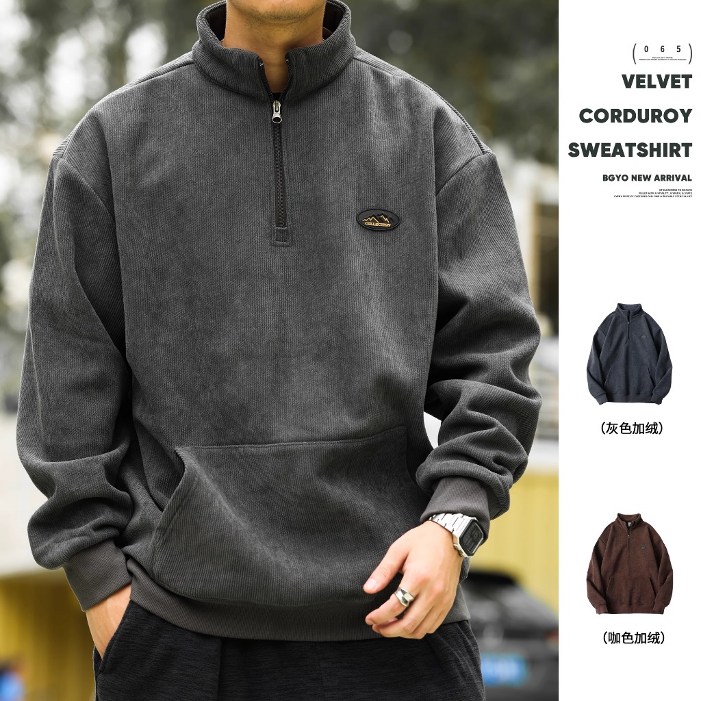 American Retro Half Zipper Stand-Up Collar Corduroy Sweatshirt Mens Fleece Warm cleanfit Top Jacket