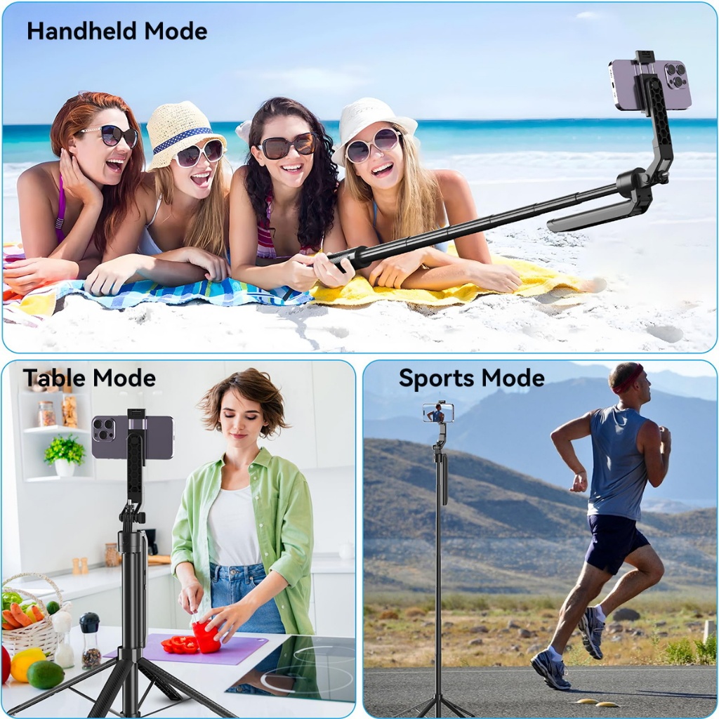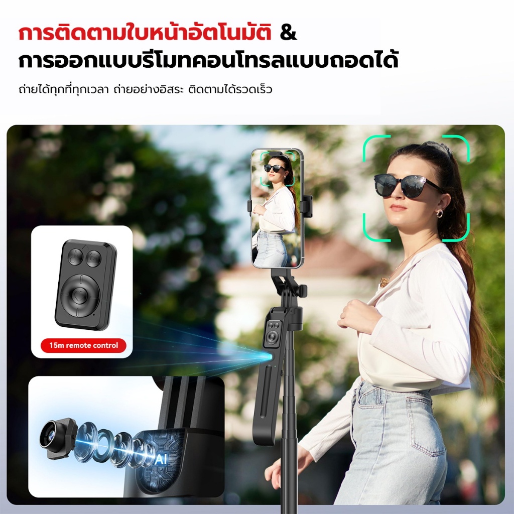 JQVITEK ไม้เซลฟี่พกพาพร้อมระบบติดตามใบหน้า AI ฐานสี่ขาปรับหมุน 360° ขาตั้งกล้อง บลูทูธกันสั่น ตัวกันสั่นแบบกิมบอล GS12