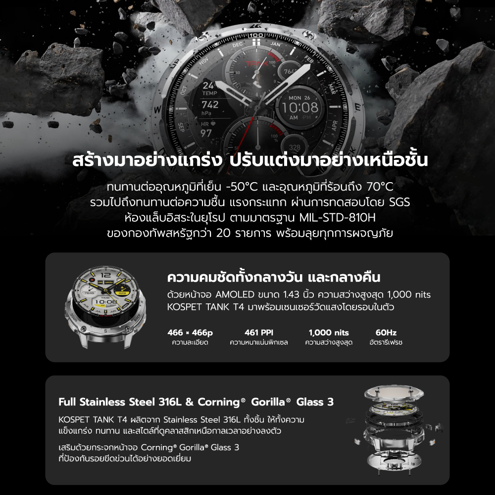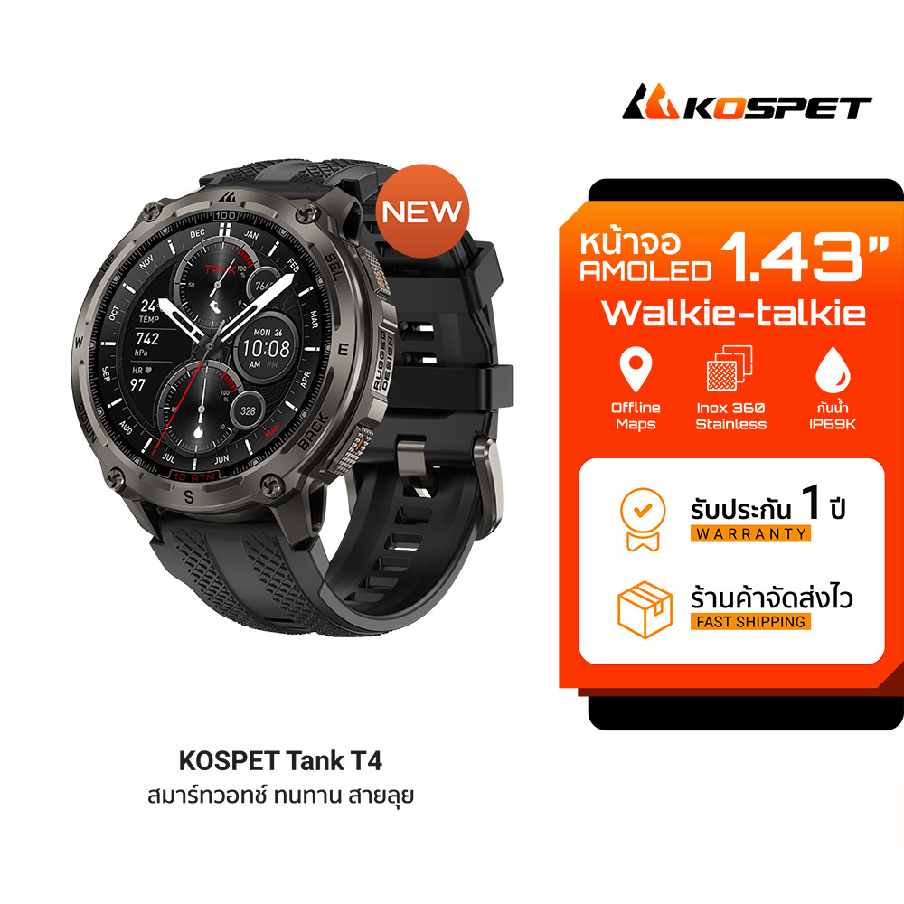 (NewArrival) KOSPET TANK T4 Rugged Smartwatch With GPS สมาร์ทวอทช์ แผนที่ออฟไลน์ หน้าจอ AMOLED กันน้ำ 10ATM -1Y