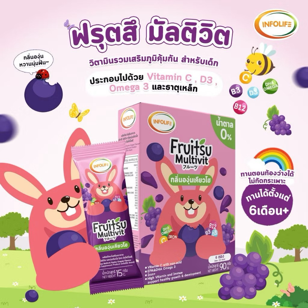 (2กล่อง 12ซอง)Fruitsu Multivit ฟรุตสึ มัลติวิต วิตามินน้ำชงรสองุ่นเคียวโฮ?บำรุงสมอง บำรุงกระดูก เสริมภูมิ เพิ่มธาตุเหล็ก