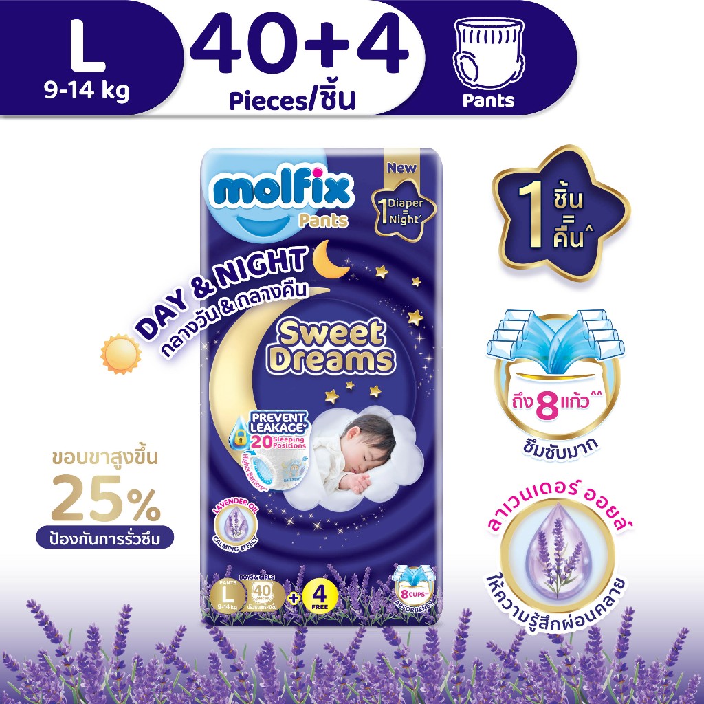 [ใหม่ 44 ชิ้น] Molfix กางเกงผ้าอ้อมเด็กโมลฟิกซ์ สวีต ดรีมส์ แพ้นส์ เดย์ & ไนท์ ไซซ์ L40+4 ชิ้น