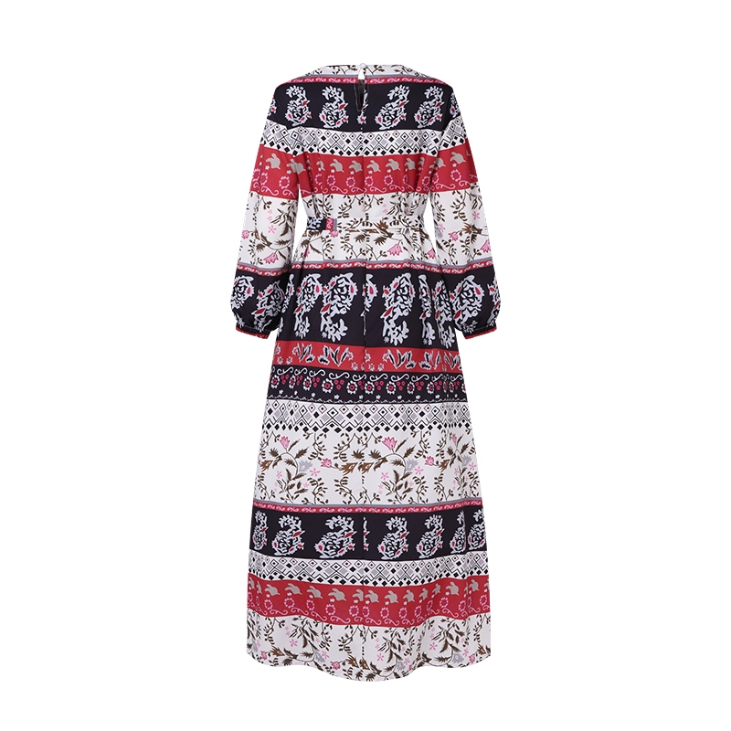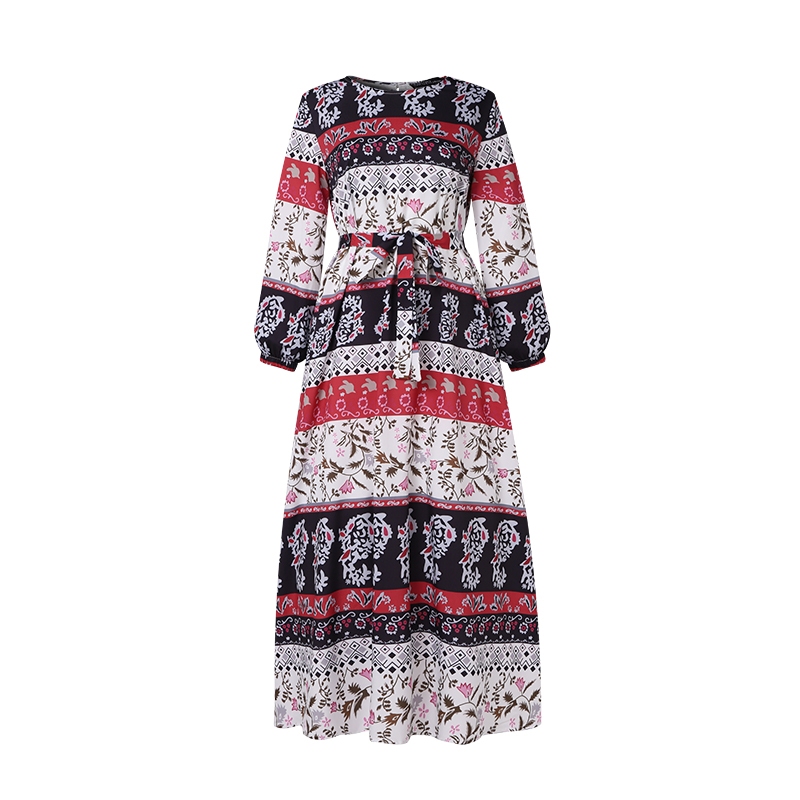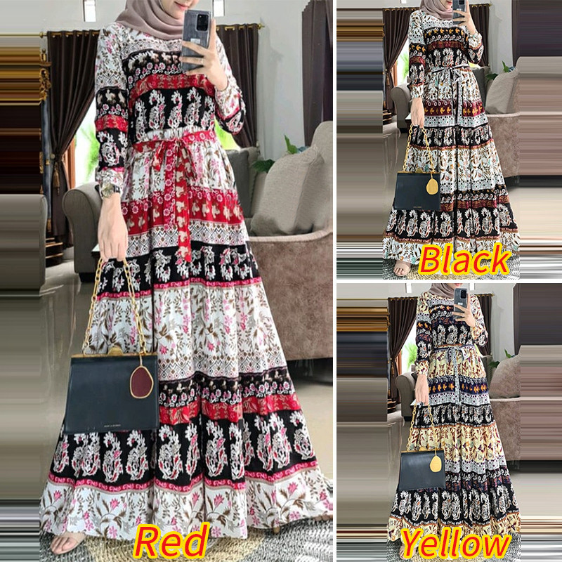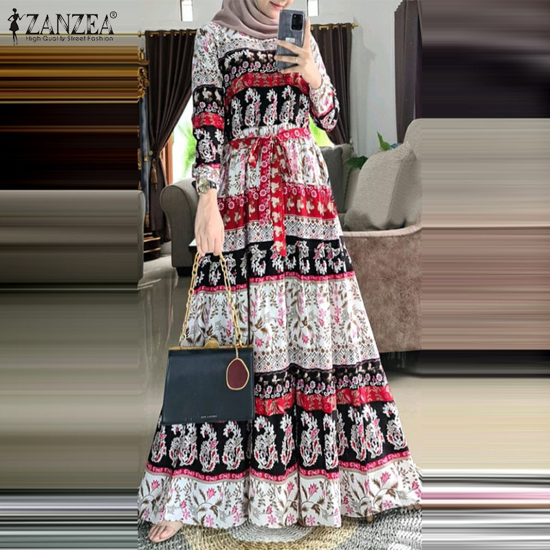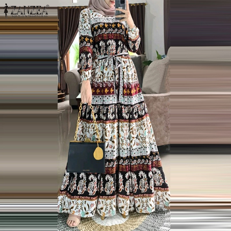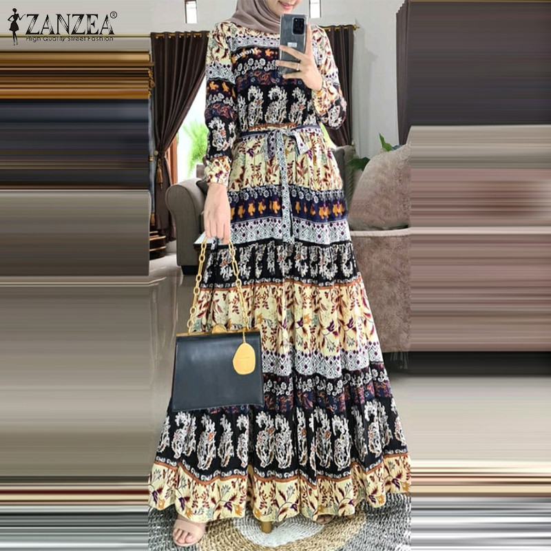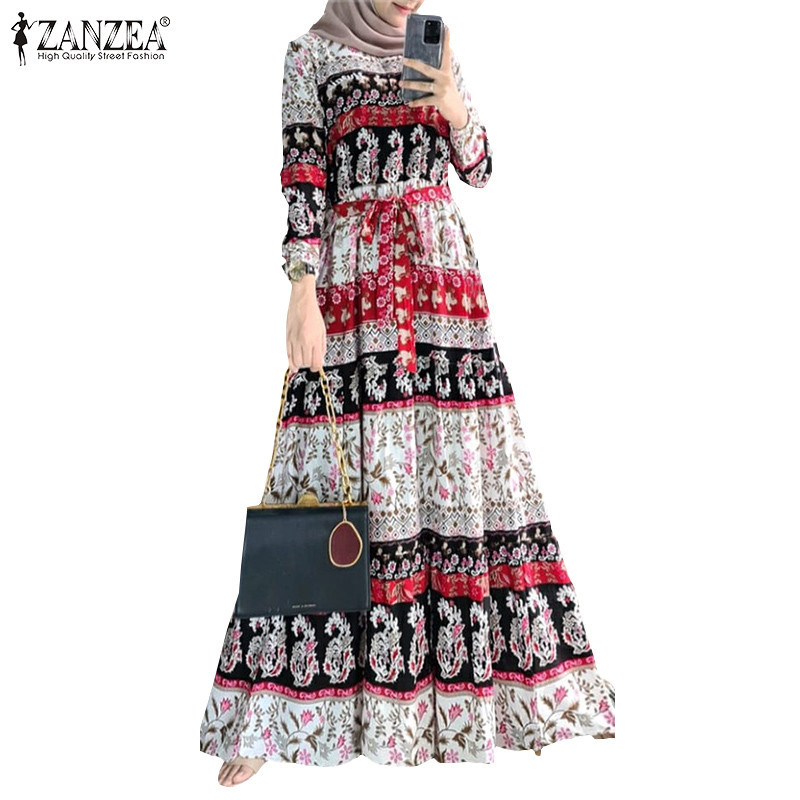 Zanzea ผู้หญิงมุสลิมคอกลมสง่างามชาติพันธุ์พิมพ์ Maxi โบฮีเมียชุด A-Line