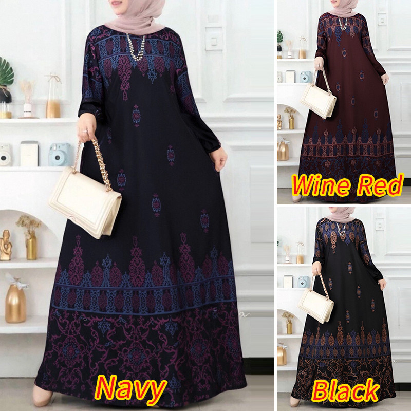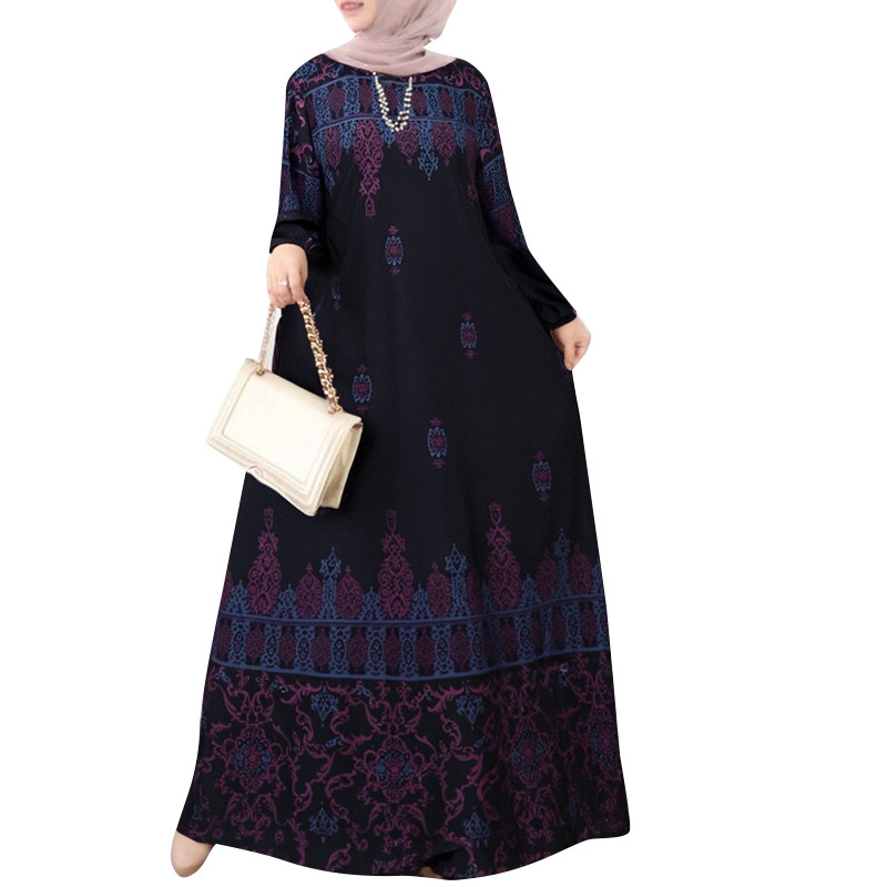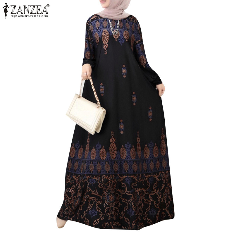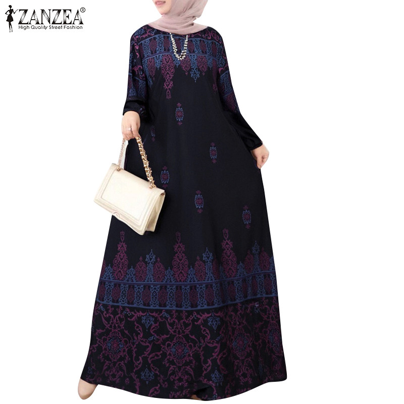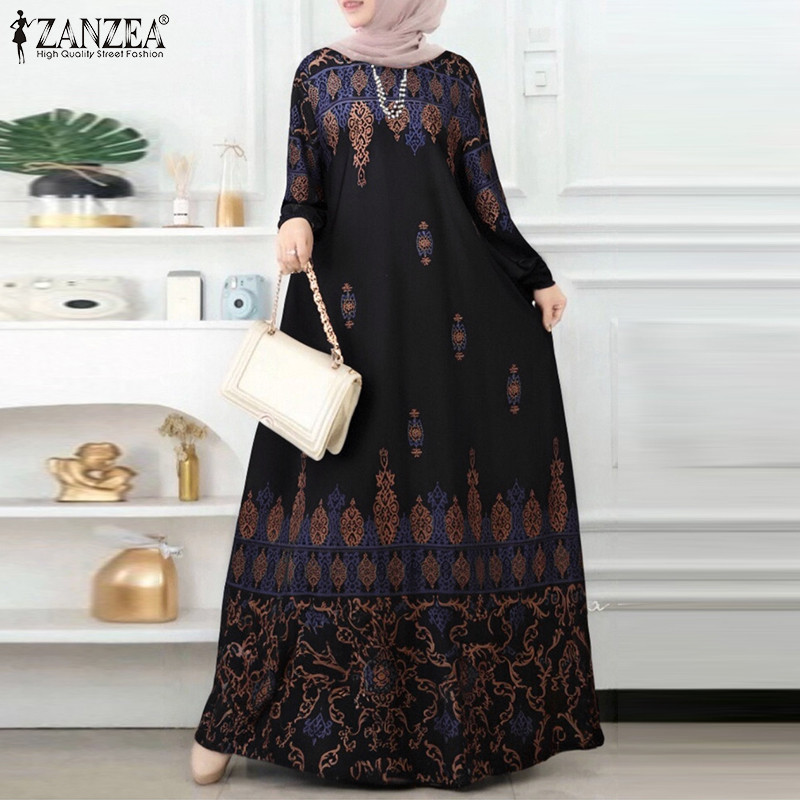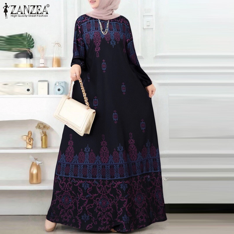 Zanzea ผู ้ หญิงมุสลิม O-คอพิมพ ์ ปุ ่ มข ้ อเท ้ ายาวแขนยาวชุดลําลอง