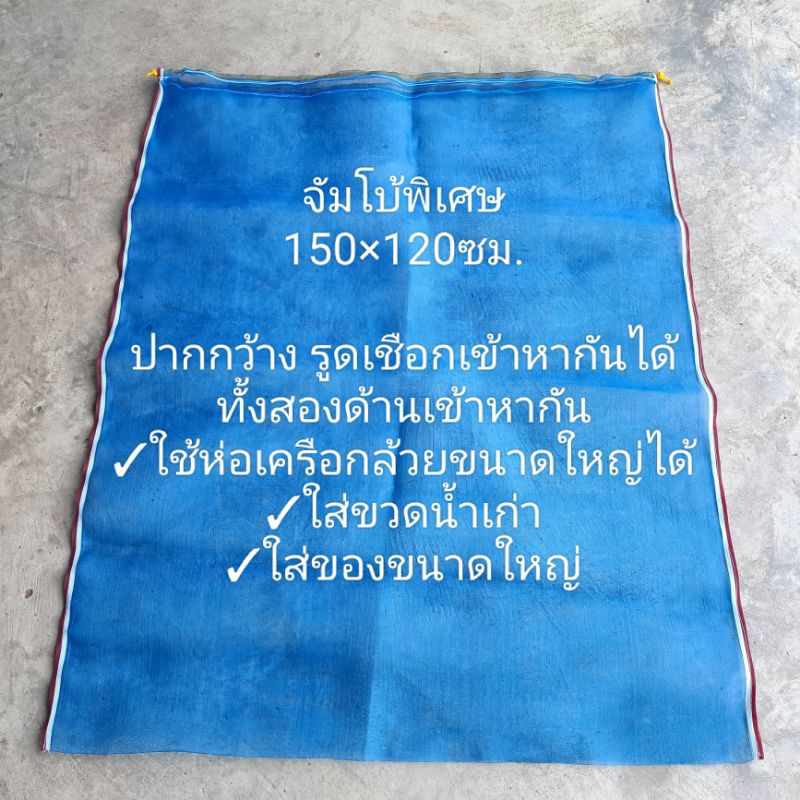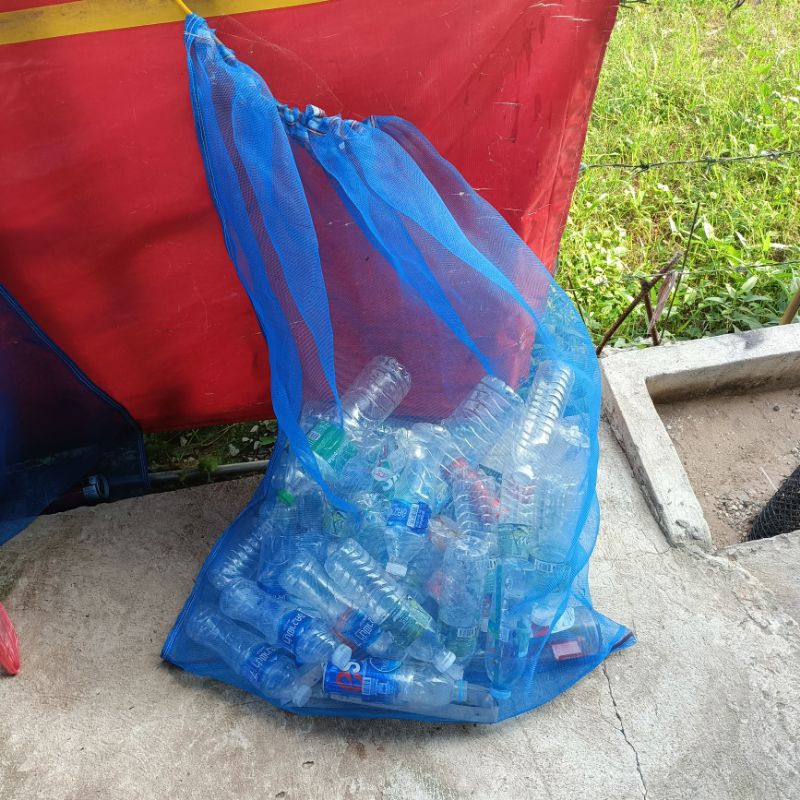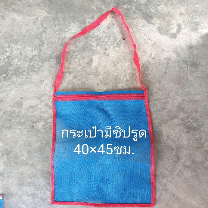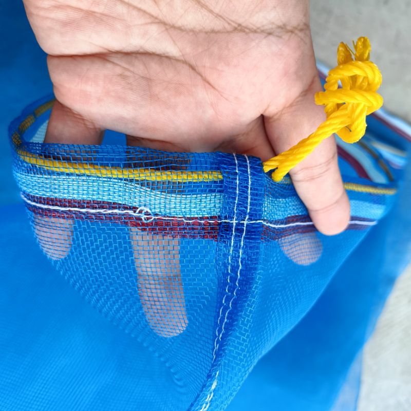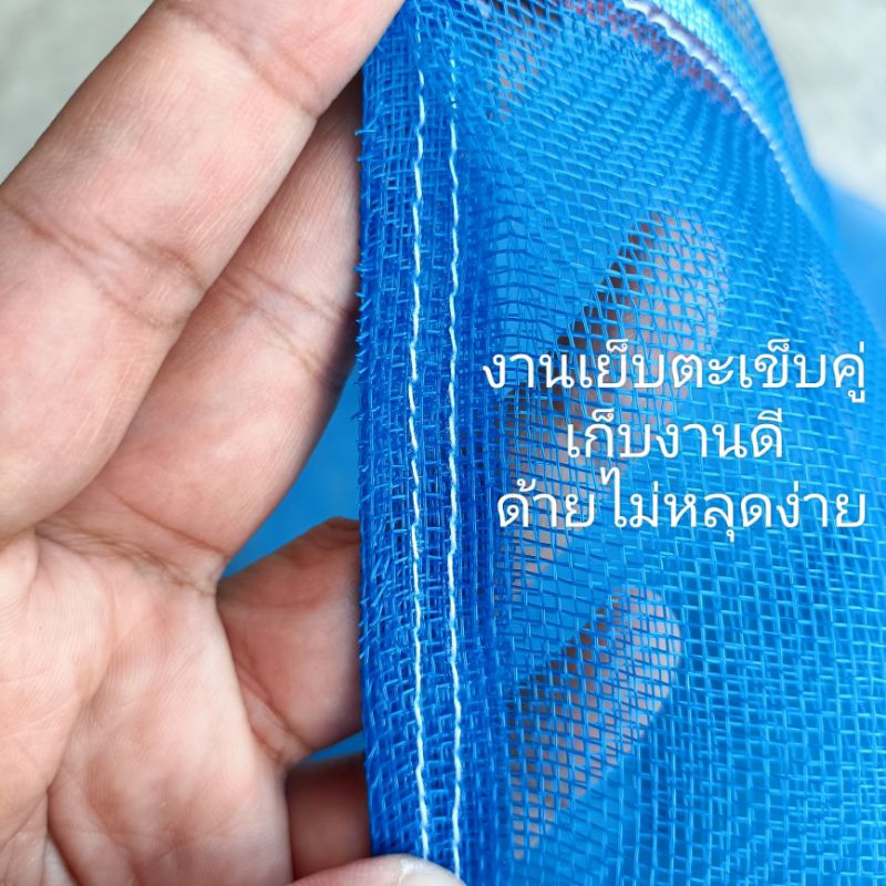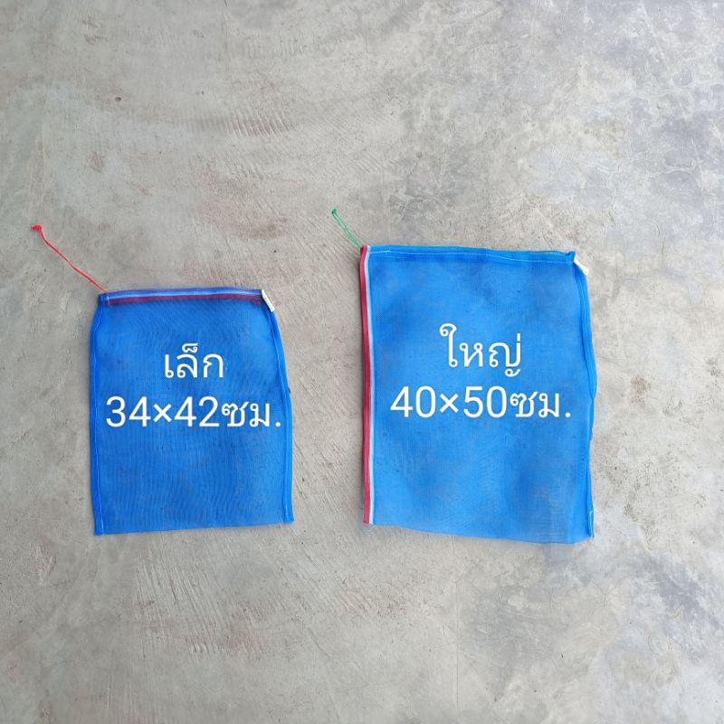 ถุงตาข่ายไนล่อนฟ้า (ใช้ห่อผลไม้กันแมลง ใส่ขวด ใส่ของ ใส่ปลา ใส่กบ เลี้ยงหอย มีเชือกรูดปากถุง)