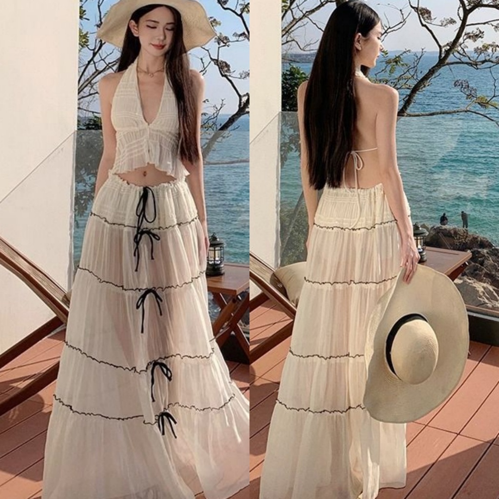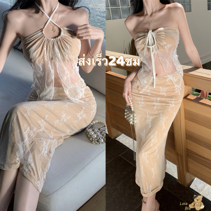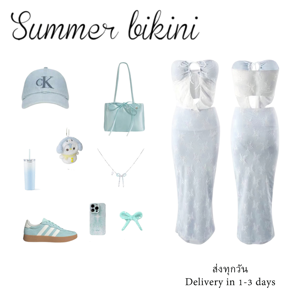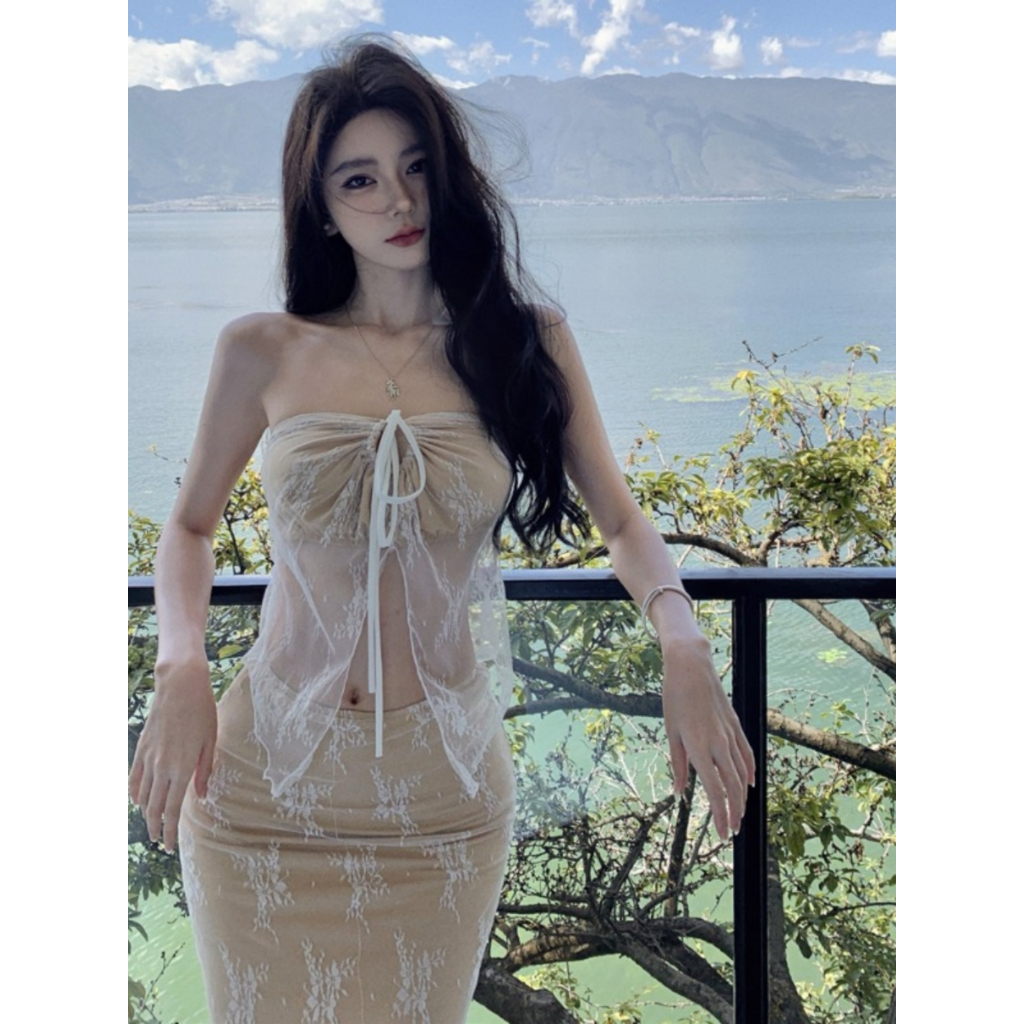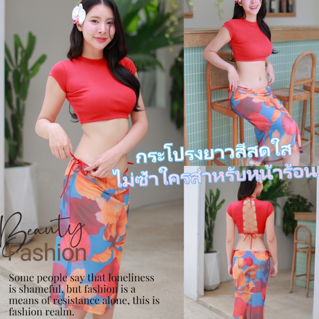 ? ส่งไวจากไทย ?ชุดว่ายน้ำผู้หญิง ชุดเซ็ท 2 ชิ้น เสื้อท็อปส์/เกาะอก แต่งลูกไม้ + กระโปรงยาว ชุดไปทะเล