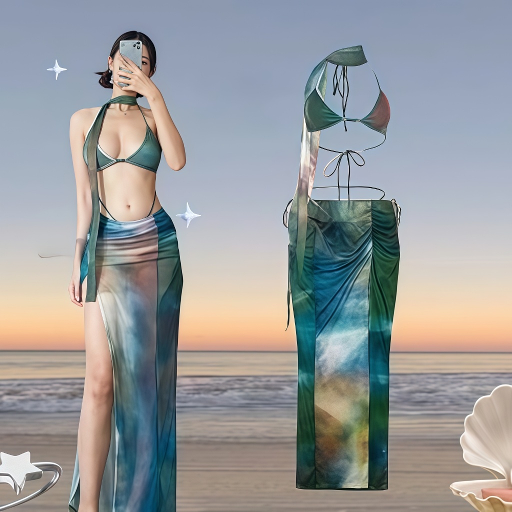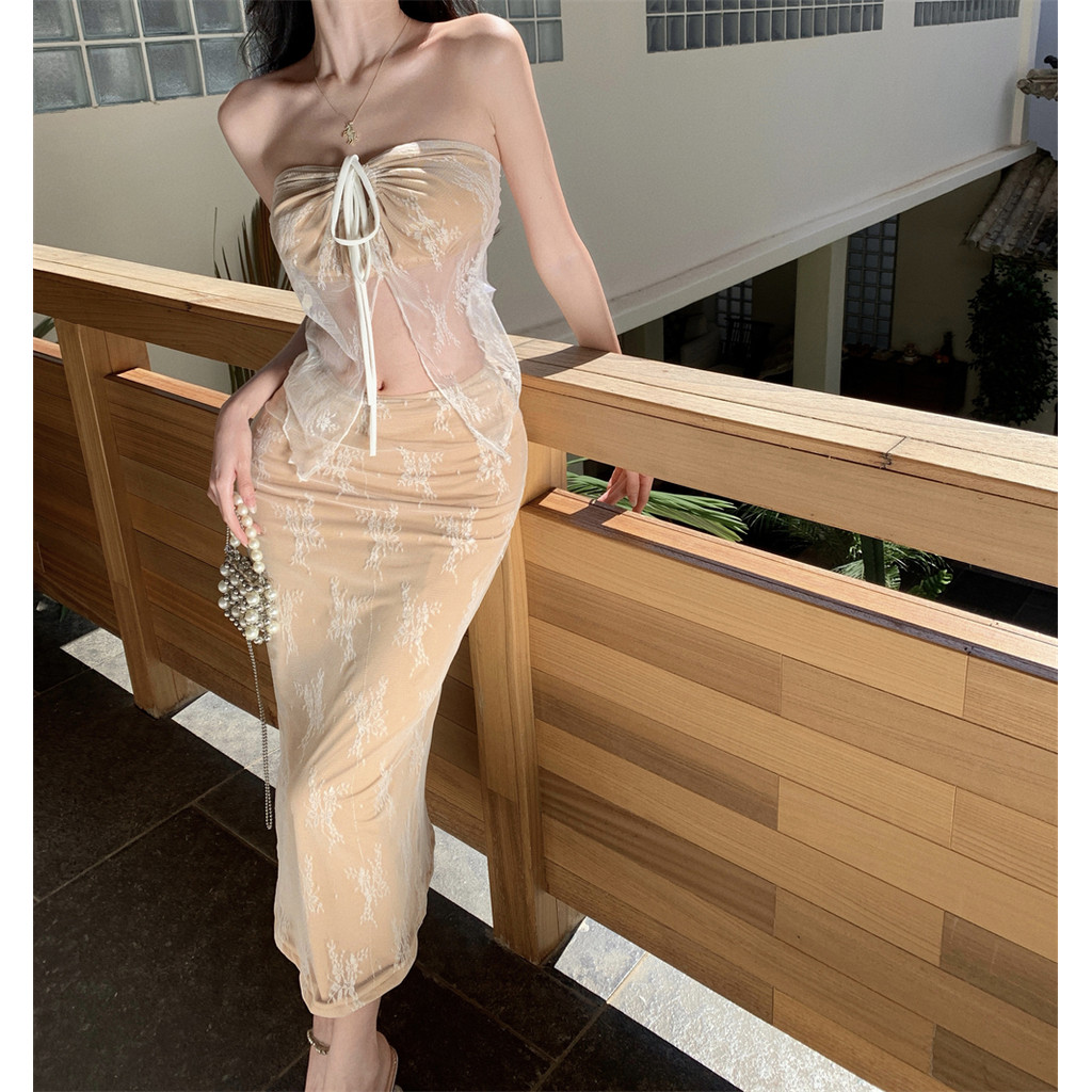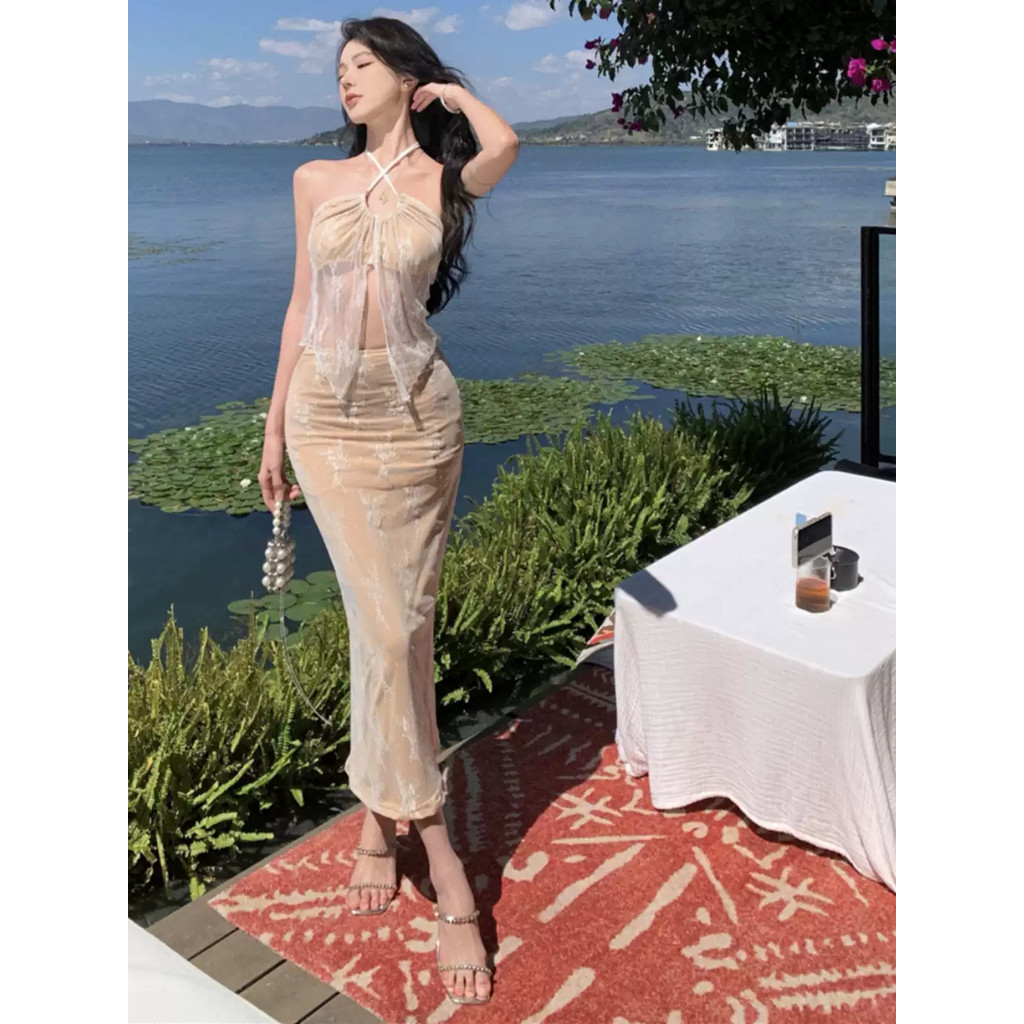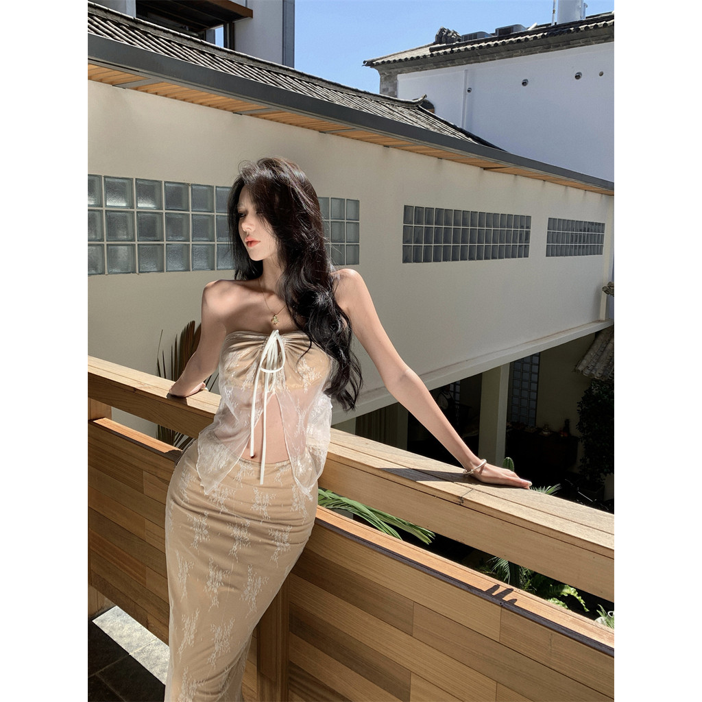 ? ส่งไวจากไทย ?ชุดว่ายน้ำผู้หญิง ชุดเซ็ท 2 ชิ้น เสื้อท็อปส์/เกาะอก แต่งลูกไม้ + กระโปรงยาว ชุดไปทะเล