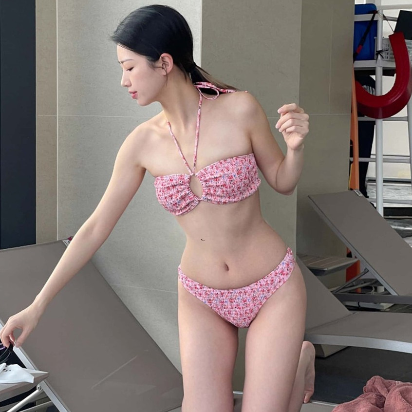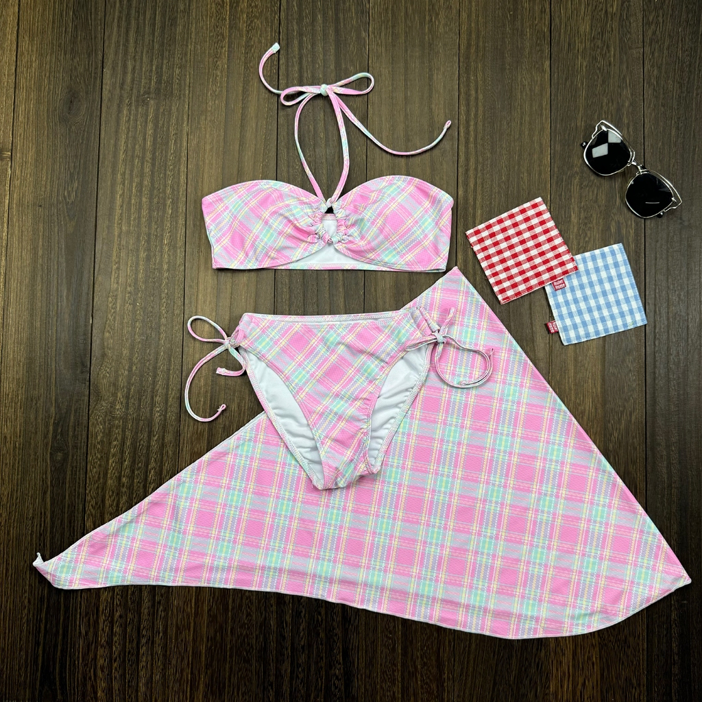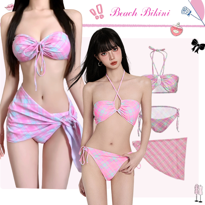 ?Beach Bikini?Sexy bikini บิกินี่ 3 ชิ้น ลายสก็อตสีชมพู สไตล์เกาหลี ใหม่ เหมาะกับการไปชายหาด