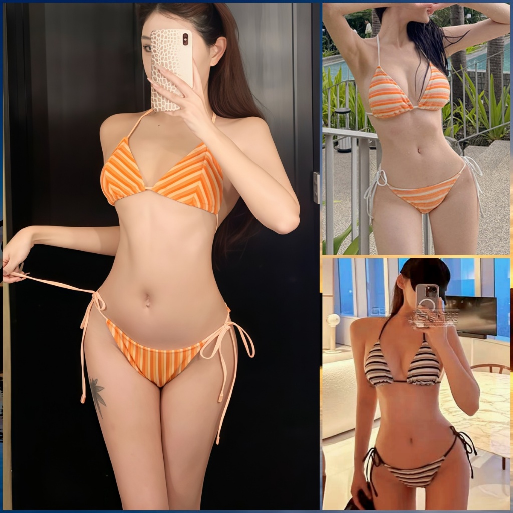 ?Basic swimsuit?ชุดว่ายน้ำหญิง ชุดว่ายน้ำทูพีซ bikini ลายทาง ดีไซน์เชือกผูก หลายสี ส่งจากไทย
