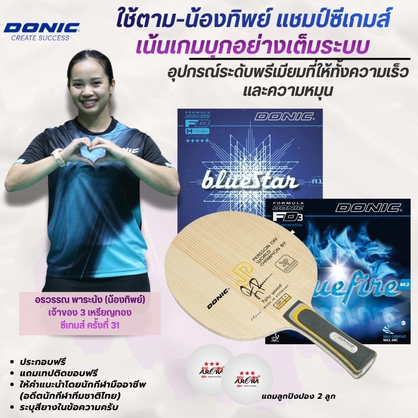 [ ชุดที่น้องทิพย์ใช้จริง ] ไม้ปิงปองประกอบ DONIC PERSSON OFF+ WORLD CHAMPION 89 + BLUESTAR A1 + BLUEFIRE M2
