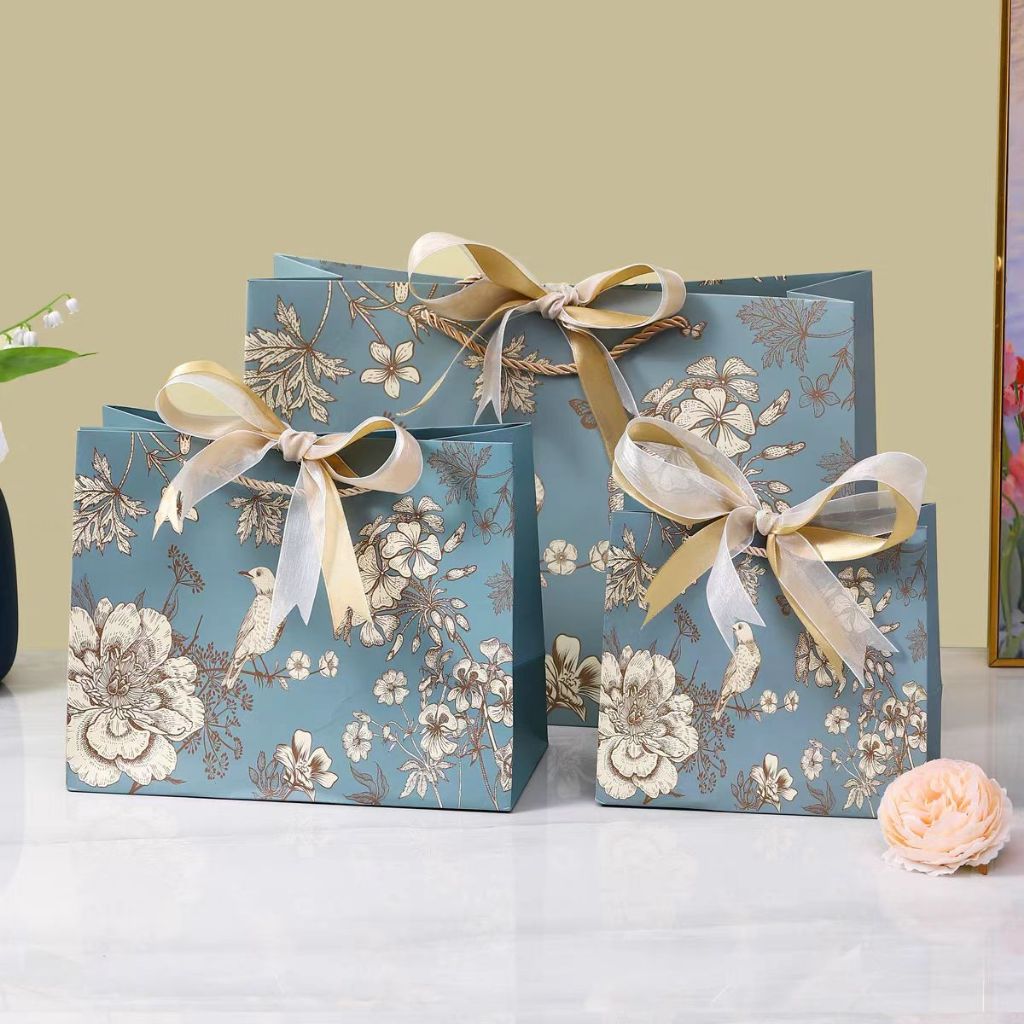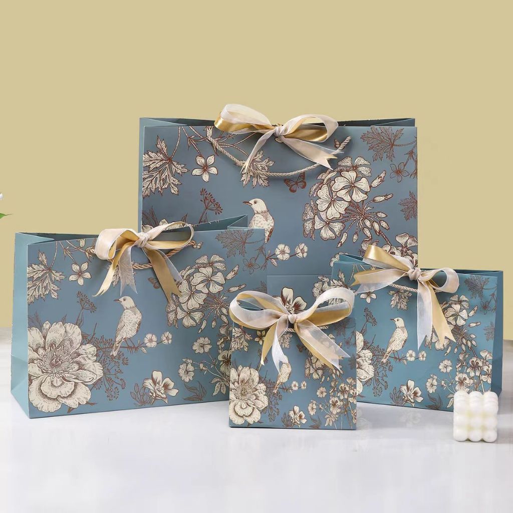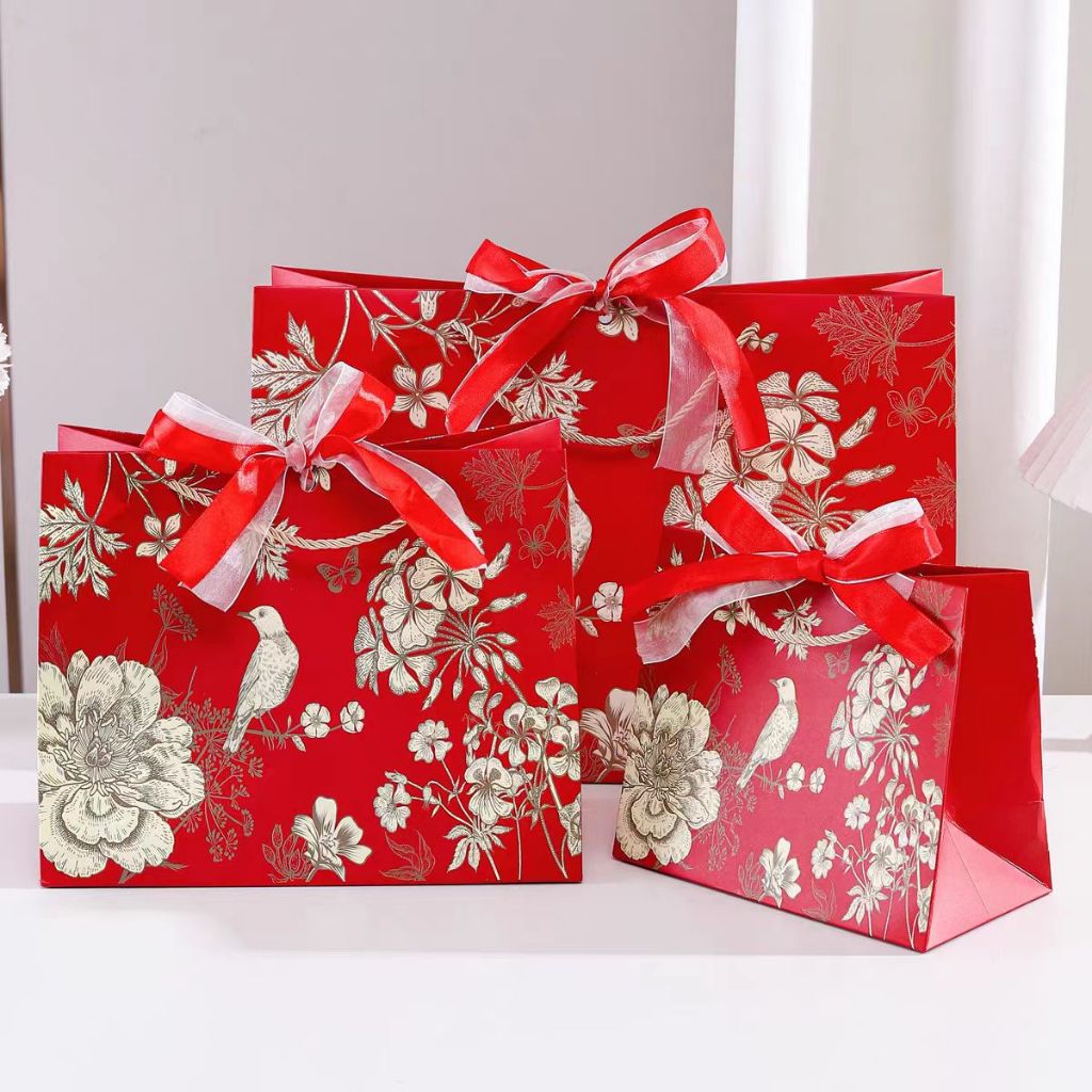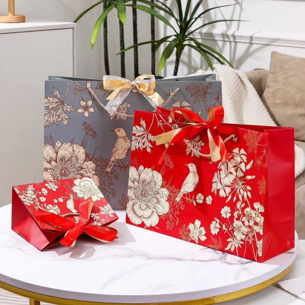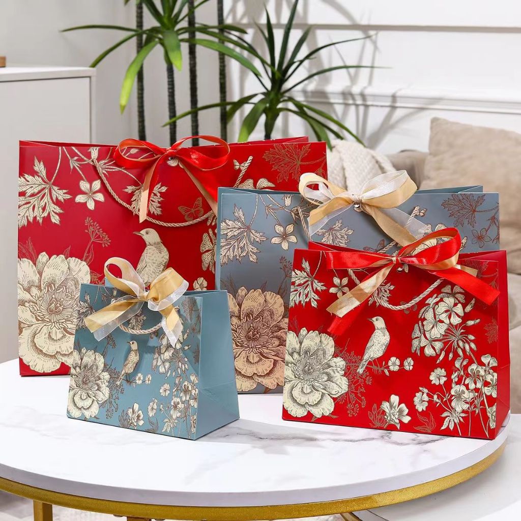 ?? PK ??ถุงกระดาษ พร้อมโบว์ 2 เส้น ถุงพิมพ์ลายนกดอกไม้ มีหลายขนาด ใส่ของขวัญ รับไหว้ ตรุษจีน งานแต่ง
