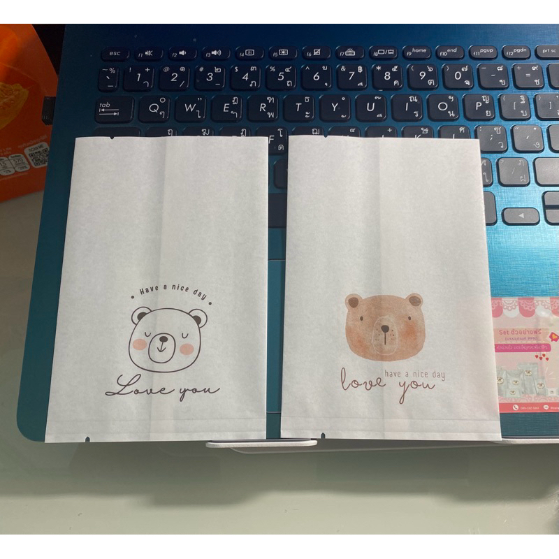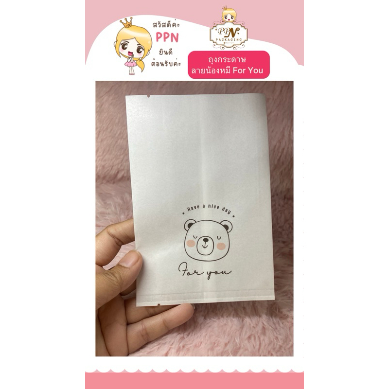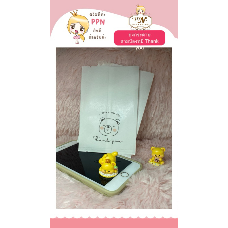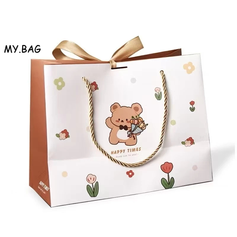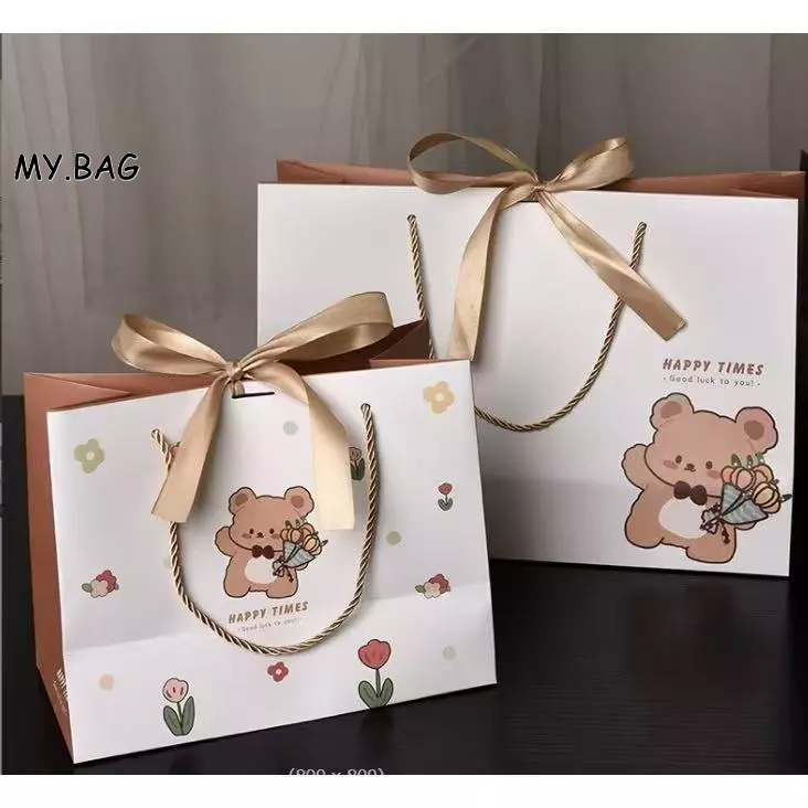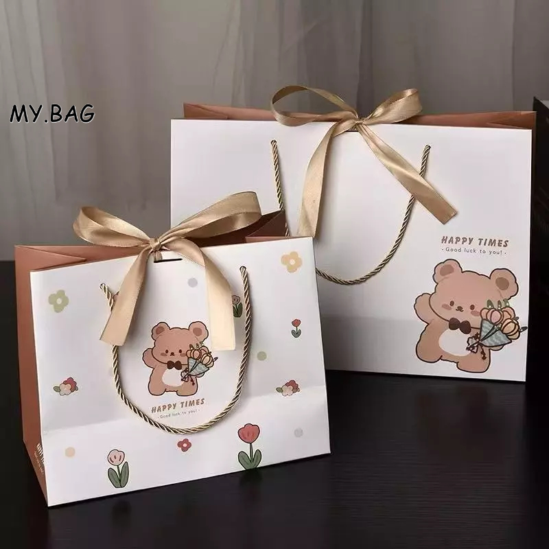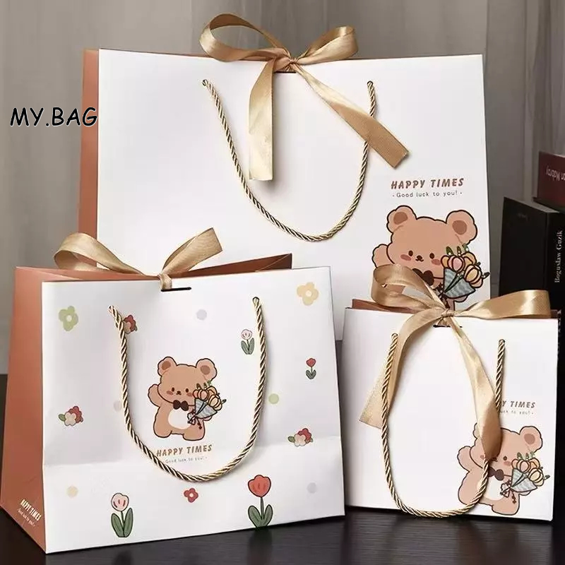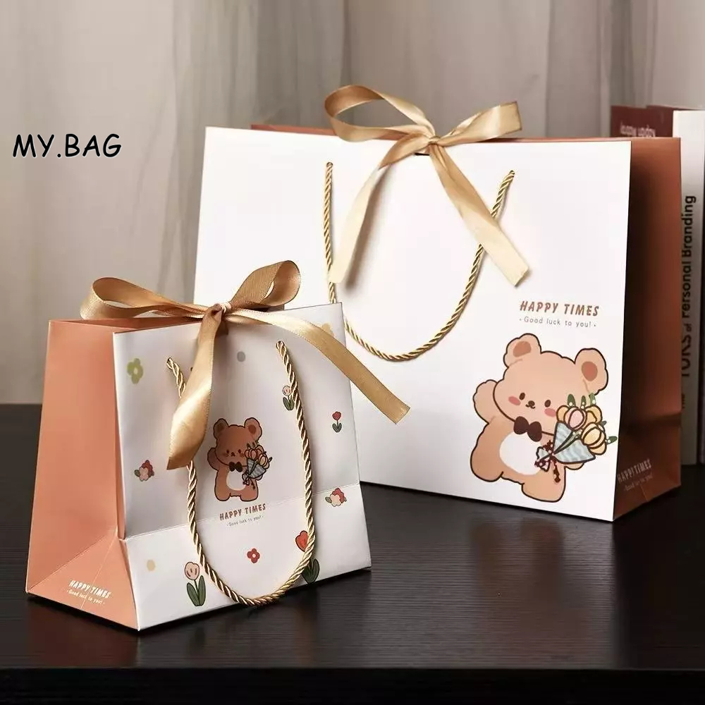 ??BAG?? ถุงกระดาษ หูหิ้ว ถุงของขวัญ น่ารักๆ สไตล์เรียบหรู ลายหมี พร้อมโบว์สีทอง ลาย HAPPY TIMES