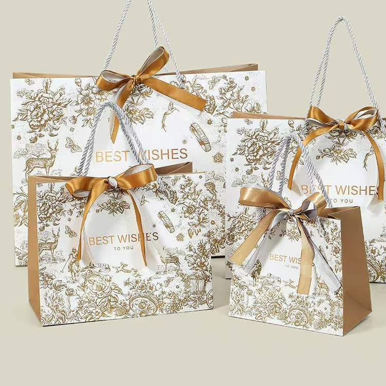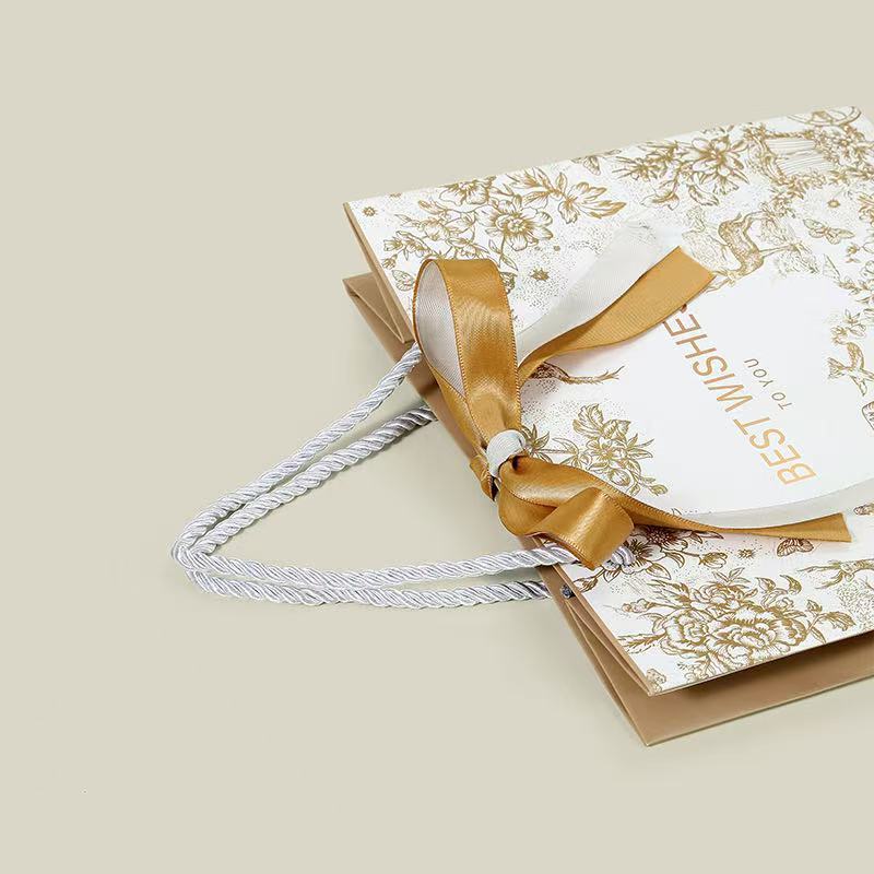 ? ถุงกระดาษของขวัญ รุ่นผูกโบว์ ริบบิ้น สีทอง ลายเส้นดอกไม้ หรูหรา พรีเมี่ยม พร้อมส่ง