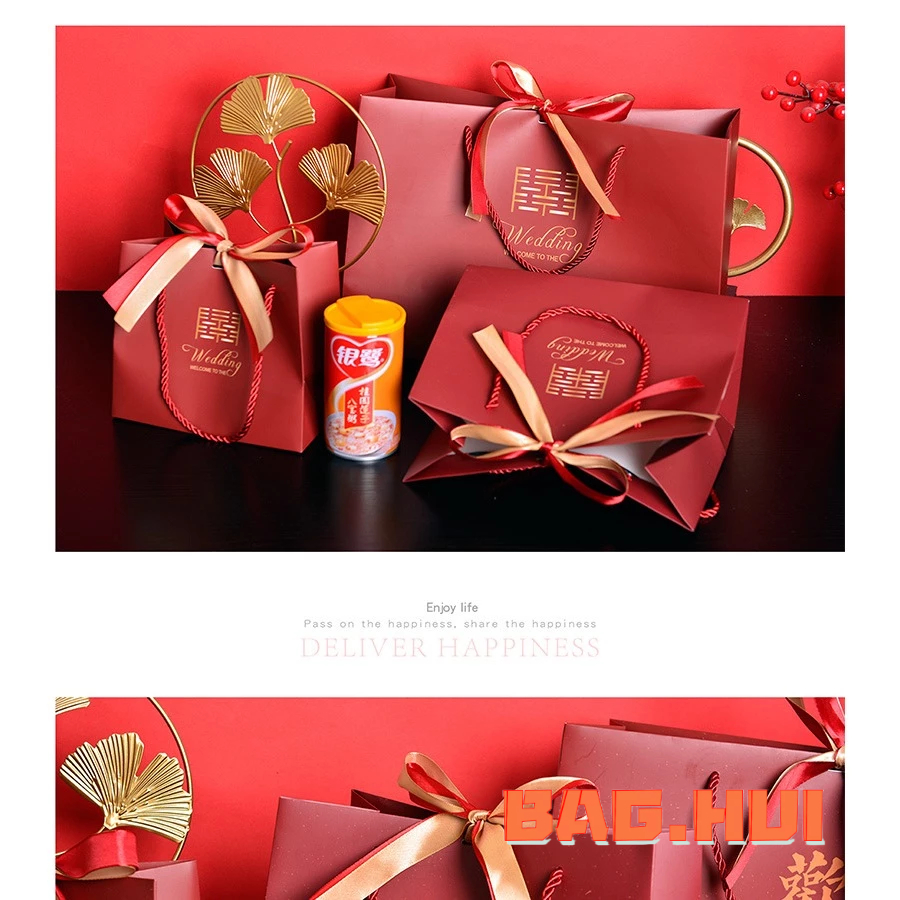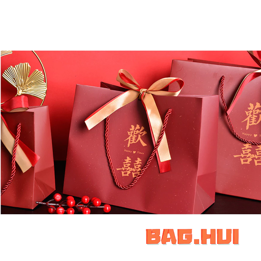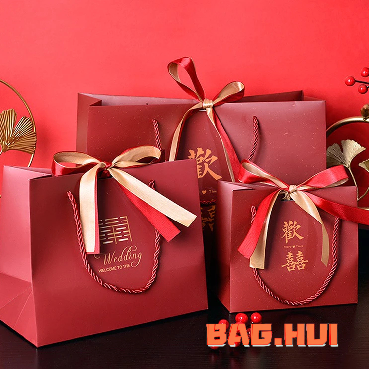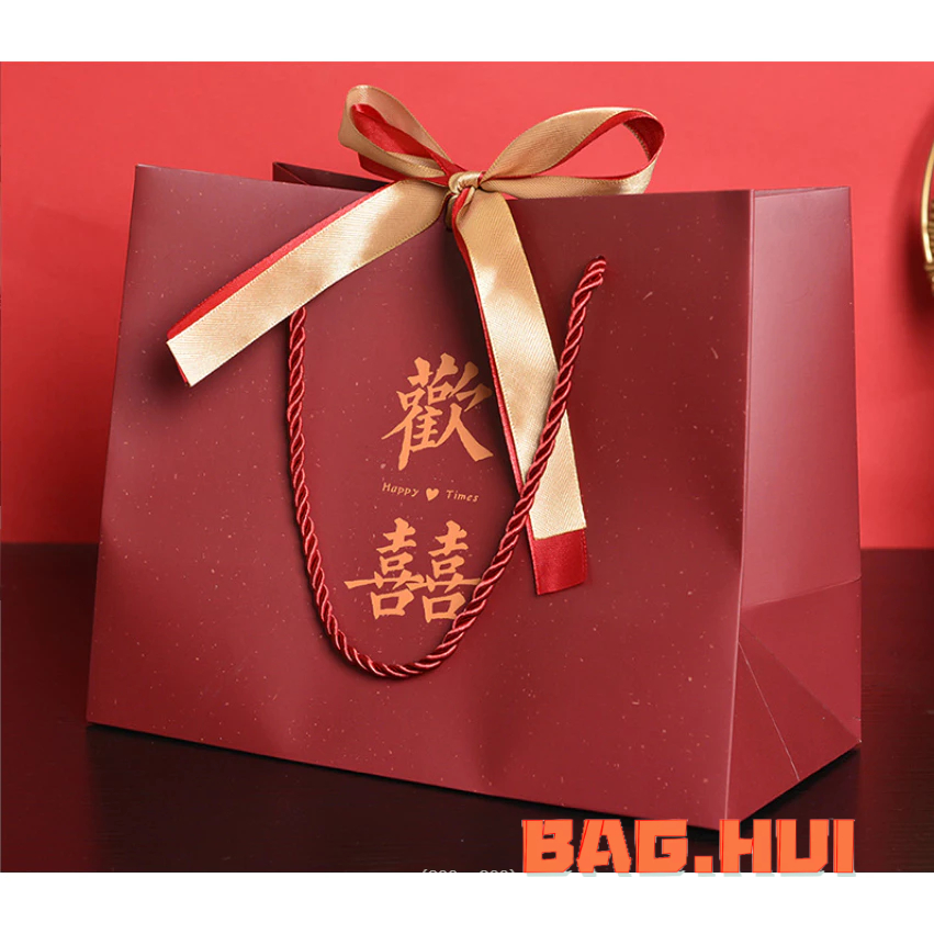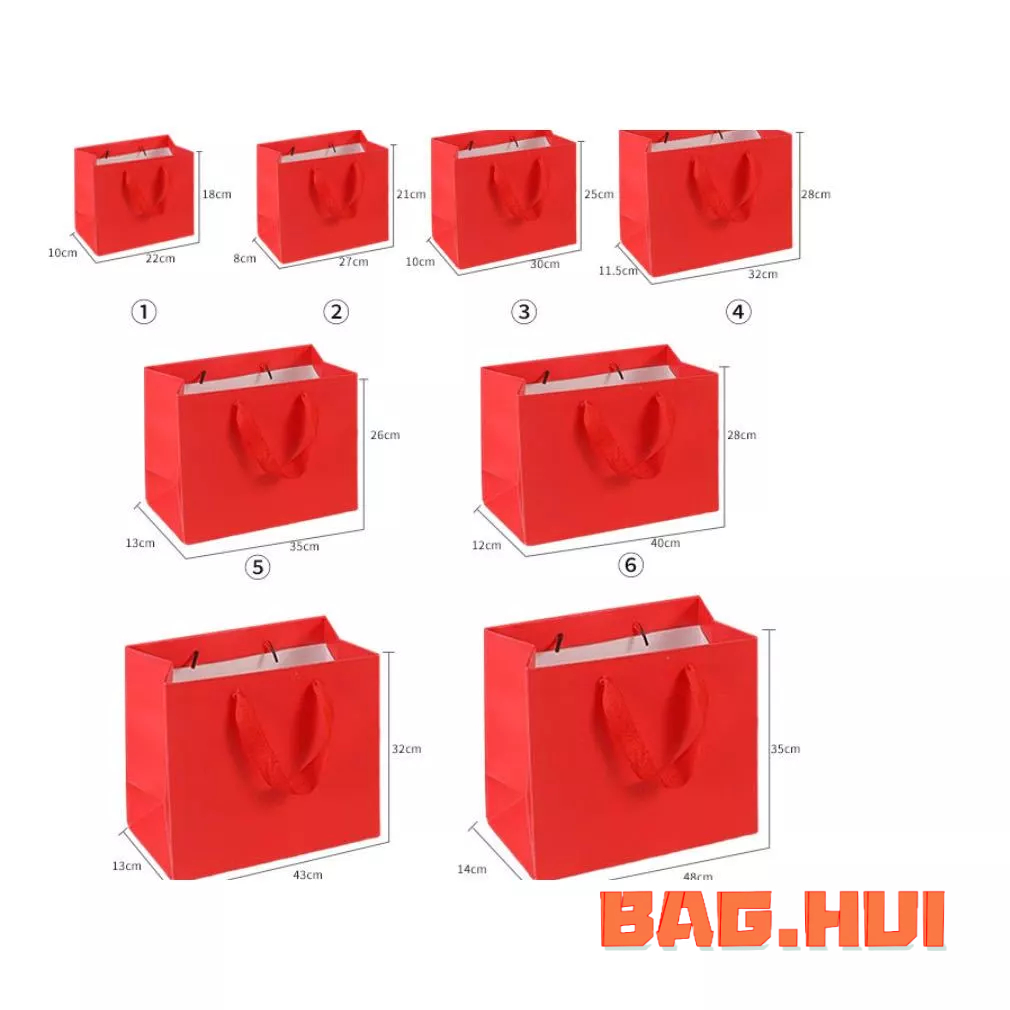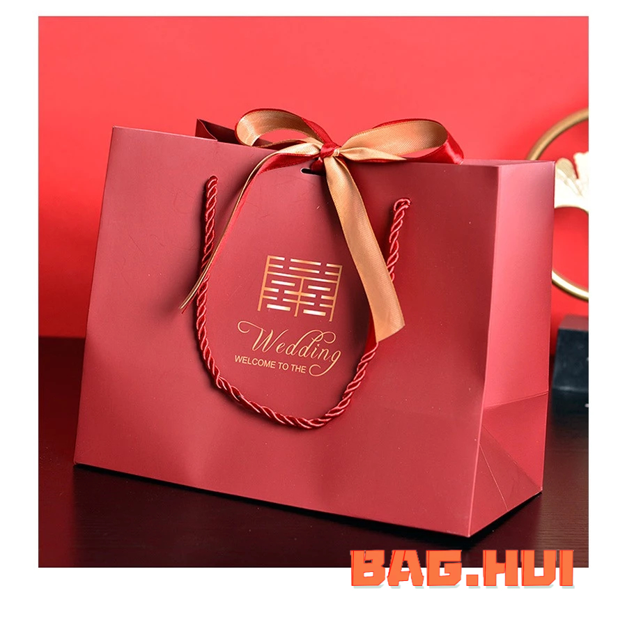 ??BH ถุงกระดาษ +ริบบิ้นโบว์ สีแดง ใส่ของขวัญแต่งงาน wedding ใส่ของใช้ทั่วไป หูหิ้วเชือก กระดาษหนา พร้อมส่ง