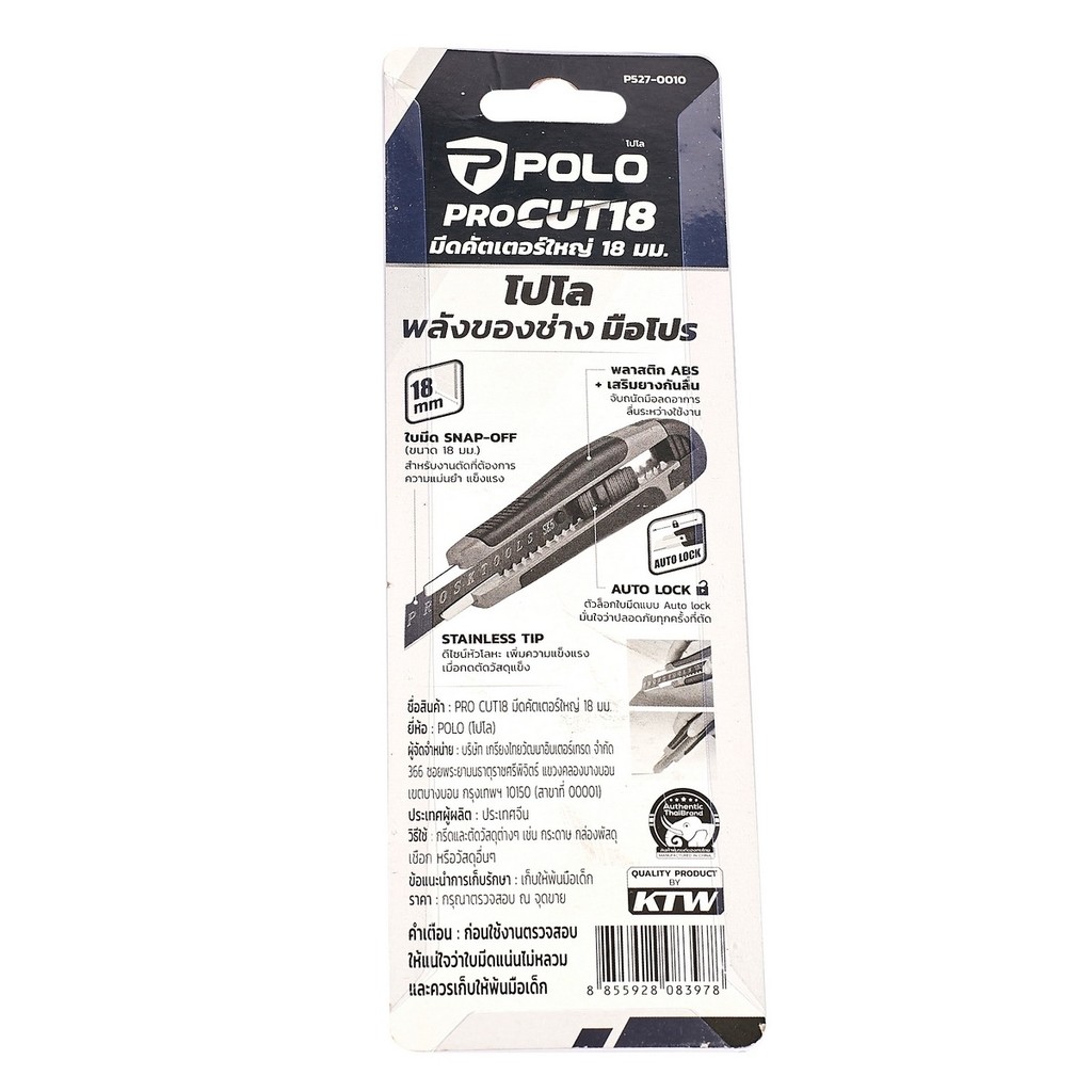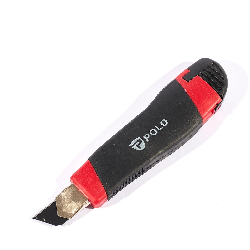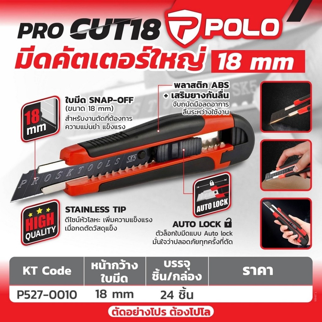 มีดคัตเตอร์ใหญ่ 18 มม. POLO รุ่น PRO CUT18 โครงสร้างพลาสติก ABS + เสริมยาง boonus