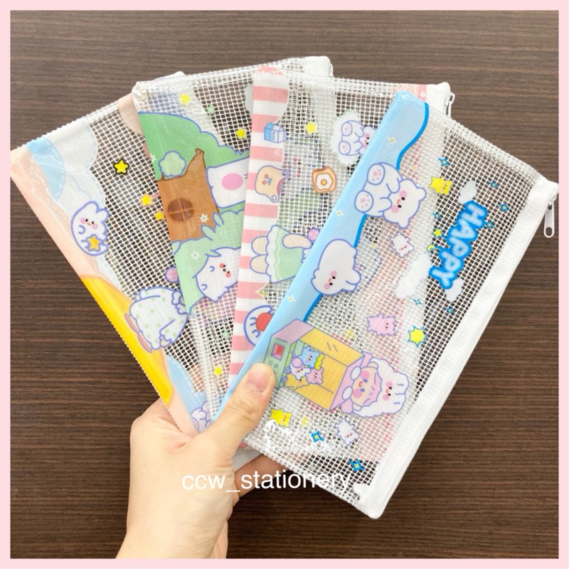 ซองซิปตาข่ายลายการ์ตูน สำหรับใส่เครื่องเขียน ขนาด A6 (20*10cm) ***สุ่มลาย***