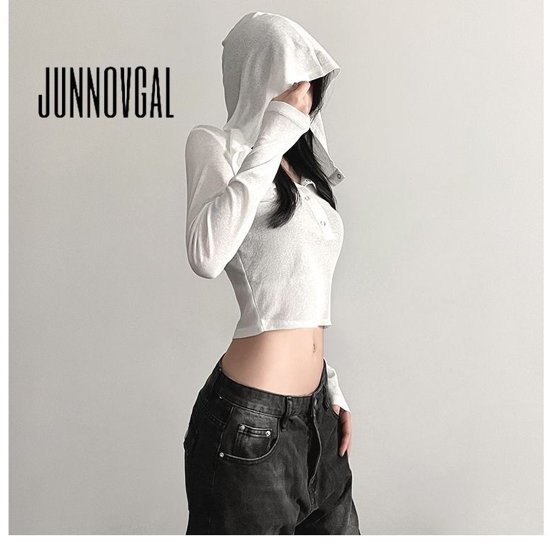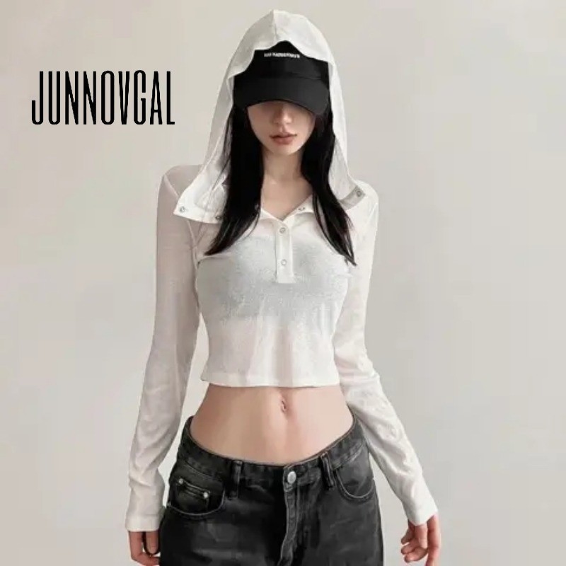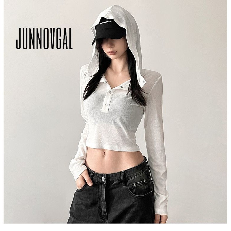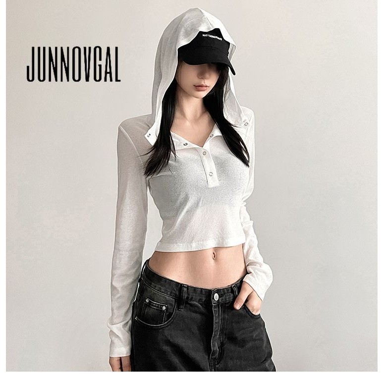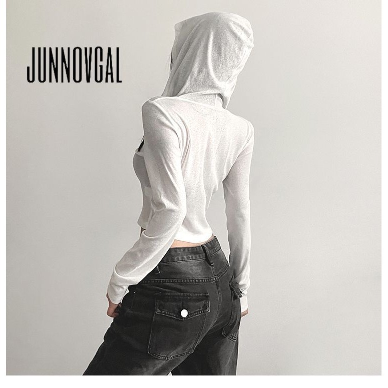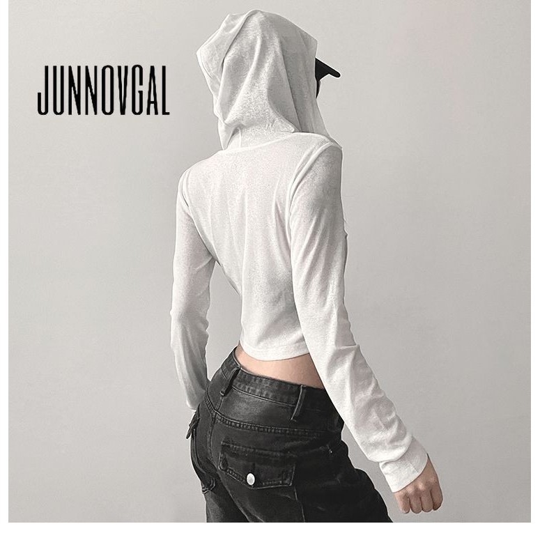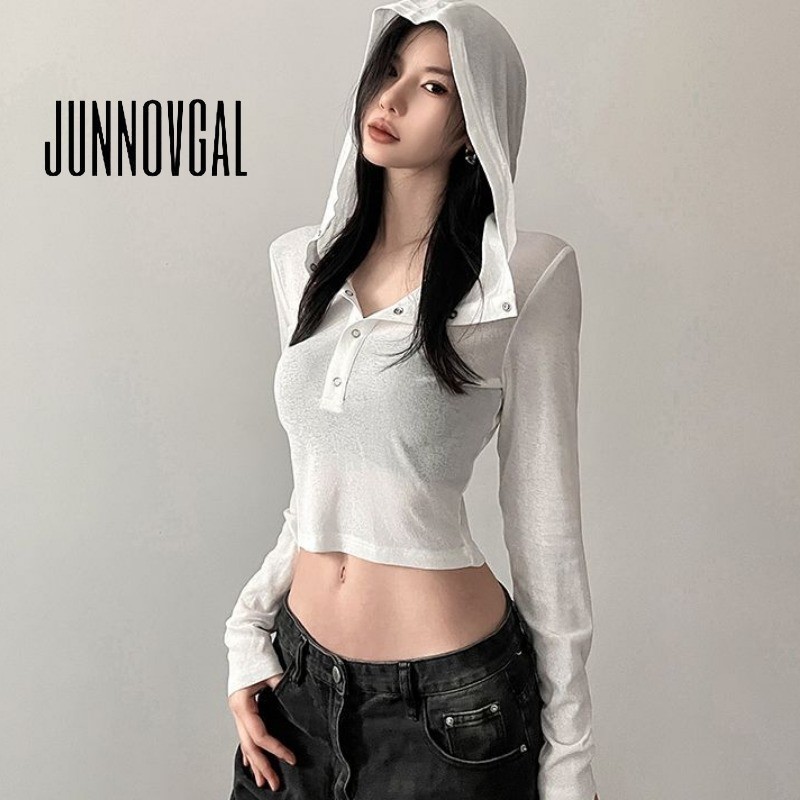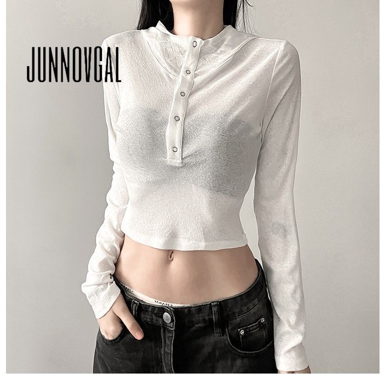 JUNNOVGAL เสื้อฮู้ดผู้หญิงคอปกโปร่งแสงสีทึบลําลองแขนยาวสไตล์ใหม่