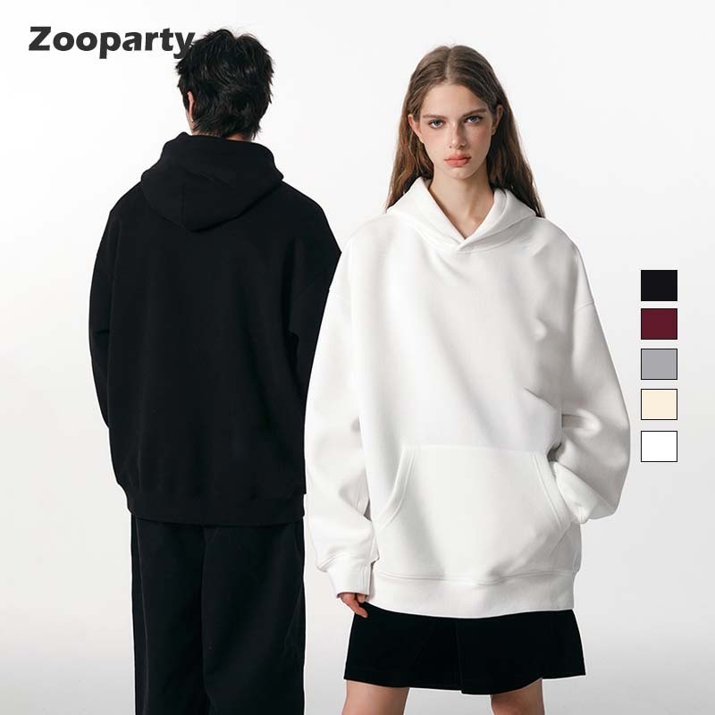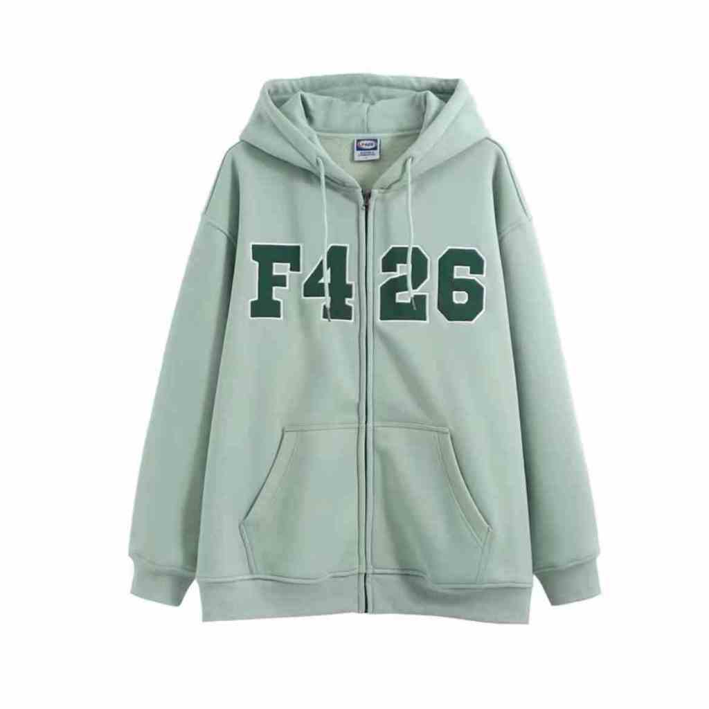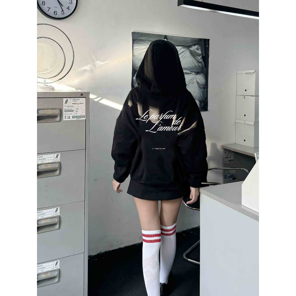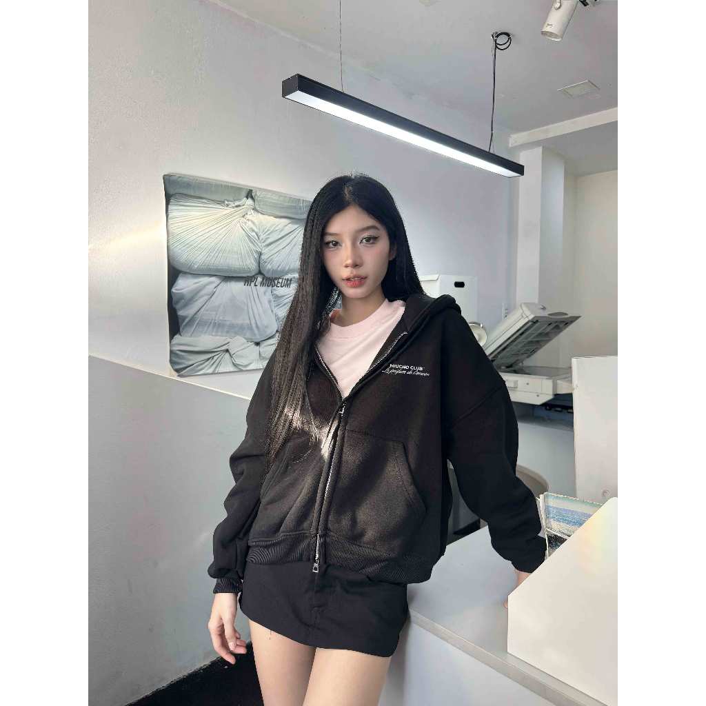 MIUCHO 2473 Boxy Zip Hoodie Jacket คุณภาพสูงหนา Basic Double หนังขนแกะ Easy to Coordinate พิมพ์ Typography