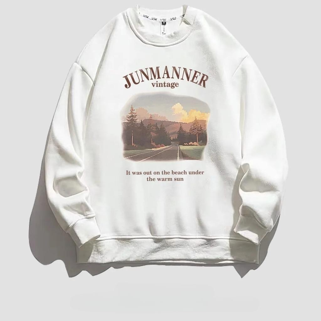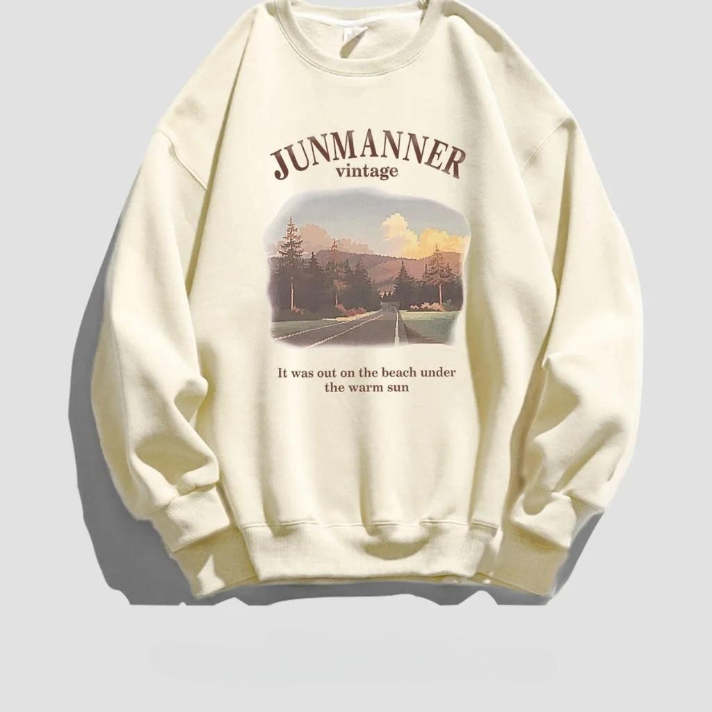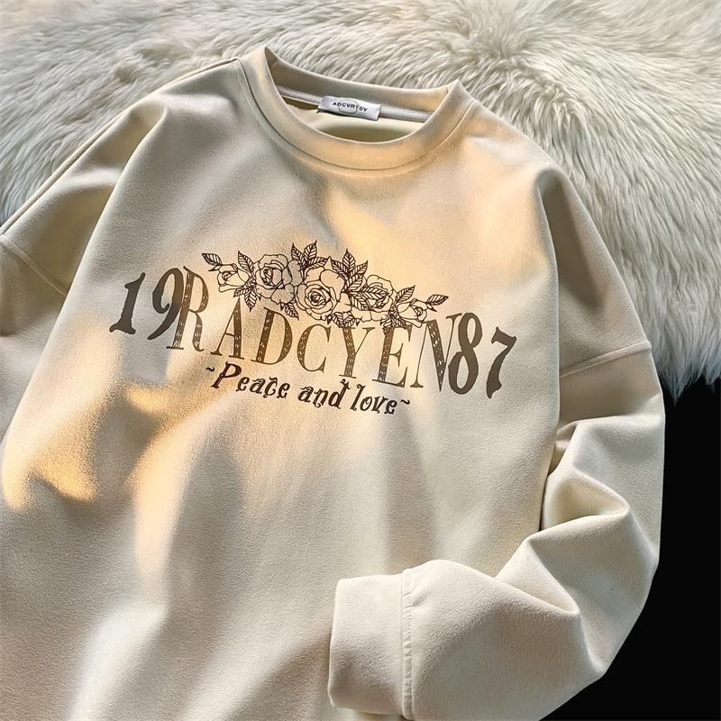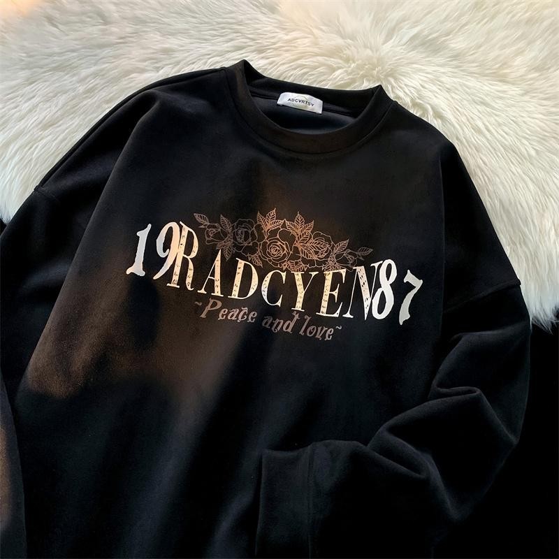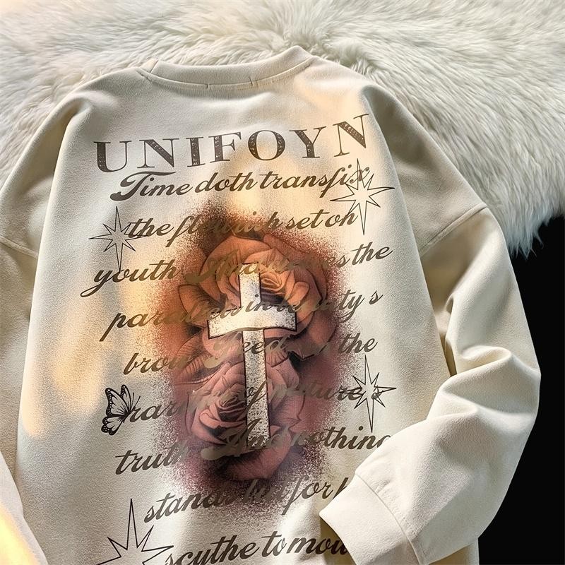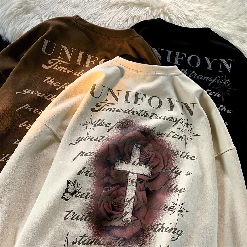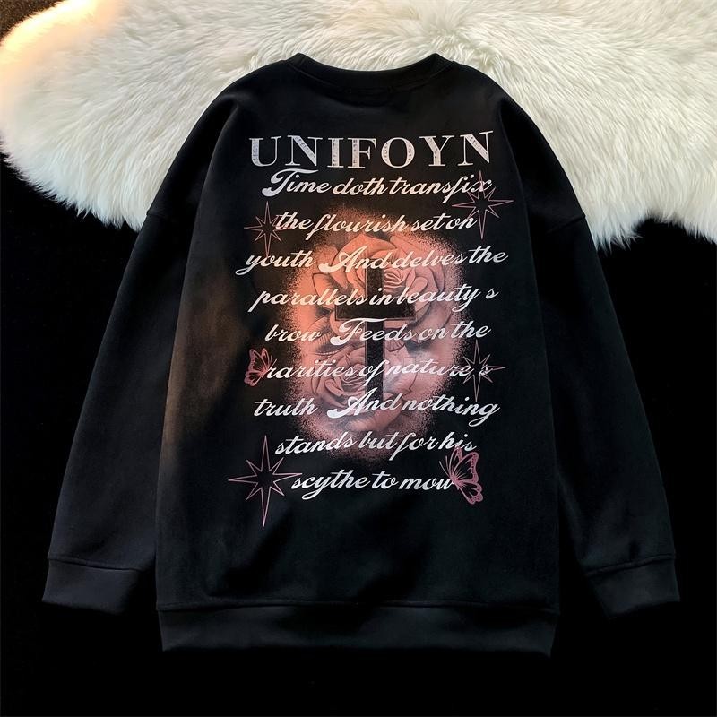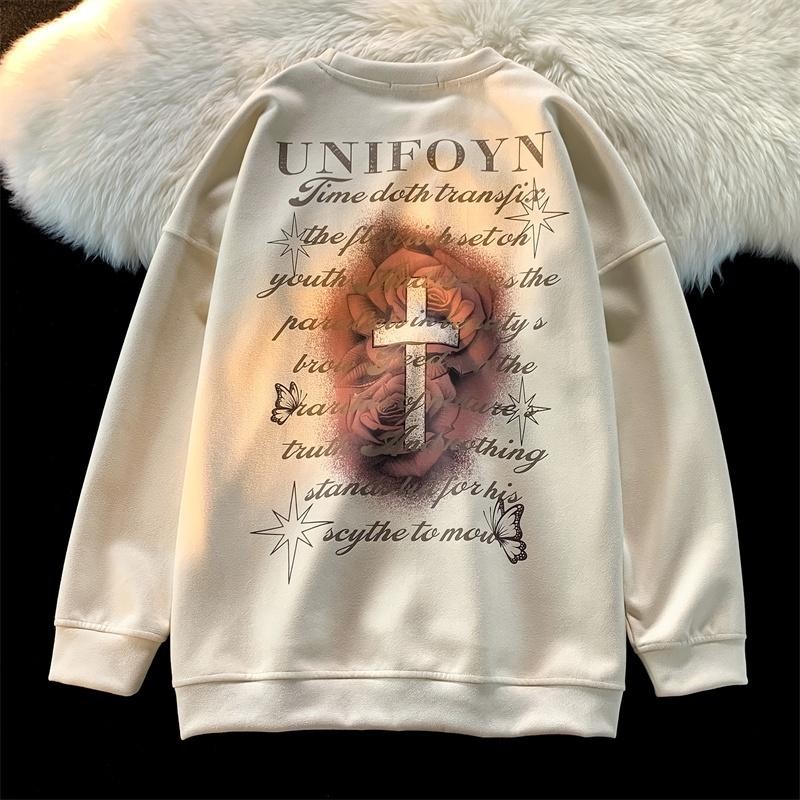 เสื้อกันหนาว แขนยาว คอกลม ทรงหลวม เสื้อกันหนาวโอเวอร์ไซส์ UNIFOYN ลายกางเขน + ดอกกุหลาบ สไตล์กรันจ์เท่ๆ ผ้าฝ้าย 100%