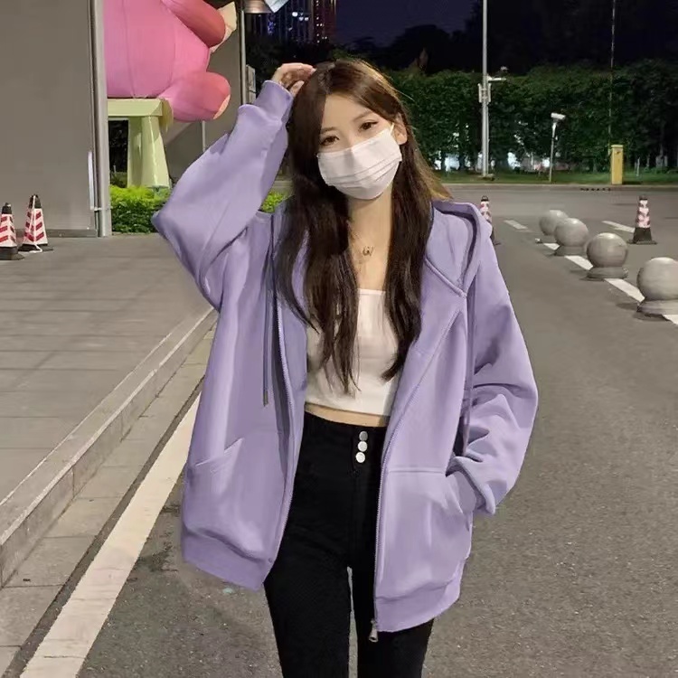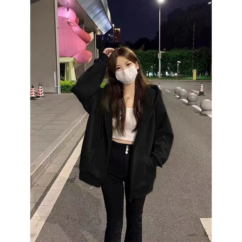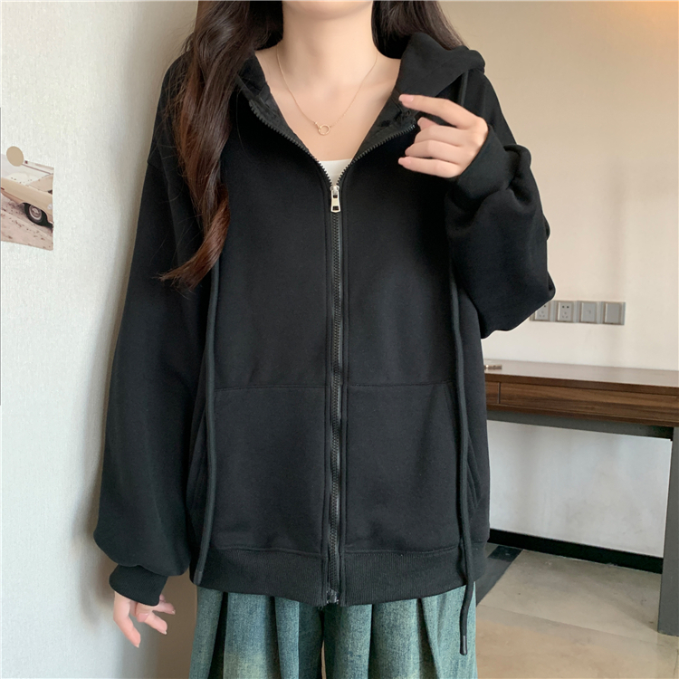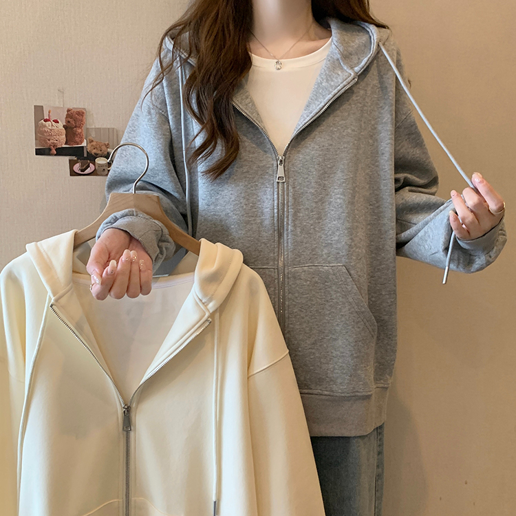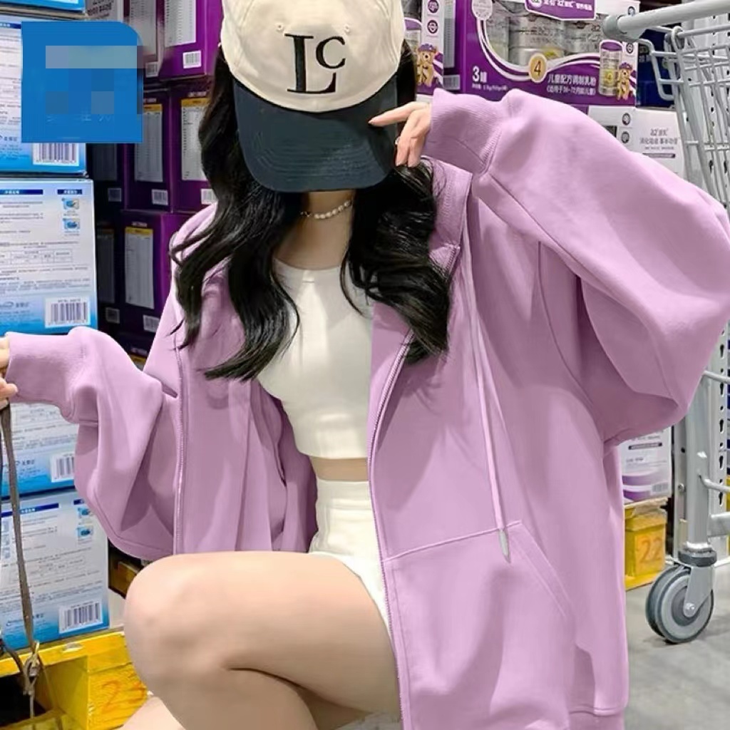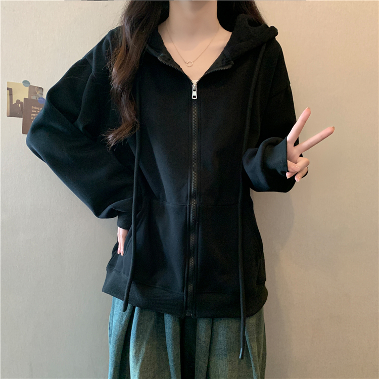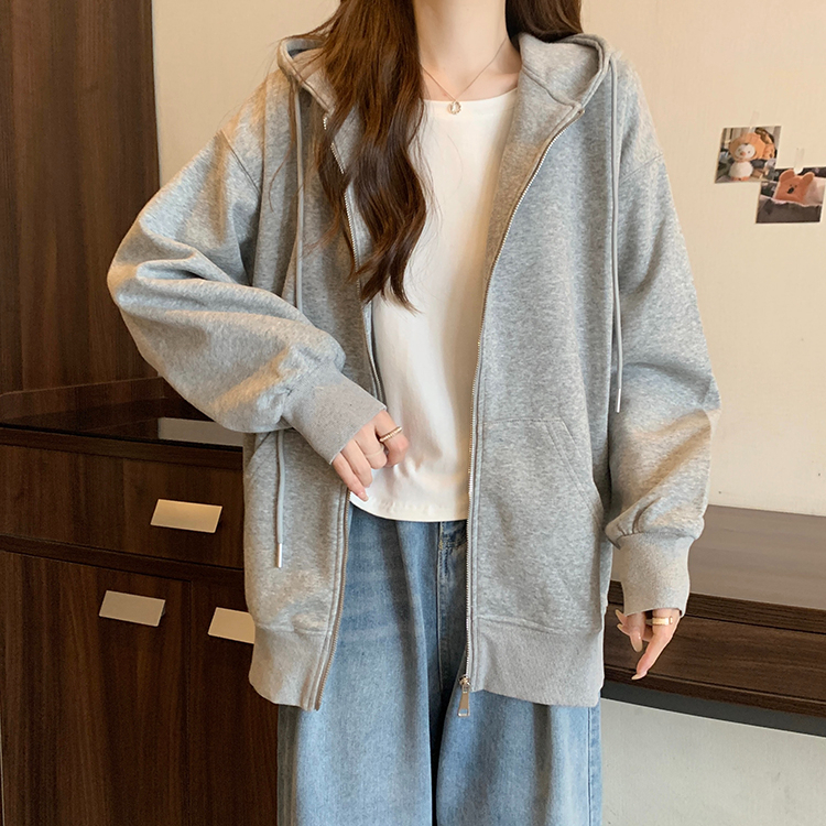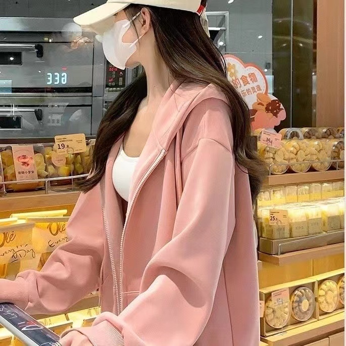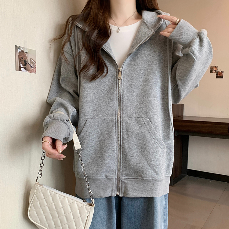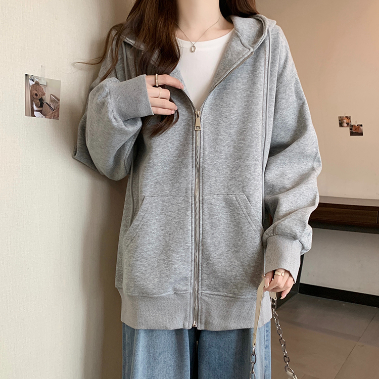 สไตล์เกาหลี สำหรับผู้หญิง M-2XLสีทึบ เสื้อฮู้ด แขนยาว ทรงโอเวอร์ไซซ์ คาร์ดิแกนซิปแขนยาว